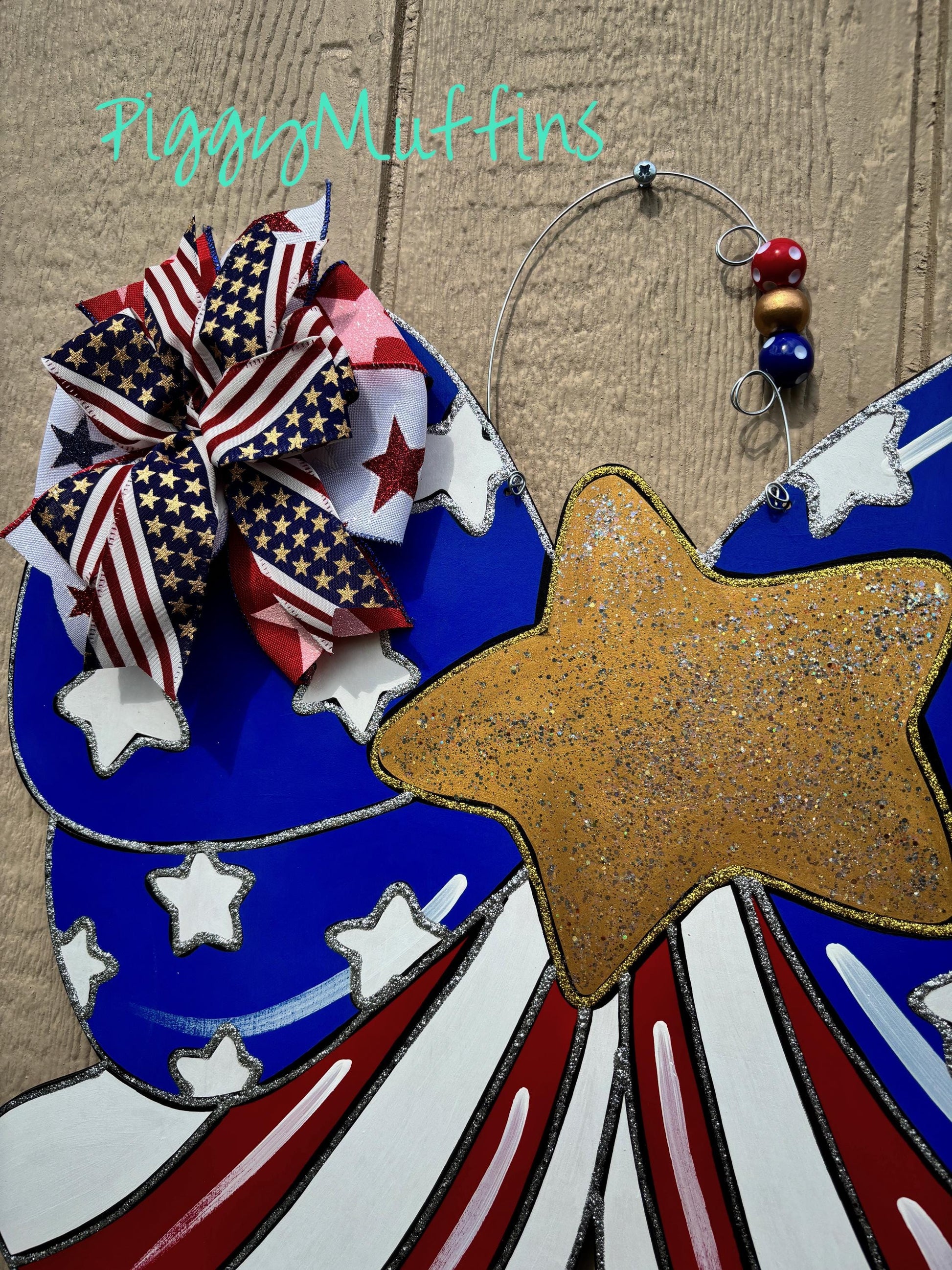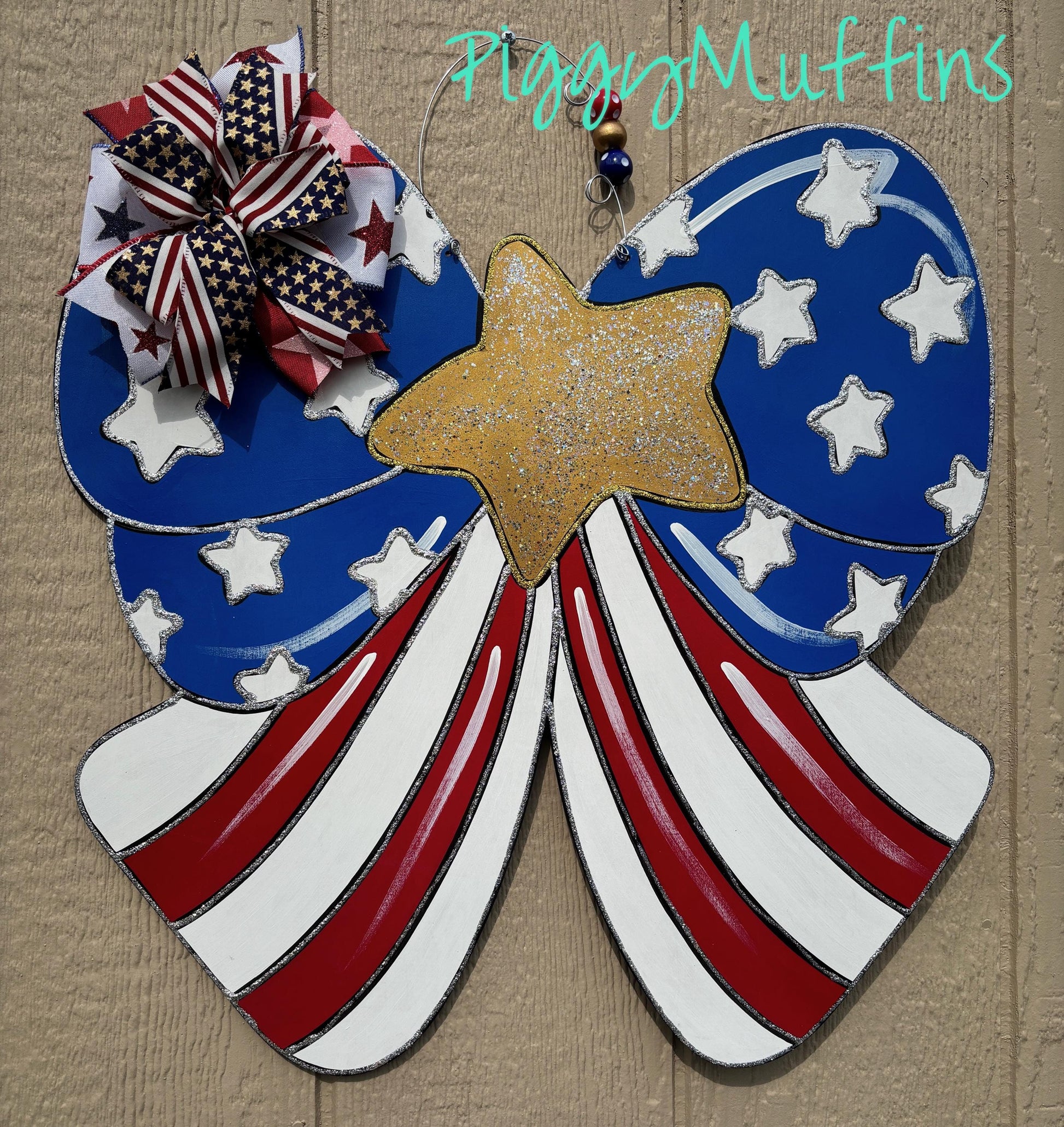 Just look at this cute Patriotic door hanger by PiggyMuffins! Perfect for summer parties, this 4th of July door hanger also makes a great gift. The red, white, and blue door hanger measures approximately 22 inches in length and 22 inches in width. This sign is cut out of 1/4 inch wood, sanded and painted with acrylic paint. It is sealed with a clear protective coating that prevents chipping, peeling, fading, or yellowing. It includes a sturdy wire hanger and coordinating beads and is ready to hang when delivered. Personalization is always free! A coordinating bow can be added for an additional charge by choosing the "With Bow" option at checkout.