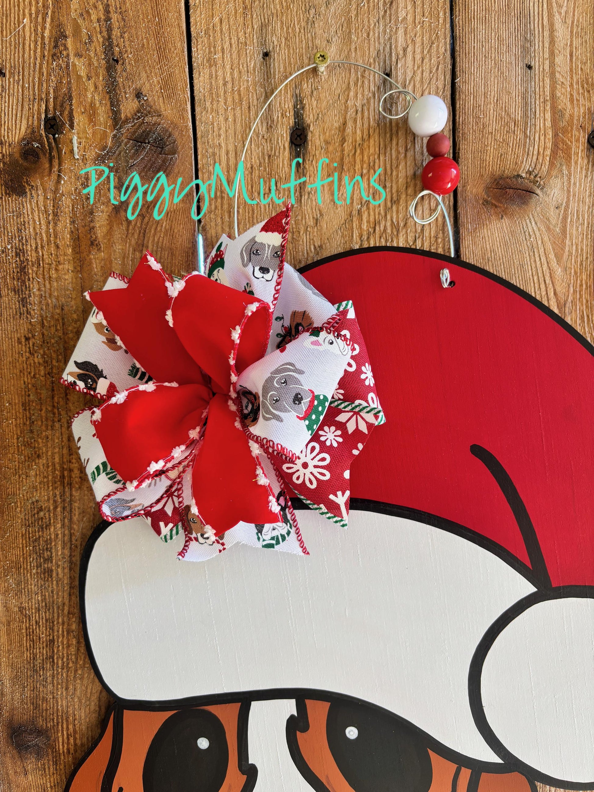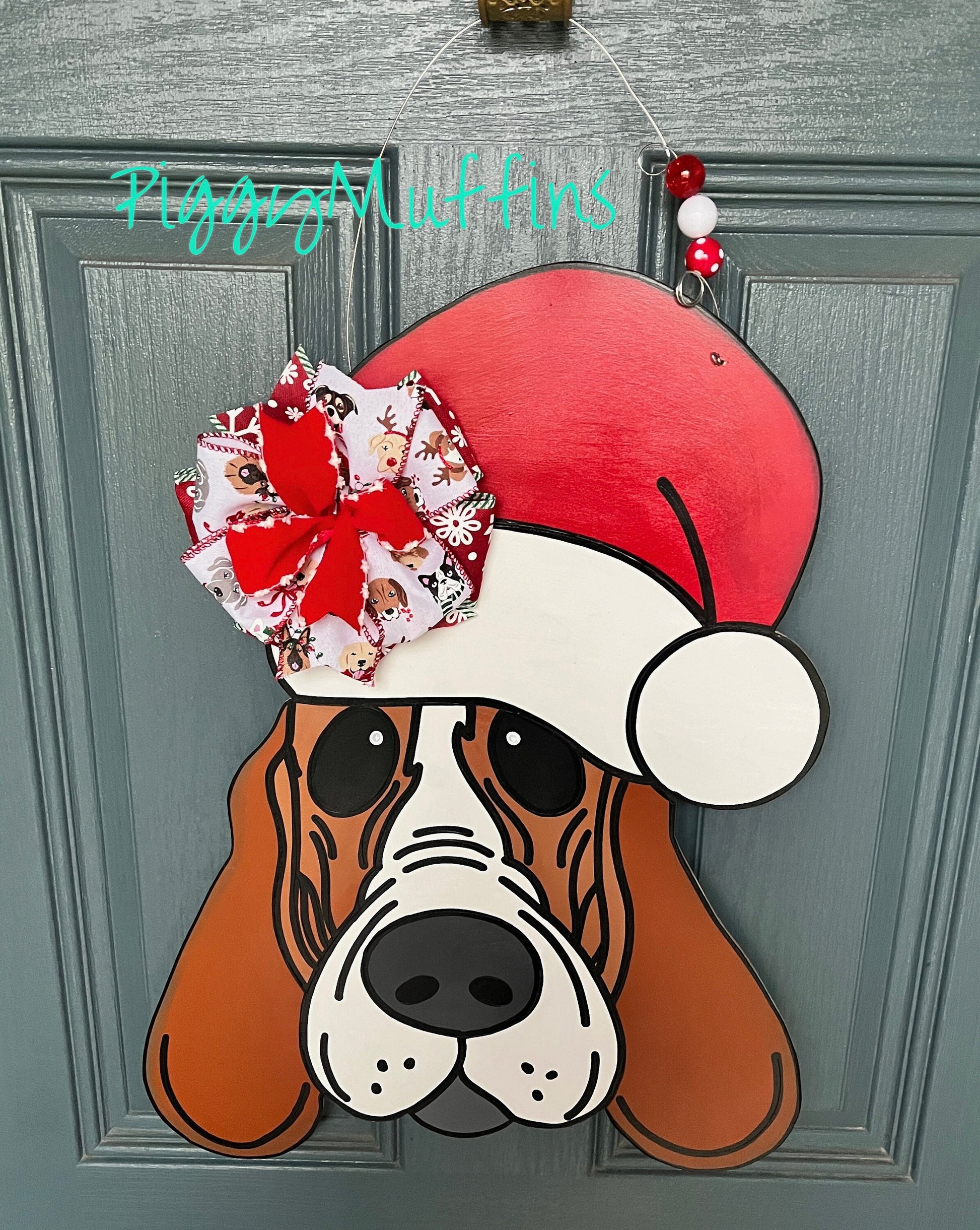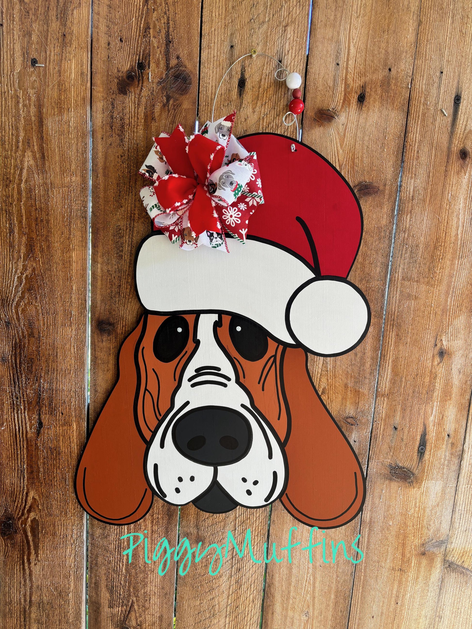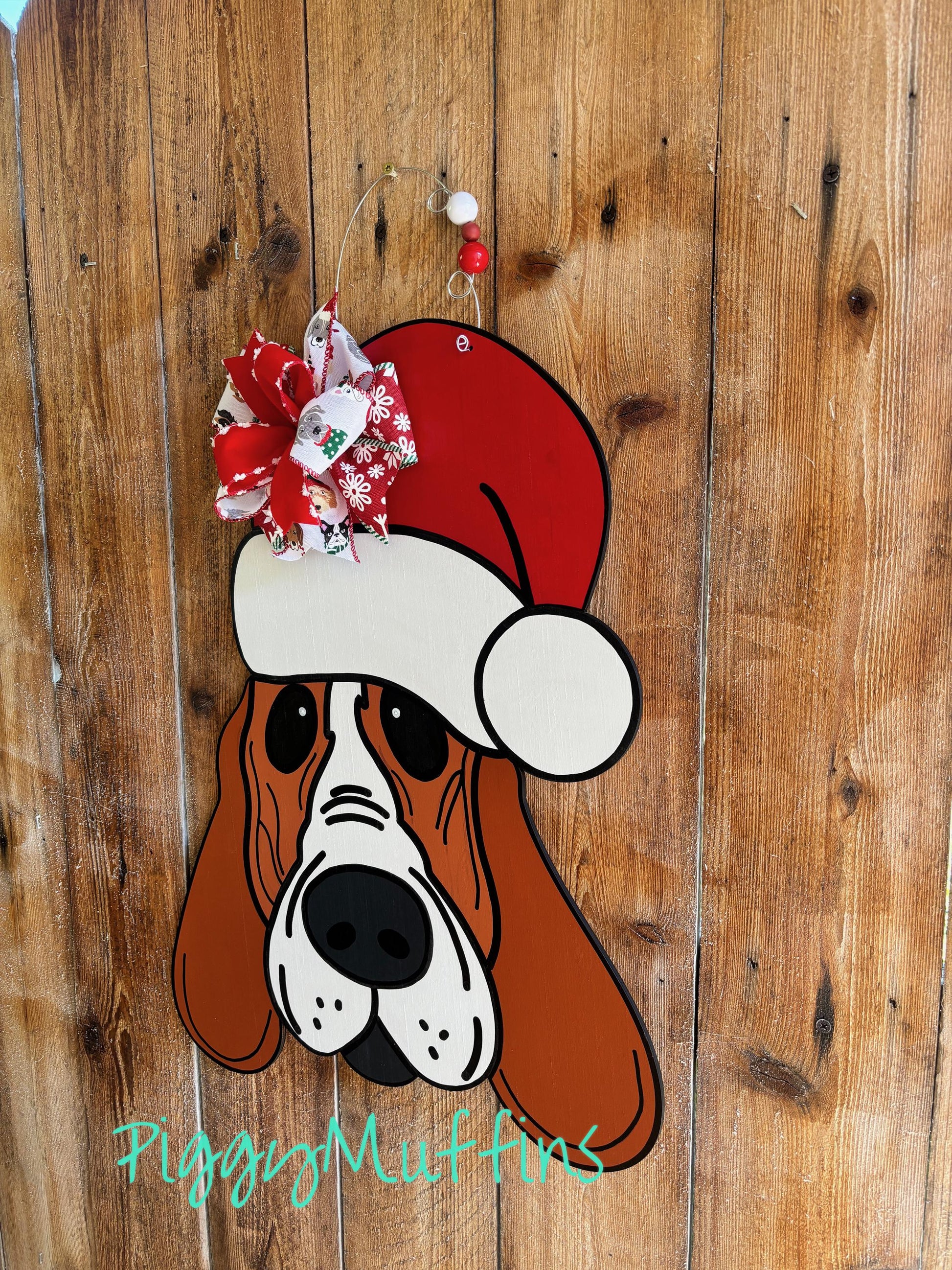 Welcome your guests to all of your holiday celebrations and be the envy of your neighborhood with this adorable Santa Basset hound door hanger from PiggyMuffins! This Christmas Door Hanger measures approximately 21 inches in length and 21 inches in width. This sign is cut out of 1/4 inch board, sanded and painted with acrylic paint and accented with polyester glitter. It is sealed with a clear protective coating that prevents chipping, peeling, fading, or yellowing. It includes a sturdy wire hanger and coordinating beads and is ready to hang when delivered. A coordinating bow may be added for an additional charge by choosing the "WITH Bow" option at checkout.
