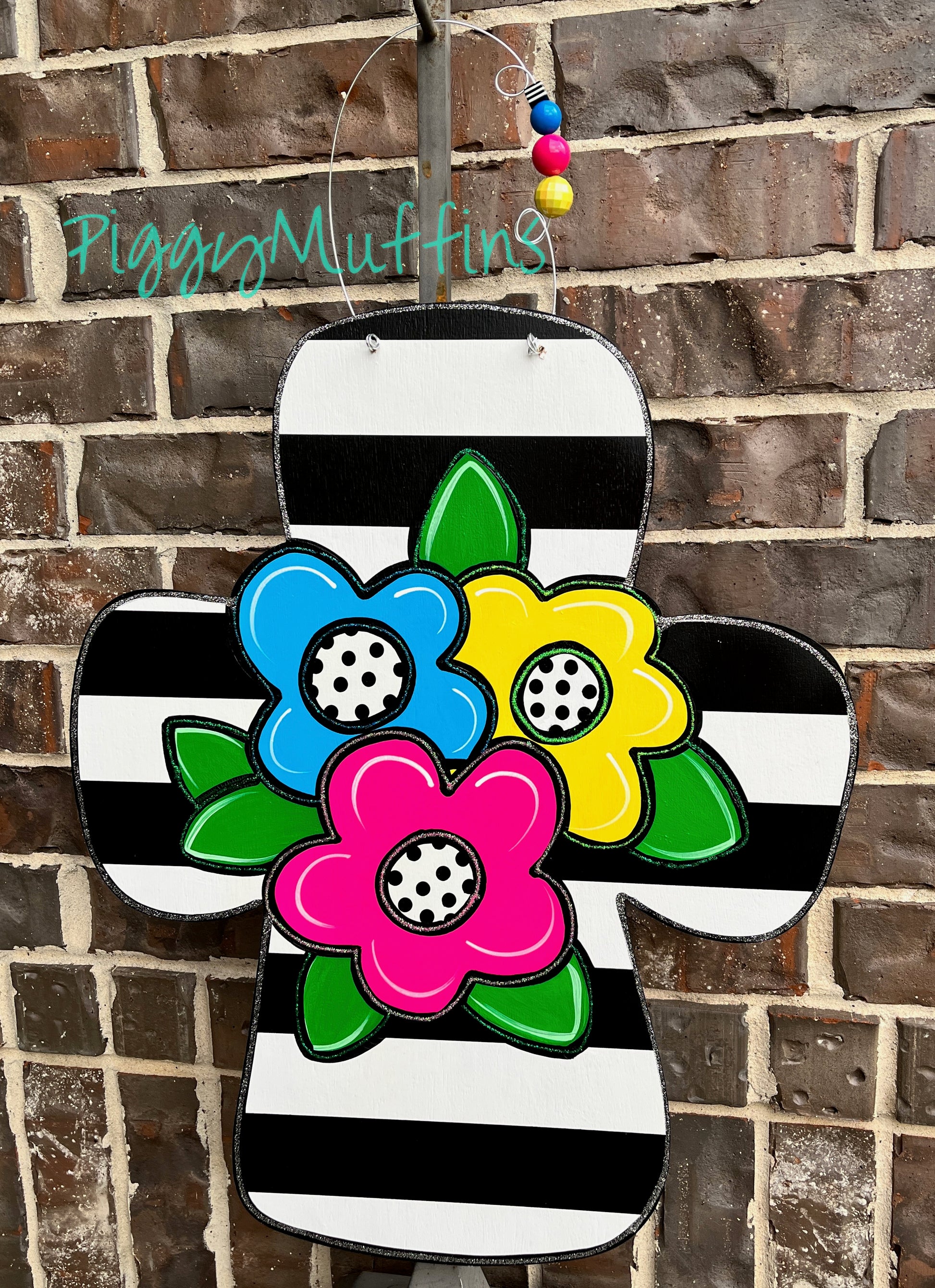 The gorgeous black and white striped cross measures approximately 22 inches in length and 20 inches in width. It features a bouquet of bright hand painted flowers . This sign is cut out of 1/4 inch birch, sanded and painted with acrylic paint. It is sealed with a clear protective coating that prevents chipping, peeling, fading, or yellowing. It includes a sturdy wire hanger and coordinating beads and is ready to hang when delivered. A coordinating bow can be added for an additional charge by choosing the "With Bow" option at checkout.