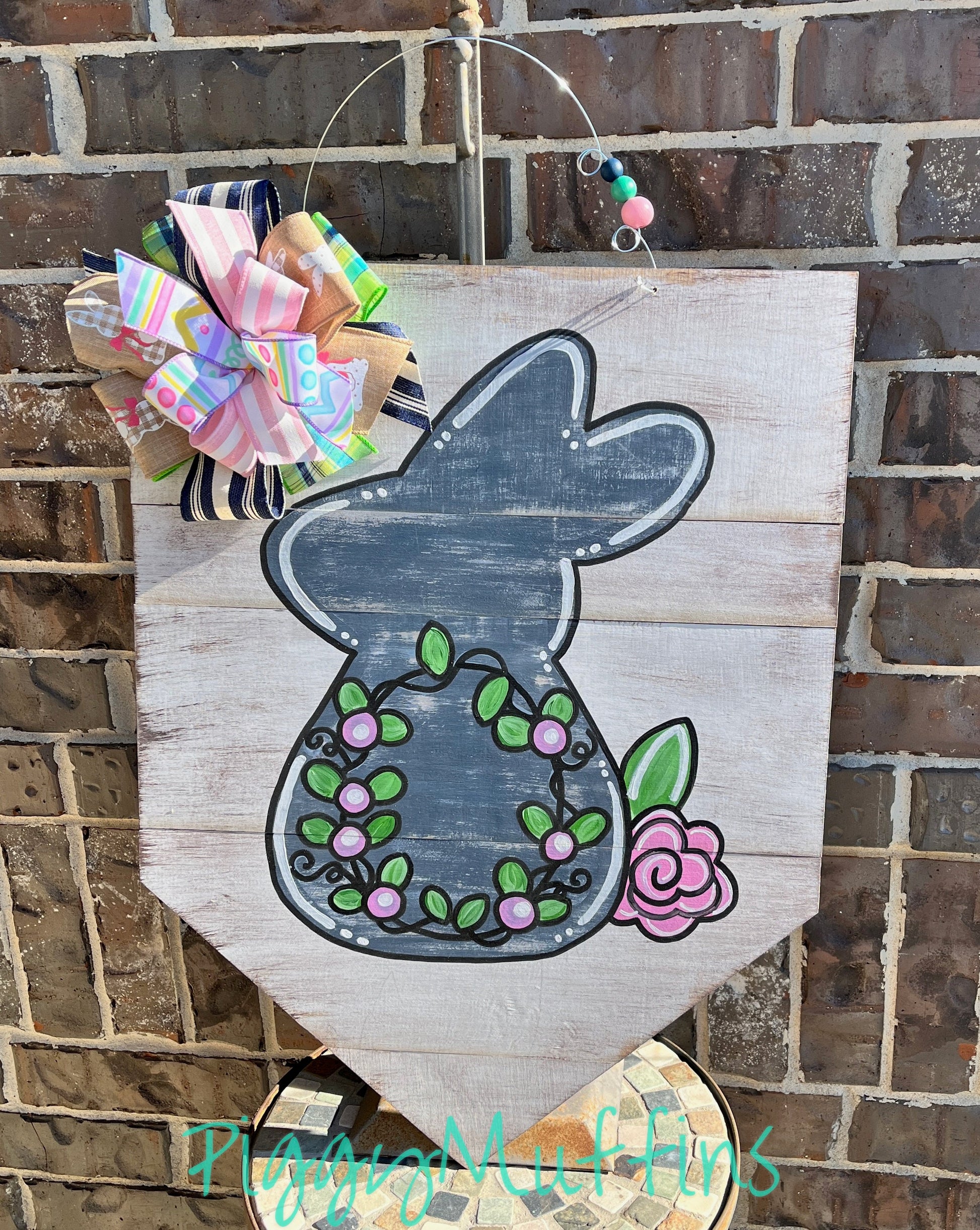 Get ready for spring with this adorable distressed bunny door hanger by PiggyMuffins. It also makes a wonderful gift! This Easter Door Hanger measures approximately 22 inches tall and 20 inches wide and is cut out of 1/4 inch board, sanded and painted with acrylic paint. It is sealed with a clear protective coating that prevents chipping, peeling, fading, or yellowing. It includes a sturdy wire hanger and coordinating bow and is ready to hang when delivered.