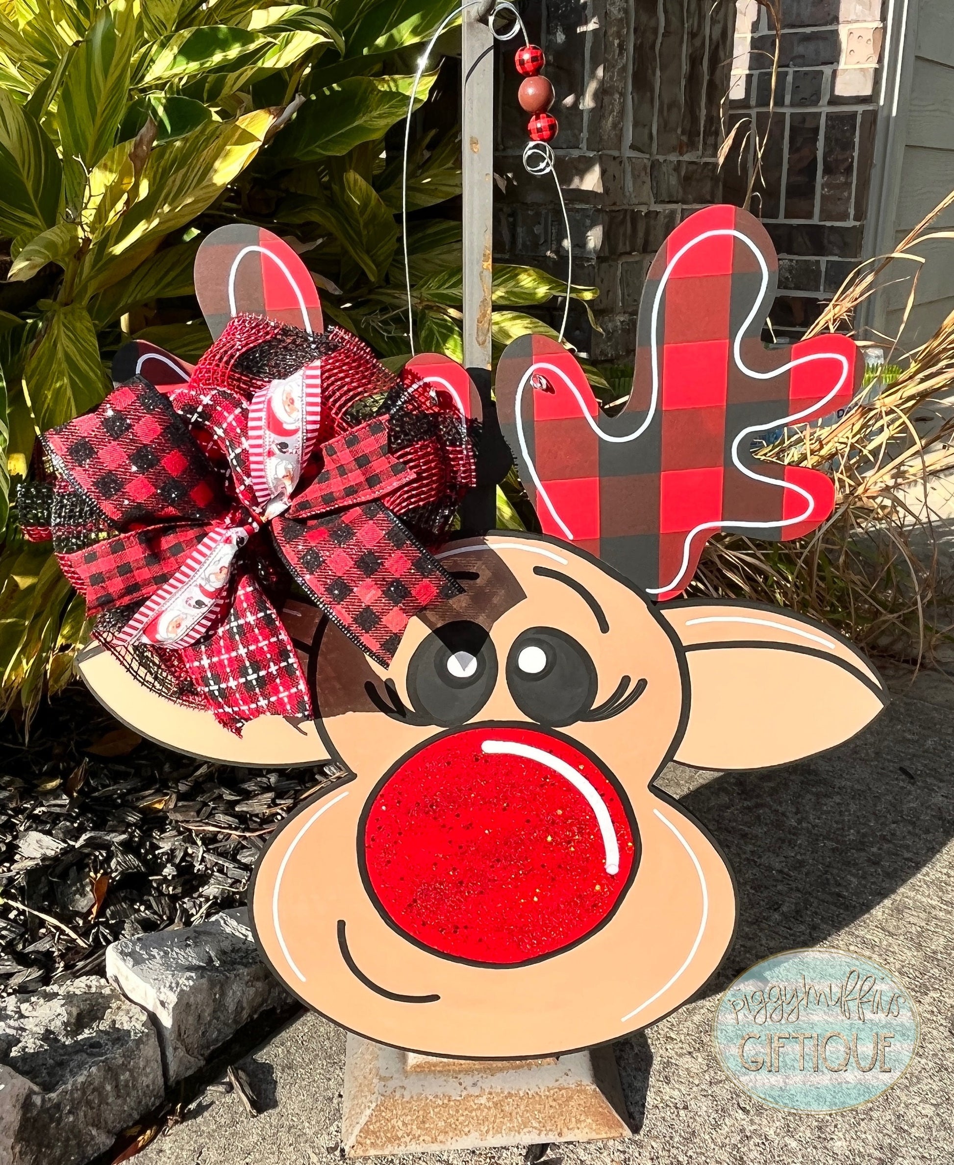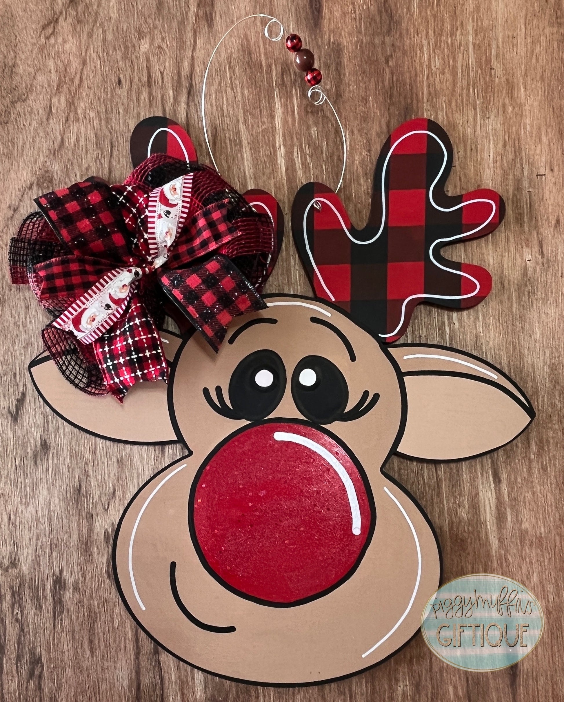 Welcome your guests to all of your Christmas celebrations and be the envy of your neighborhood with this adorable reindeer door hanger from PiggyMuffins! This Holiday Door Hanger measures approximately 22 inches in length and 22 inches in width. This sign is cut out of 1/4 inch board, sanded and painted with acrylic paint and accented with polyester glitter. It is sealed with a clear protective coating that prevents chipping, peeling, fading, or yellowing. It includes a sturdy wire hanger and coordinating beads and is ready to hang when delivered. A coordinating bow can be added for an additional charge by choosing the "With Bow" option at checkout.