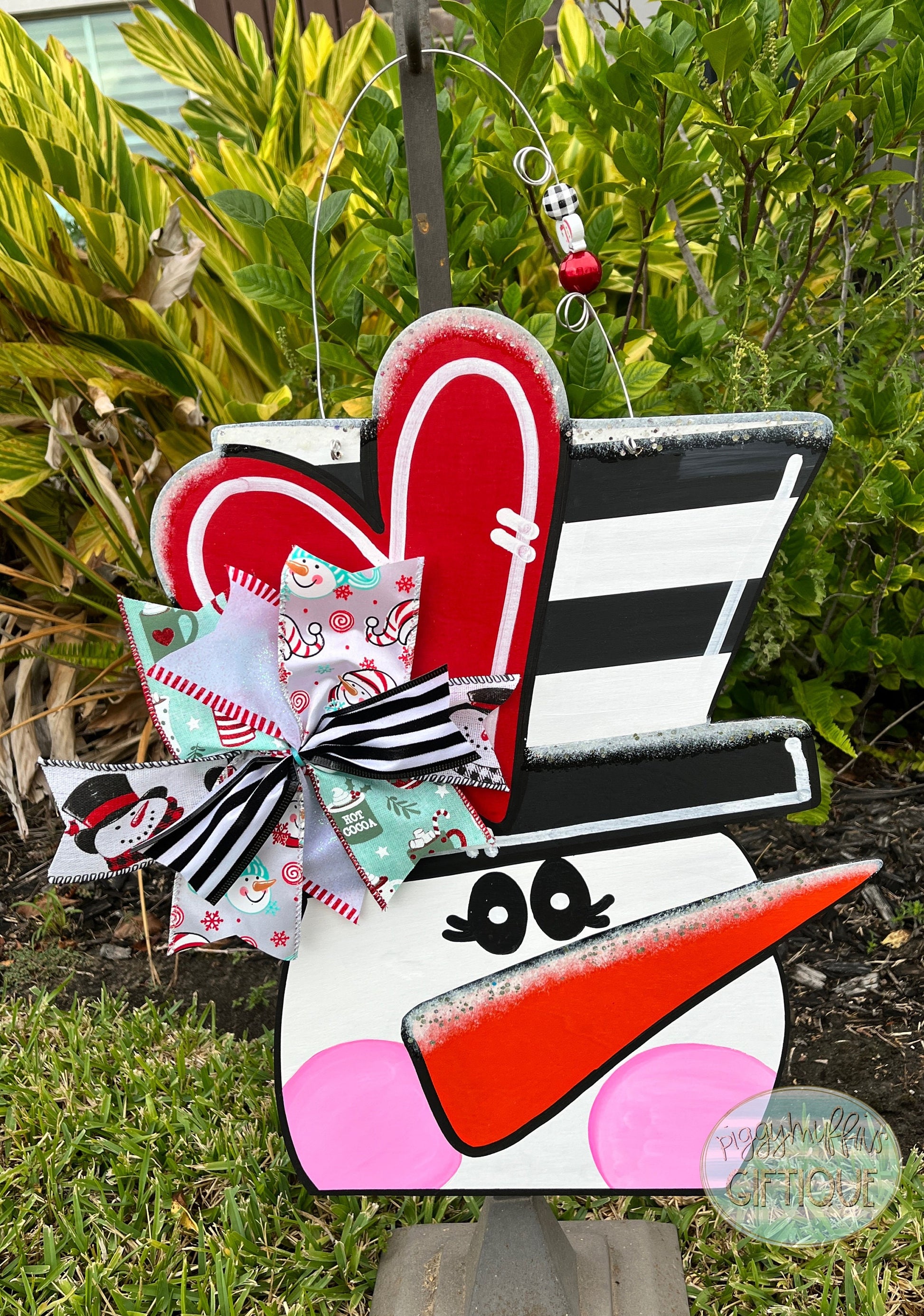 Welcome your guests to all of your Christmas celebrations and be the envy of your neighborhood with this adorable snowman door hanger by PIggyMuffins! This Holiday wreath and Christmas door decoration measures approximately 20 inches in length and 20 inches in width. This sign is cut out of 1/4 inch board, sanded and painted with acrylic paint and accented with polyester glitter. It is sealed with a clear protective coating that prevents chipping, peeling, fading, or yellowing. It includes a sturdy wire hanger and coordinating beads and is ready to hang when delivered. A coordinating bow can be added for an additional charge by choosing the "With Bow" option at checkout.