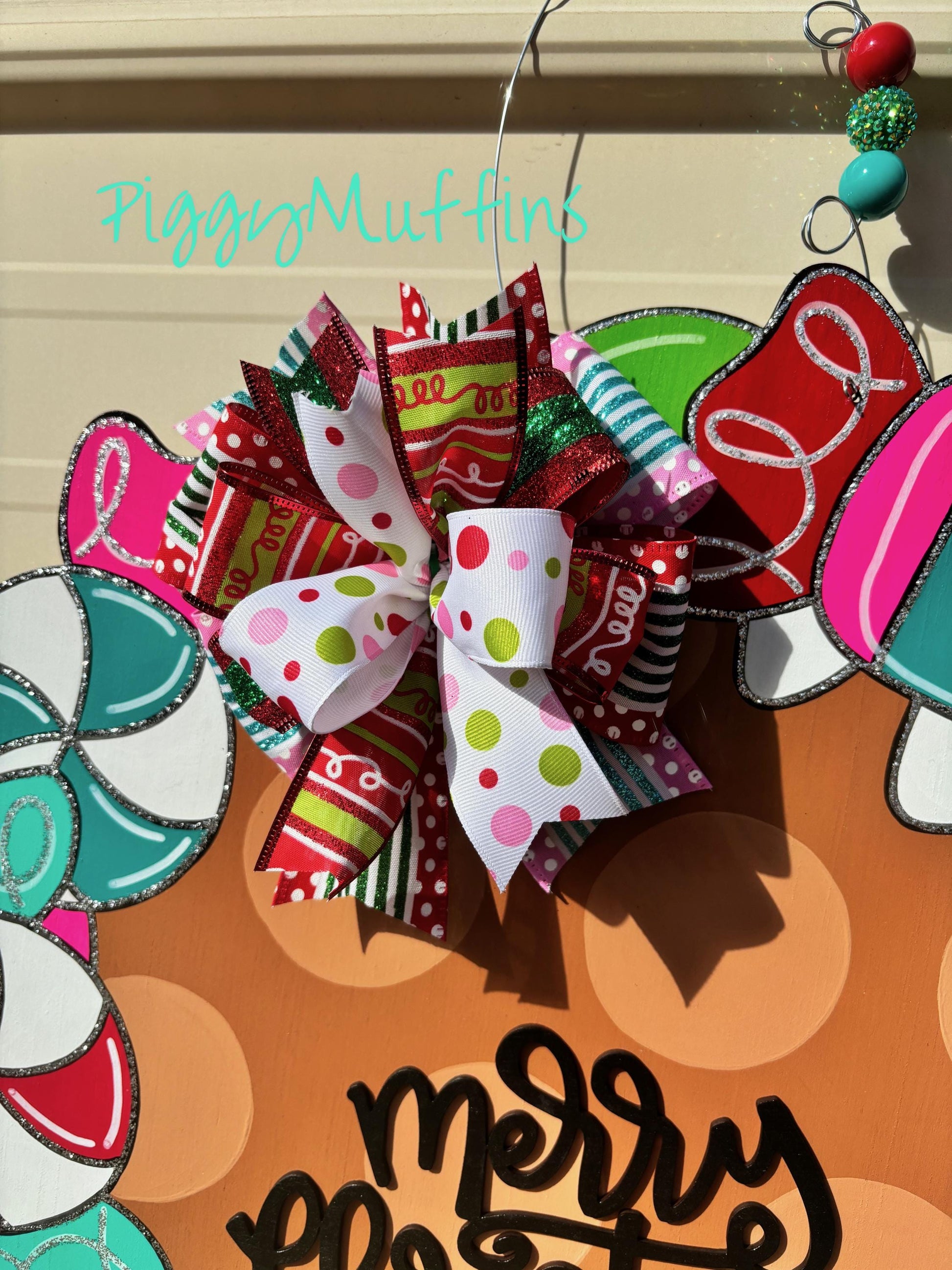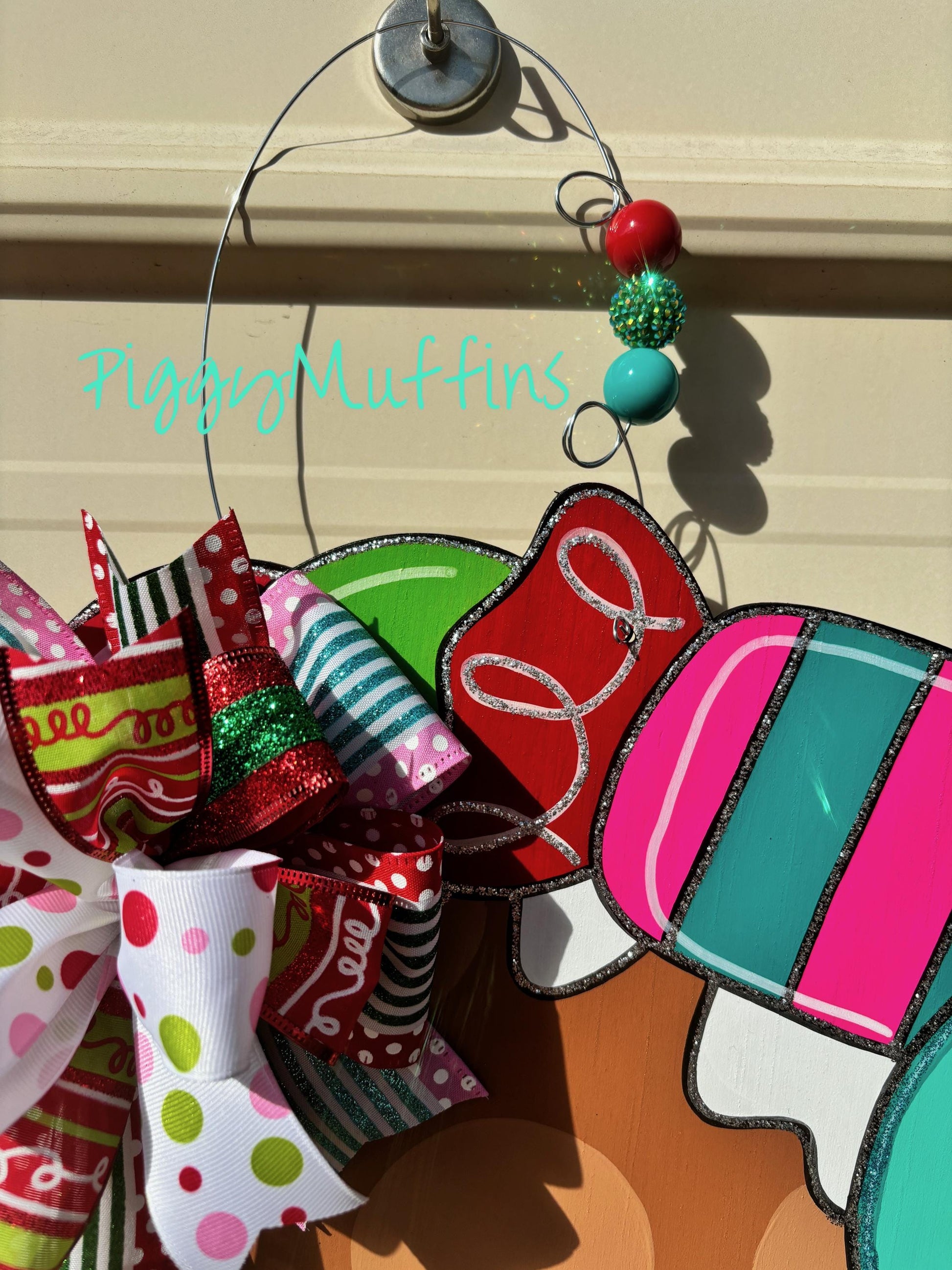 Welcome your guests to all of your Christmas celebrations and be the envy of your neighborhood with this adorable gingerbread candy door hanger by PiggyMuffins! This Christmas Door Hanger measures approximately 22 inches in length and 22 inches in width and can be personalized with any name, initial or phrase that you'd like. This sign is cut out of 1/4 inch board, sanded and painted with acrylic paint and accented with polyester glitter. It is sealed with a clear protective coating that prevents chipping, peeling, fading, or yellowing. It includes a sturdy wire hanger and coordinating beads and is ready to hang when delivered. A coordinating bow can be added for an additional charge by choosing the "With Bow" option at checkout.