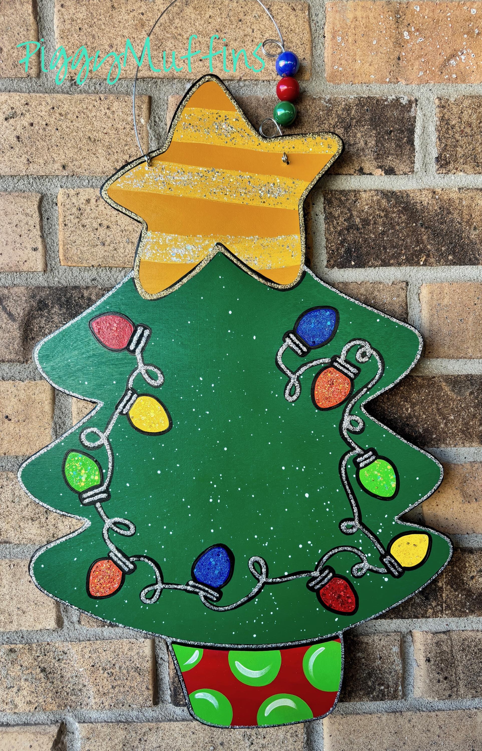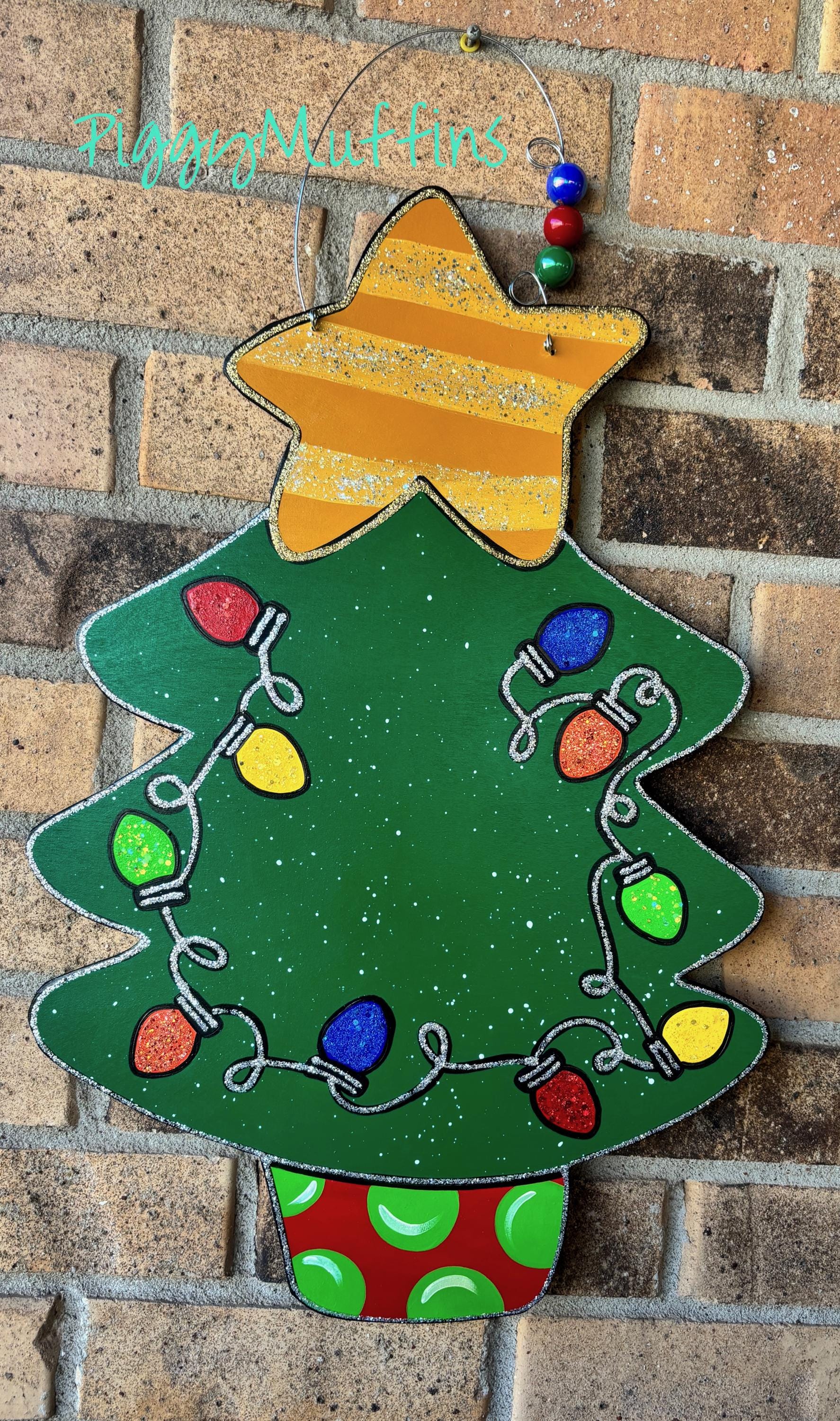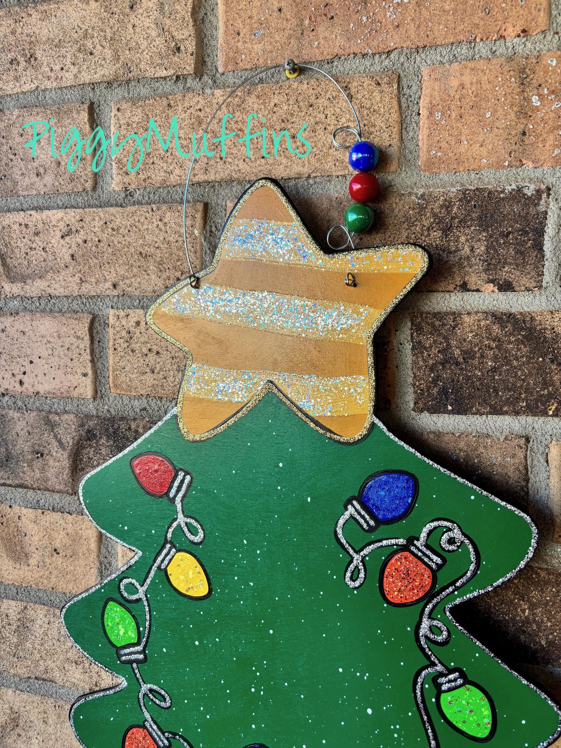 Welcome your guests to all of your Christmas celebrations and be the envy of your neighborhood with this gorgeous Christmas Tree door hanger by PiggyMuffins! This Christmas Door Hanger measures approximately 21 inches in length and width. This sign is cut out of 1/4 inch board, sanded and painted with acrylic paint and accented with polyester glitter. It is sealed with a clear protective coating that prevents chipping, peeling, fading, or yellowing. It includes a sturdy wire hanger and coordinating beads and is ready to hang when delivered.