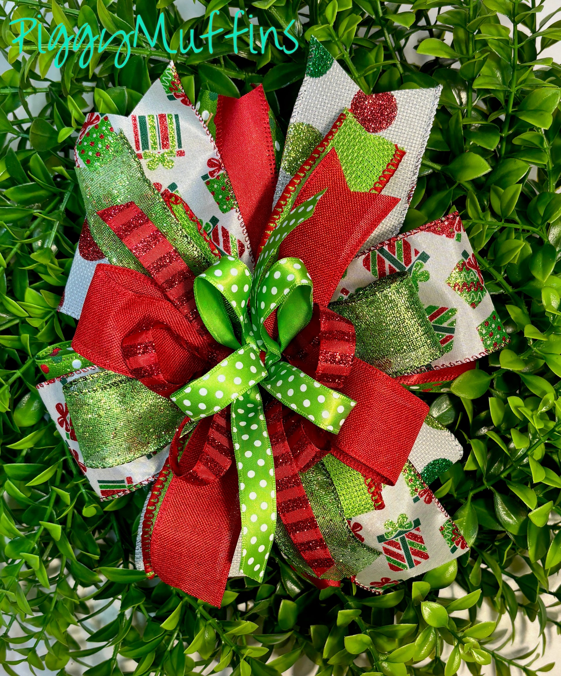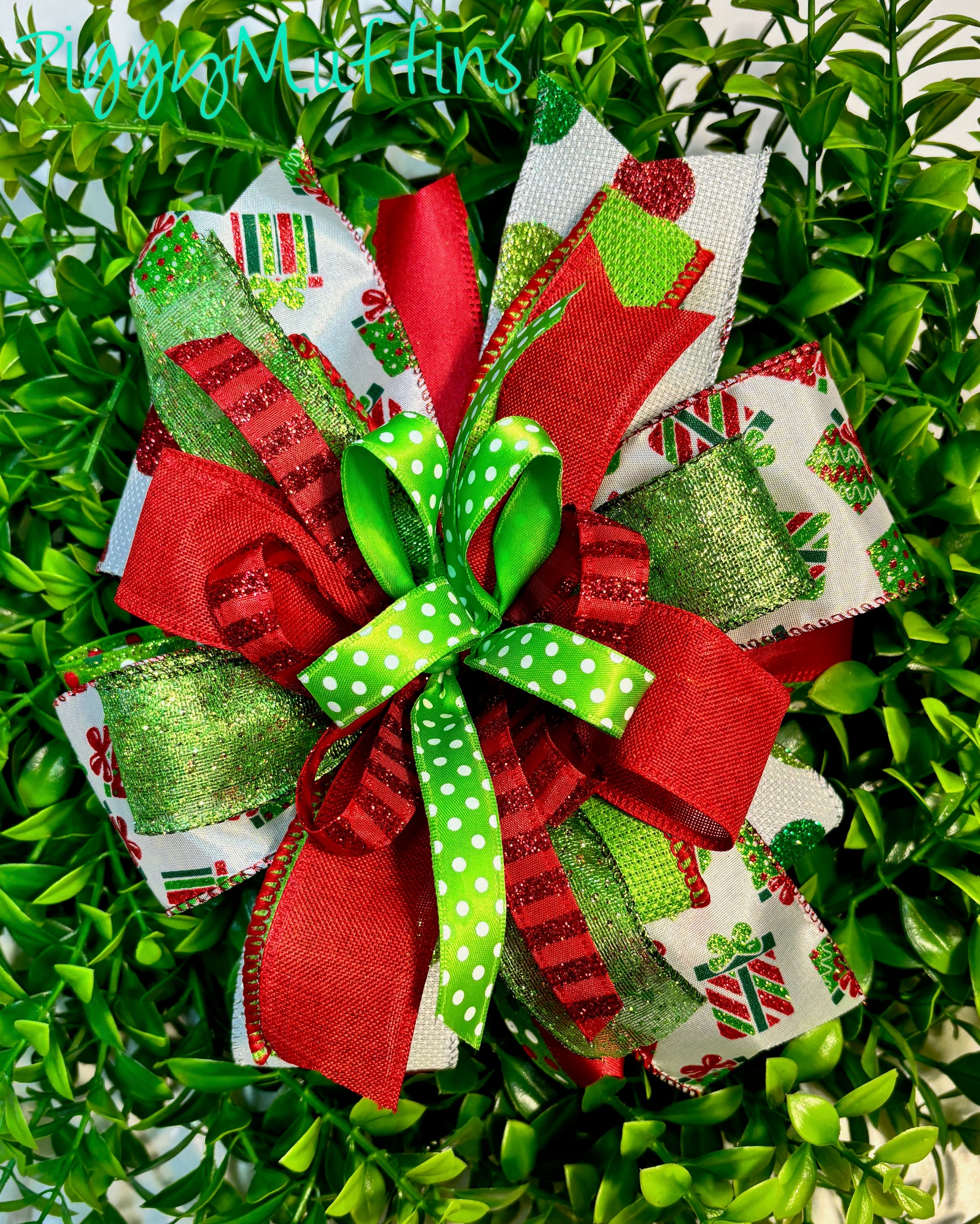 🎀 Add a gorgeous pop of color to your home decor with this Red and Lime Green Christmas Bow. It is the perfect addition to any pre-made greenery wreath or as a beautiful bow for a Christmas door hanger!