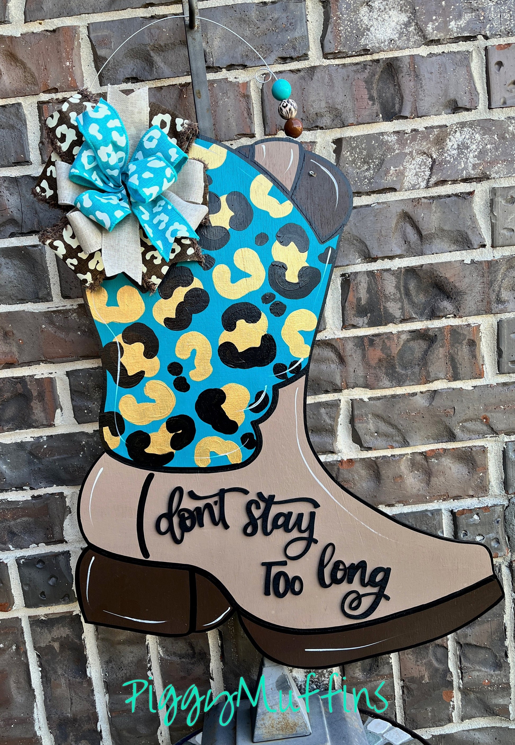 Personalize this adorable cowboy boot door hanger from PiggyMuffins for the perfect welcome to your home! It also makes the perfect gift!. This Cowgirl Door Hanger is cut out of 1/4 inch board, sanded and painted with acrylic paint. It is sealed with a clear protective coating that prevents chipping, peeling, fading, or yellowing. It includes a sturdy wire hanger and coordinating bow and is ready to hang when delivered. A coordinating bow can be added for an additional charge at checkout.