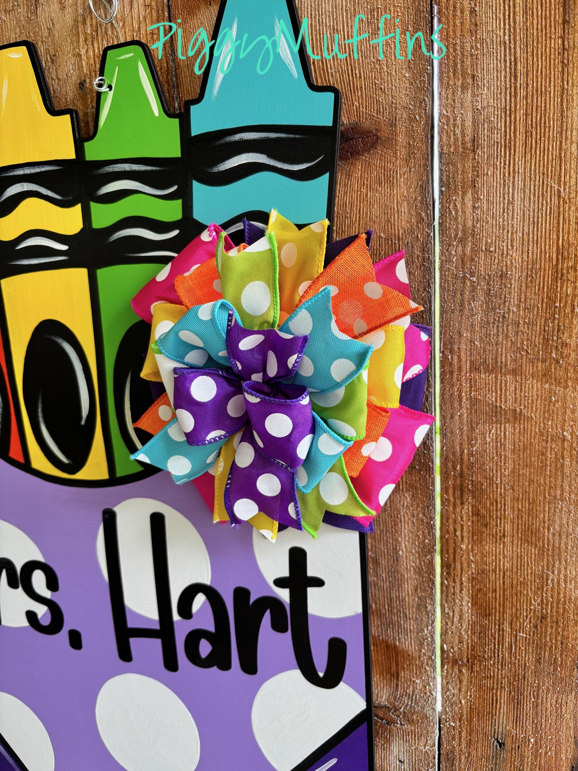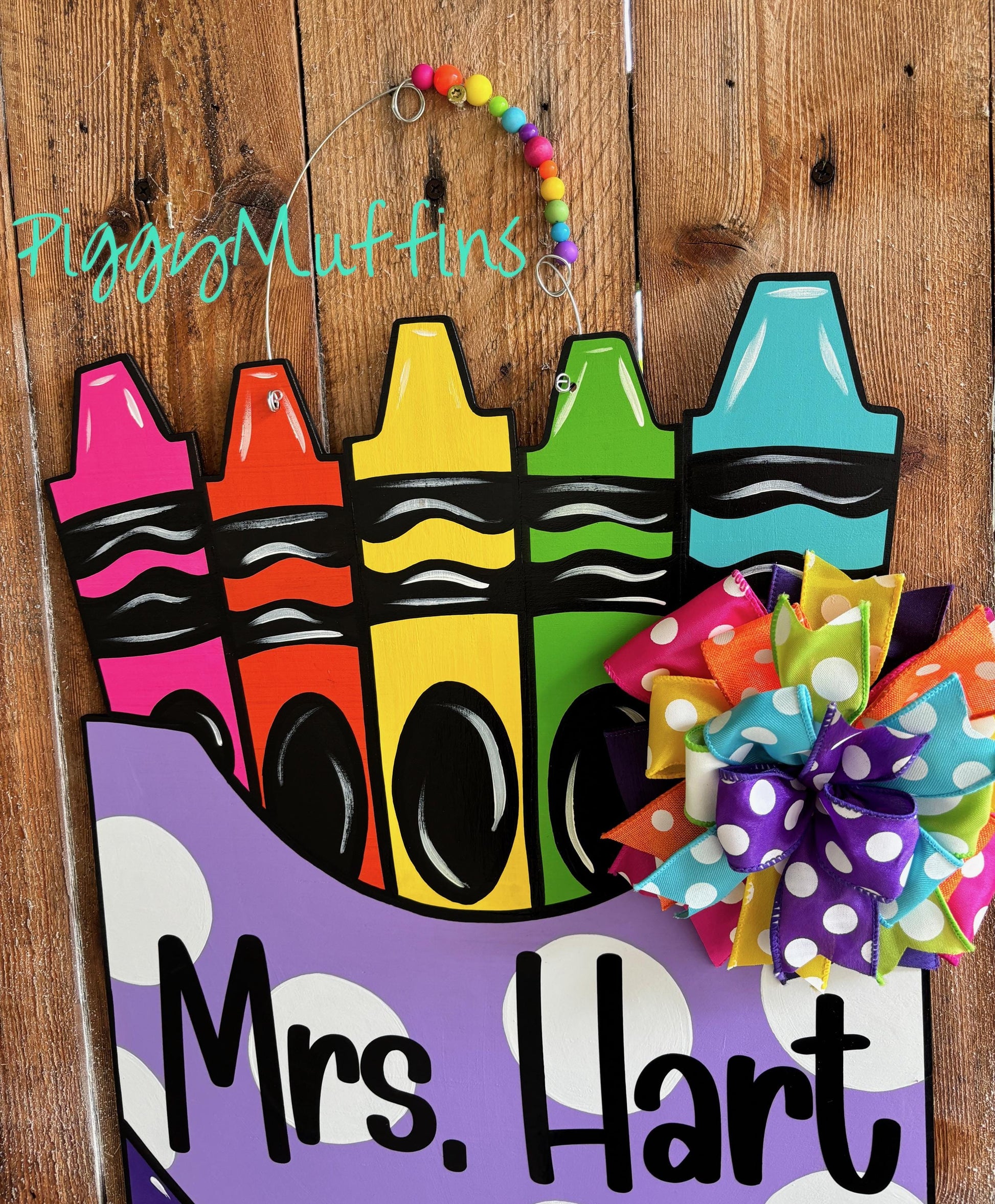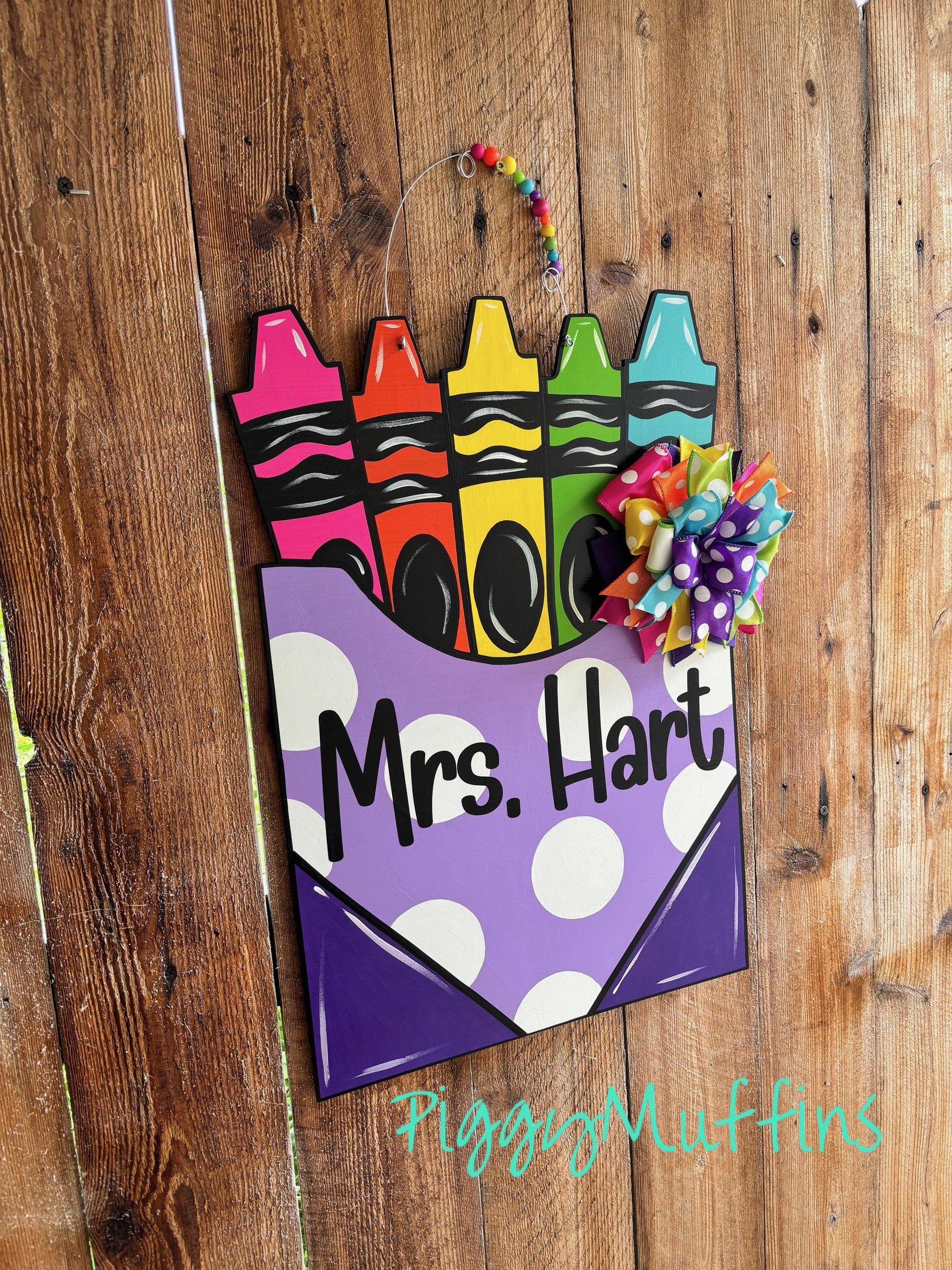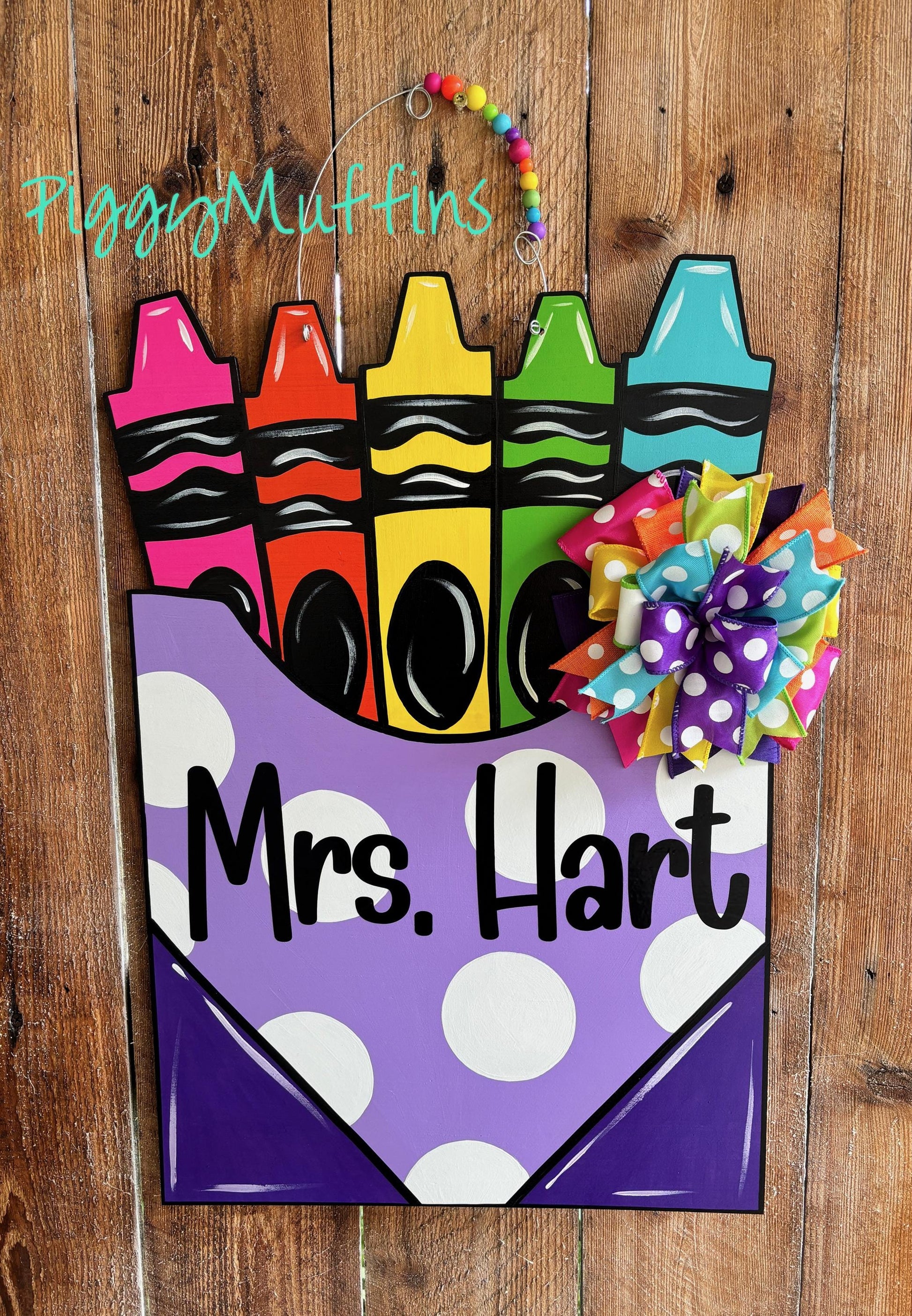 The adorable PiggyMuffins crayon box door hanger is the perfect way to welcome your students and guests to your classroom this school year! This school door hanger is laser cut out of 1/4 inch board and painted with acrylic paint. This classroom door hanger would make the perfect gift for your teacher. It is sealed with a clear protective coating that prevents chipping, peeling, fading, or yellowing. It includes a sturdy wire hanger and coordinating beads and is ready to hang when delivered. A coordinating bow can be added for an additional charge by choosing the "With Bow" option at checkout.