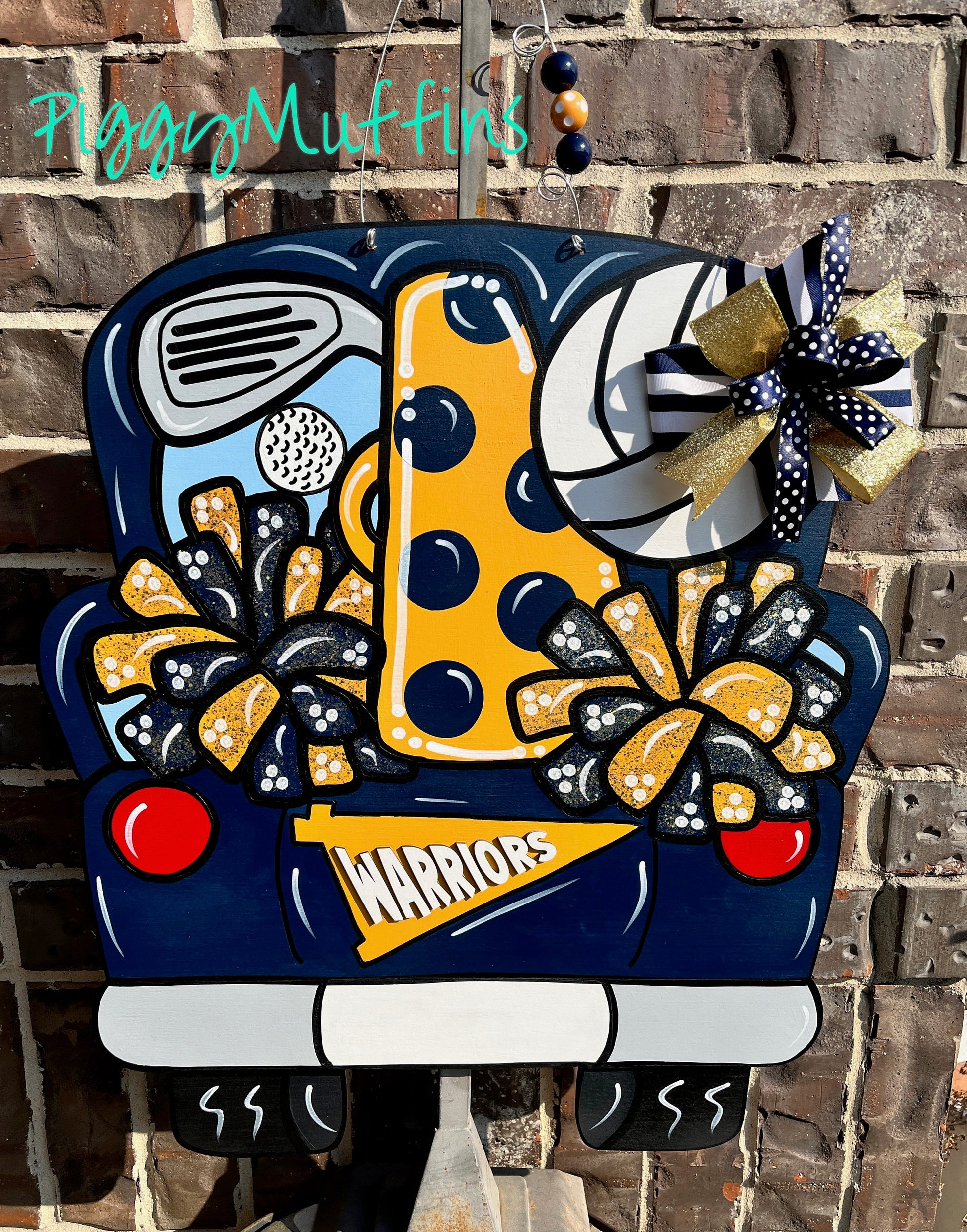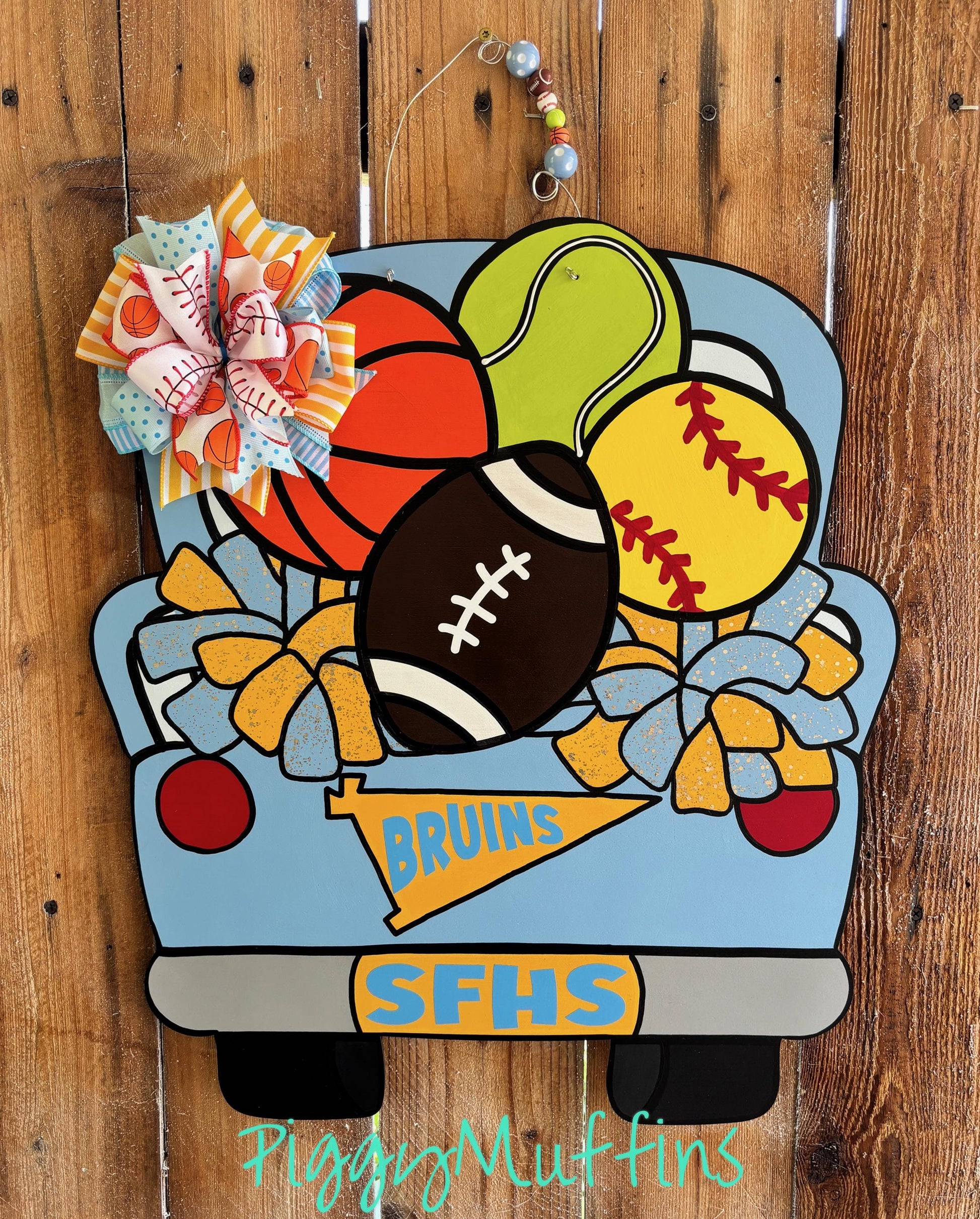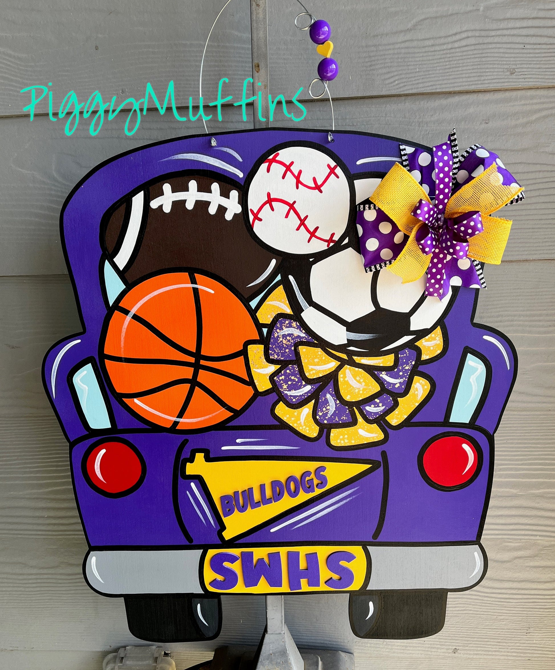 Get ready for all of your favorite sports and support your favorite player(s) with this aDOORable CUSTOMIZABLE door hanger! If you're looking for a baseball door hanger, football door hanger, softball door hanger, golf door hanger, tennis door hanger, or cheer door hanger, why not get them all in one customized door hanger?!It also makes a wonderful gift! This sign is cut out of 1/4 inch board, sanded and painted with acrylic paint. It is sealed with a clear protective coating that prevents chipping, peeling, fading, or yellowing. It includes a sturdy wire hanger and coordinating beads and is ready to hang when delivered. A coordinating bow can be added for an additional charge by choosing the "With Bow" option at checkout.