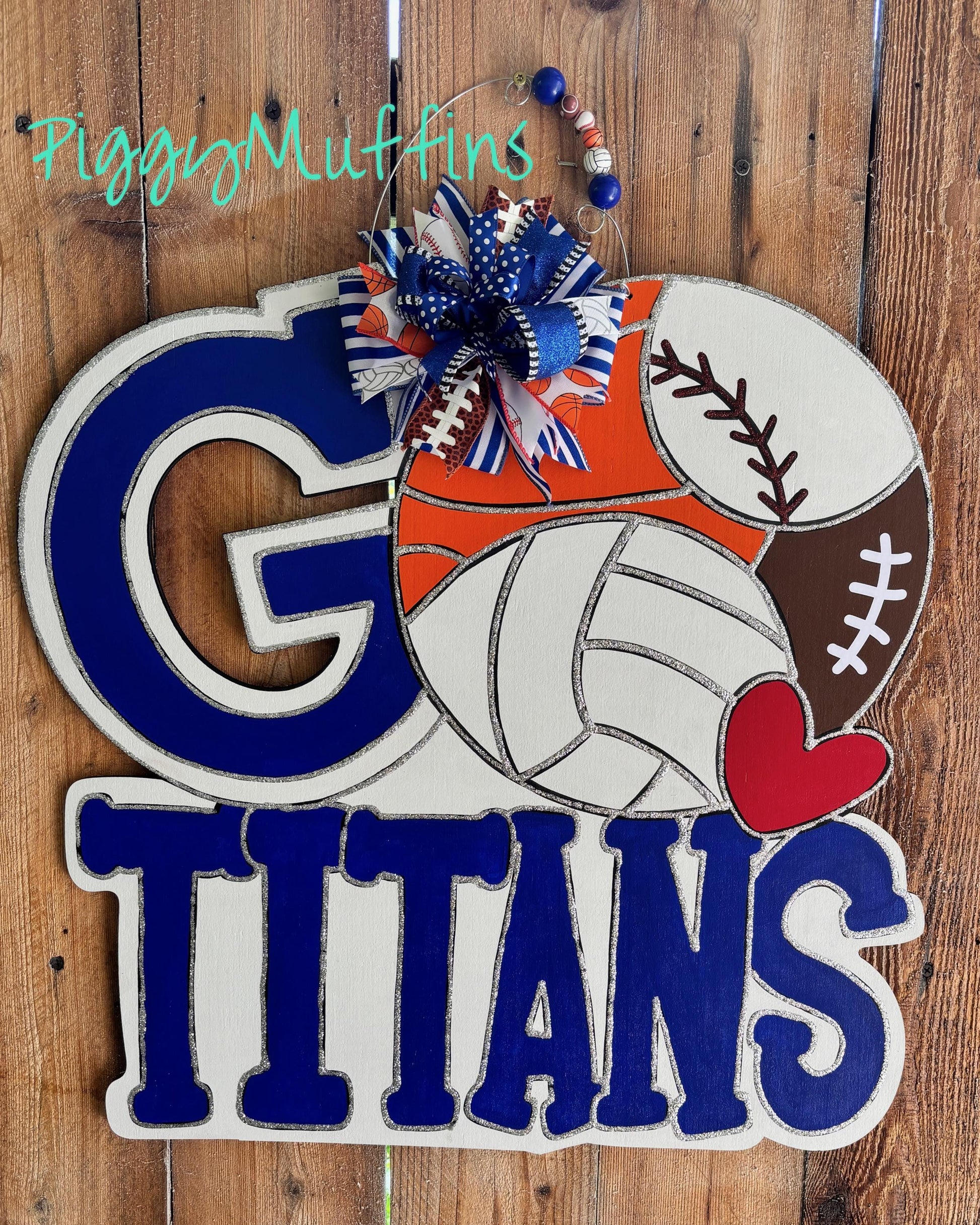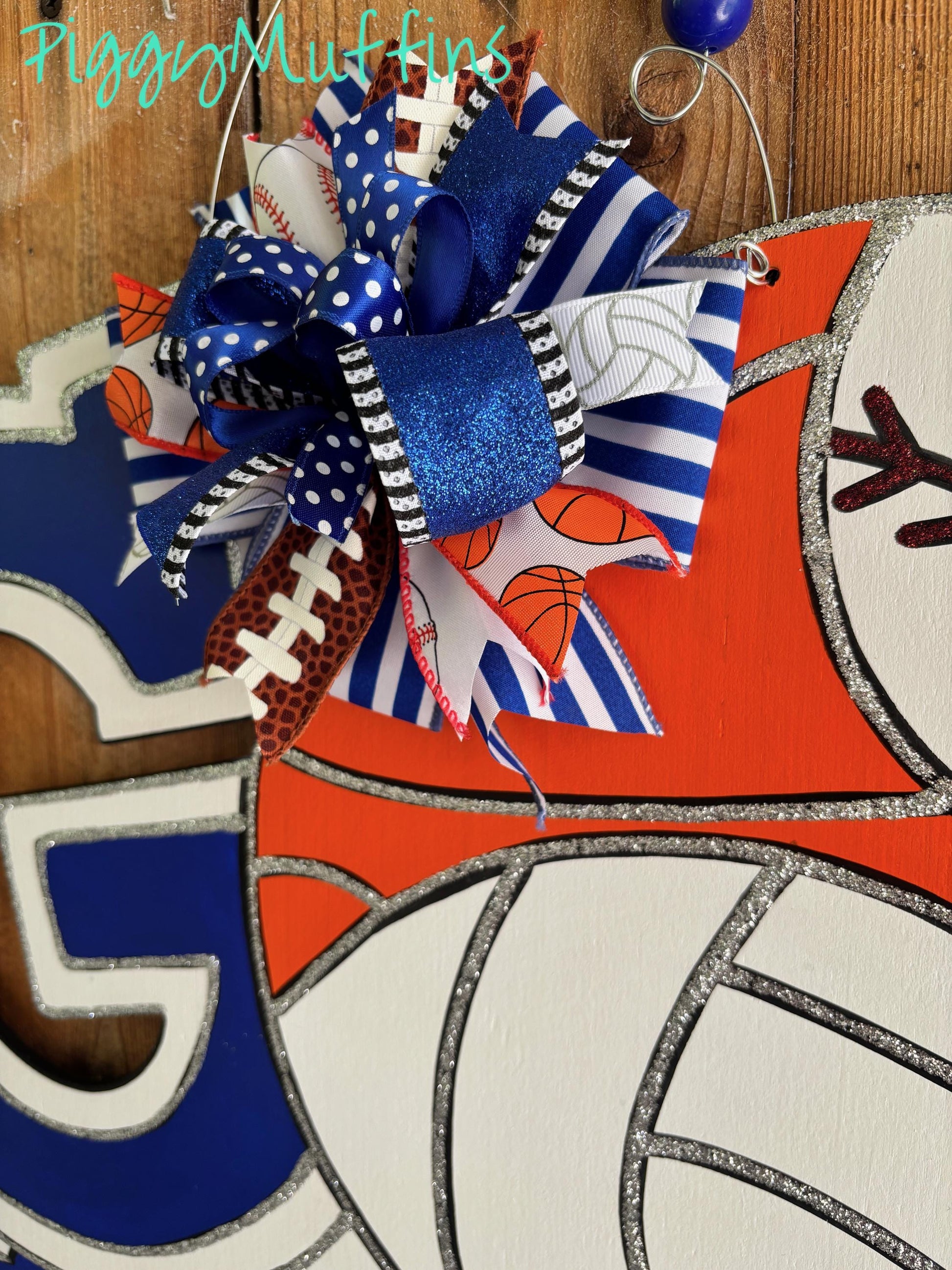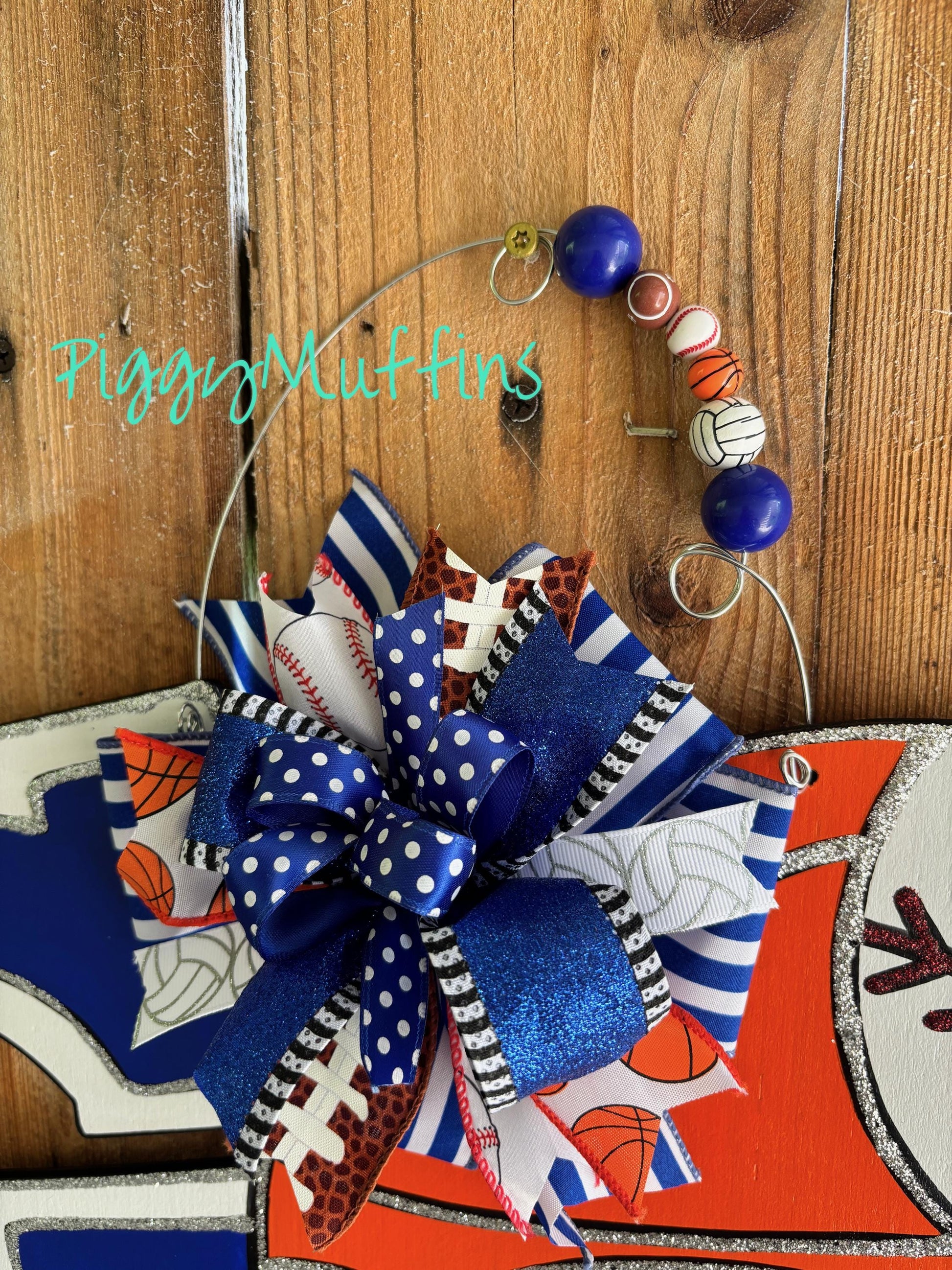 Get ready for all of your favorite sports and support your favorite player(s) with this aDOORable PiggyMuffins CUSTOMIZABLE Sports door hanger! It also makes a wonderful gift! Celebrate baseball, basketball, golf, softball, tennis, or volleyball. This sign is cut out of 1/4 inch board, sanded and painted with acrylic paint. It is sealed with a clear protective coating that prevents chipping, peeling, fading, or yellowing. It includes a sturdy wire hanger and coordinating beads and is ready to hang when delivered. A coordinating bow can be added for an additional charge by choosing the "With Bow" option at checkout.