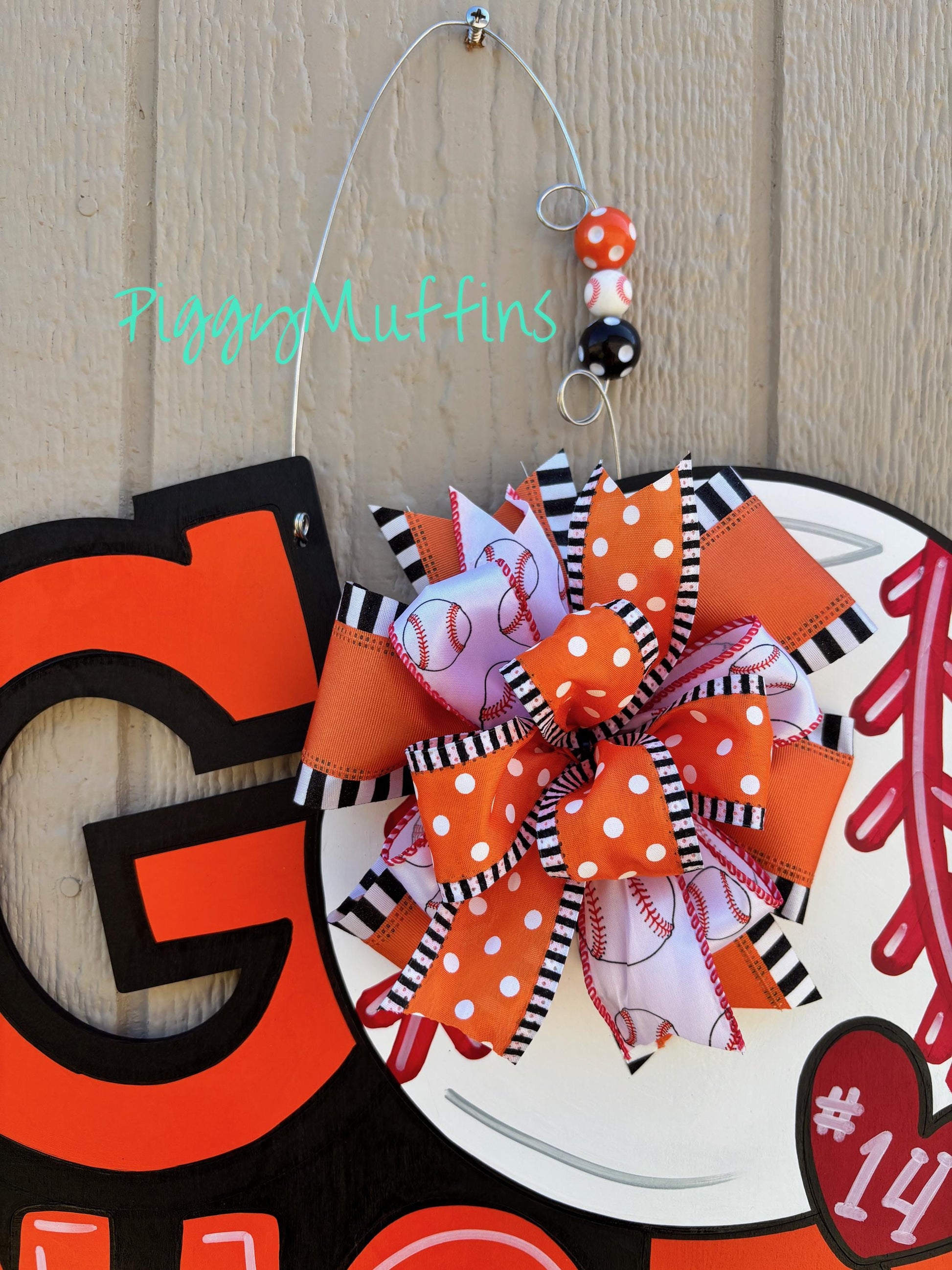 Get ready for all of your favorite sports and support your favorite team with this aDOORable CUSTOMIZABLE door hanger! It also makes a wonderful gift! This sign is cut out of 1/4 inch board, sanded and painted with acrylic paint. It is sealed with a clear protective coating that prevents chipping, peeling, fading, or yellowing. It includes a sturdy wire hanger and coordinating beads and is ready to hang when delivered. A coordinating bow can be added for an additional charge by choosing the "With Bow" option at checkout.