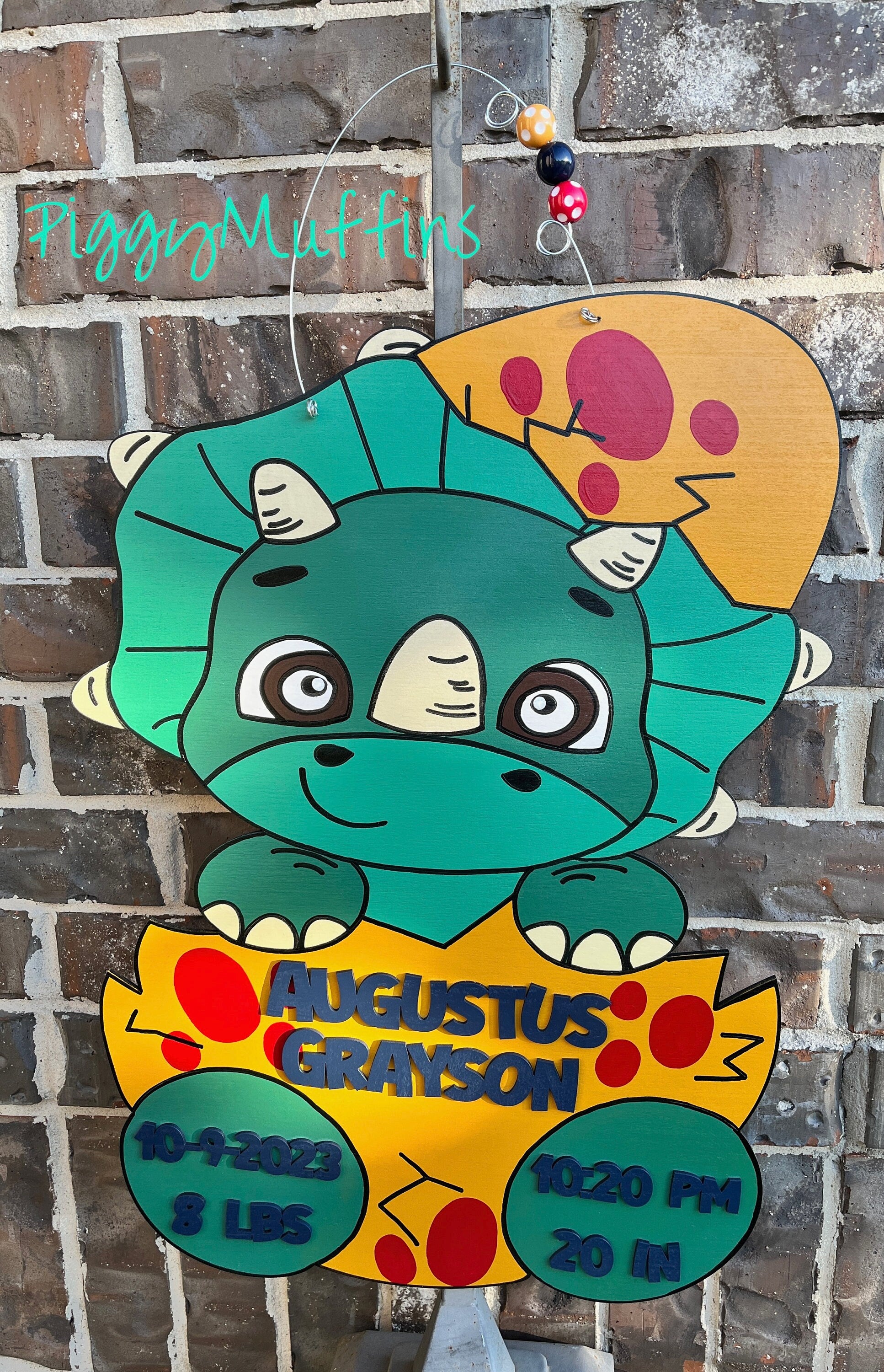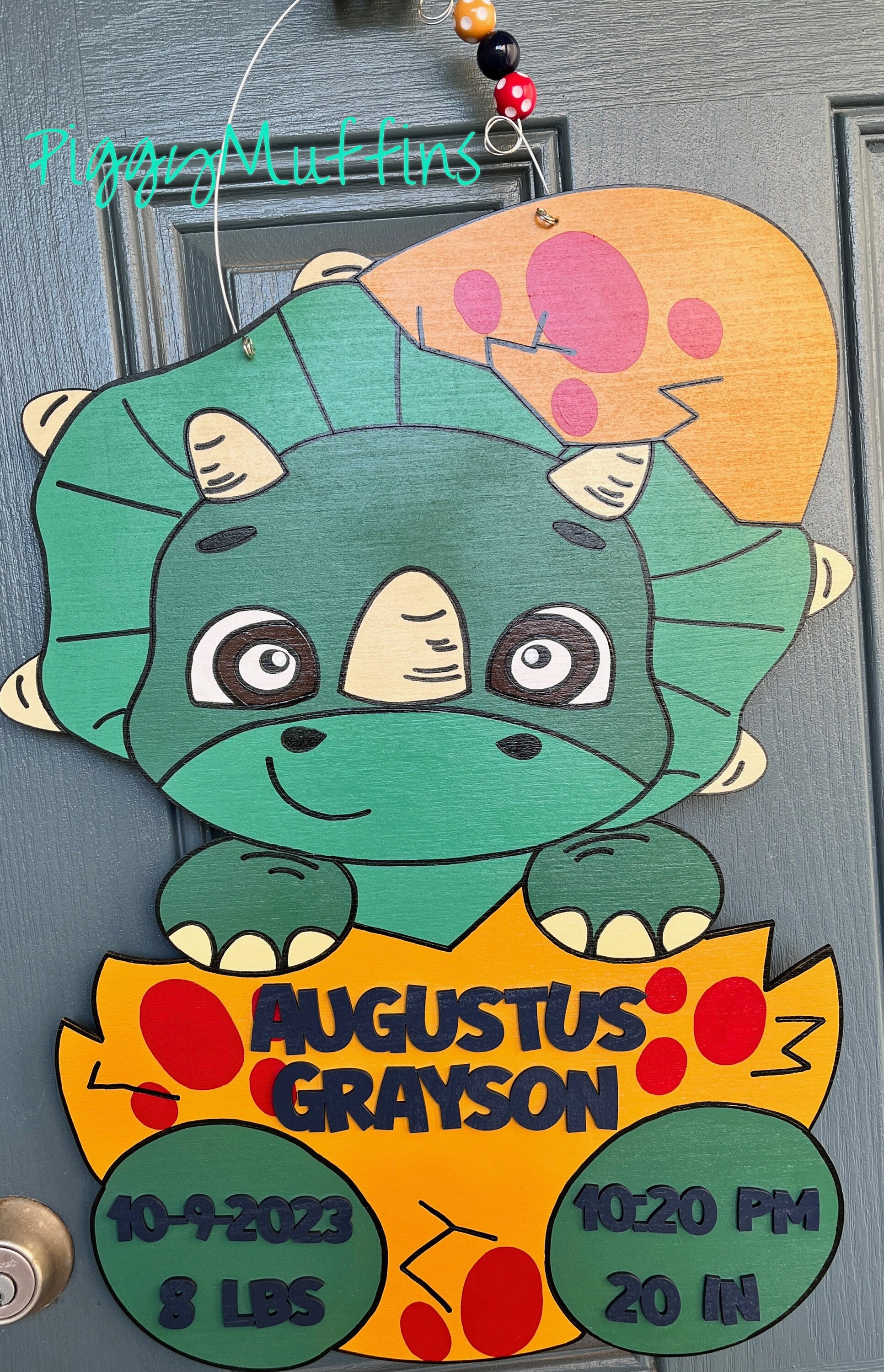 This adorable dinosaur hospital/nursery door hanger makes a wonderful gift! Choose your colors for the perfect match to your dinosaur theme! This sign is cut out of 1/4 inch board, sanded and painted with acrylic paint. It is sealed with a clear protective coating that prevents chipping, peeling, fading, or yellowing. It includes a sturdy wire hanger and coordinating beads and is ready to hang when delivered. A coordinating bow can be added for an additional charge at checkout.