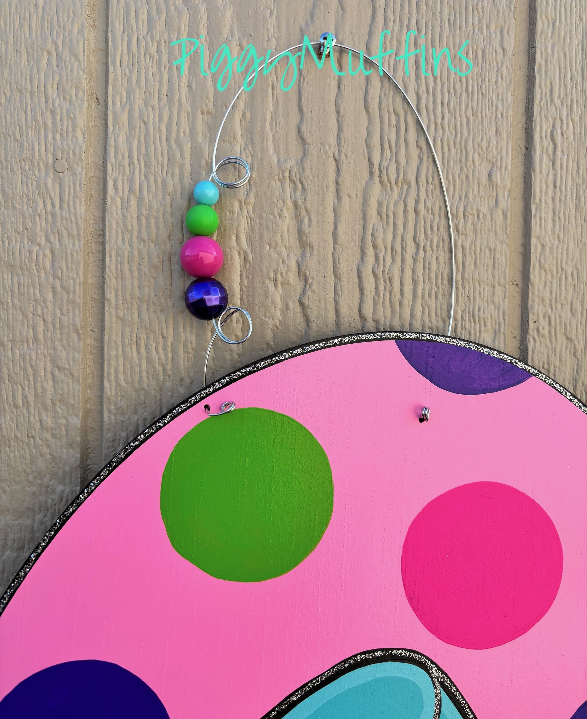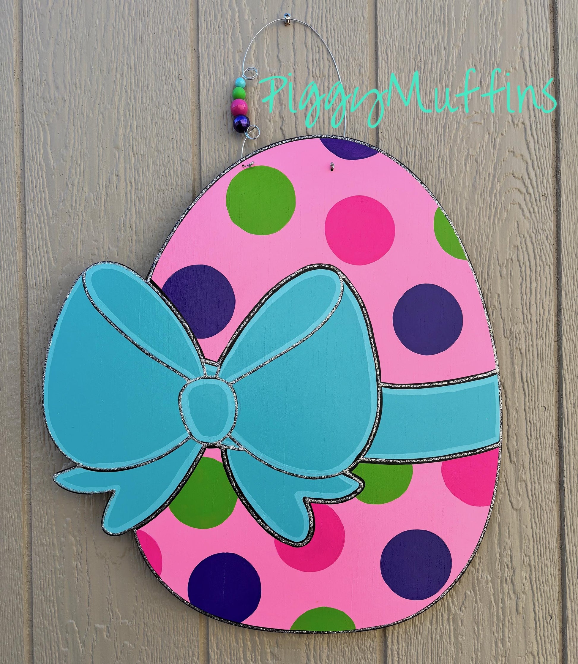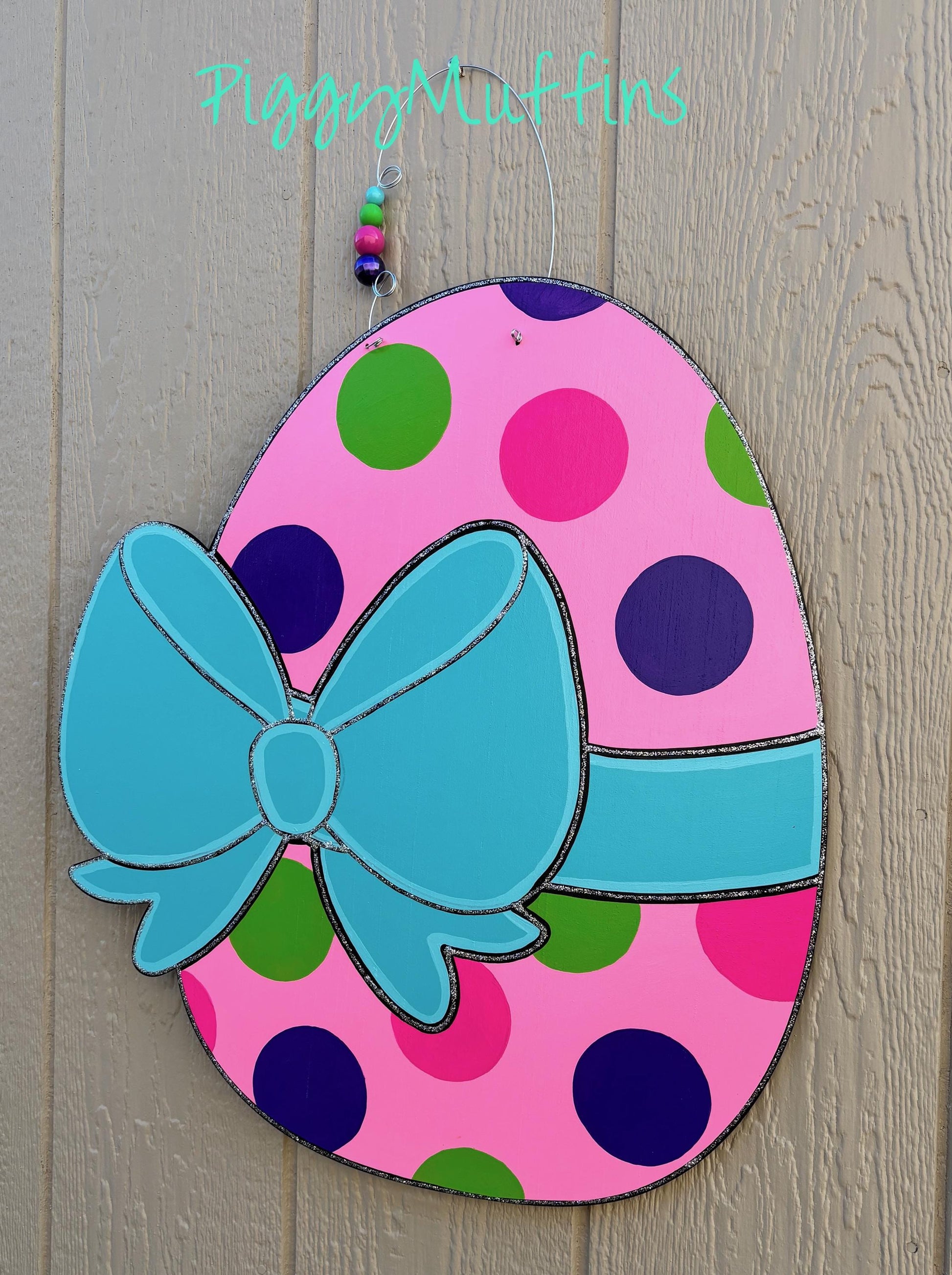 Get ready for the Easter bunny with this cute Easter Egg door hanger by PiggyMuffins. This beautiful Easter Door Hanger also makes a wonderful gift! This Spring door sign measures approximately 21 inches tall and 21 inches wide and is cut out of 1/4 inch board, sanded and painted with acrylic paint. It is sealed with a clear protective coating that prevents chipping, peeling, fading, or yellowing. It includes a sturdy wire hanger and coordinating beads and is ready to hang when delivered.