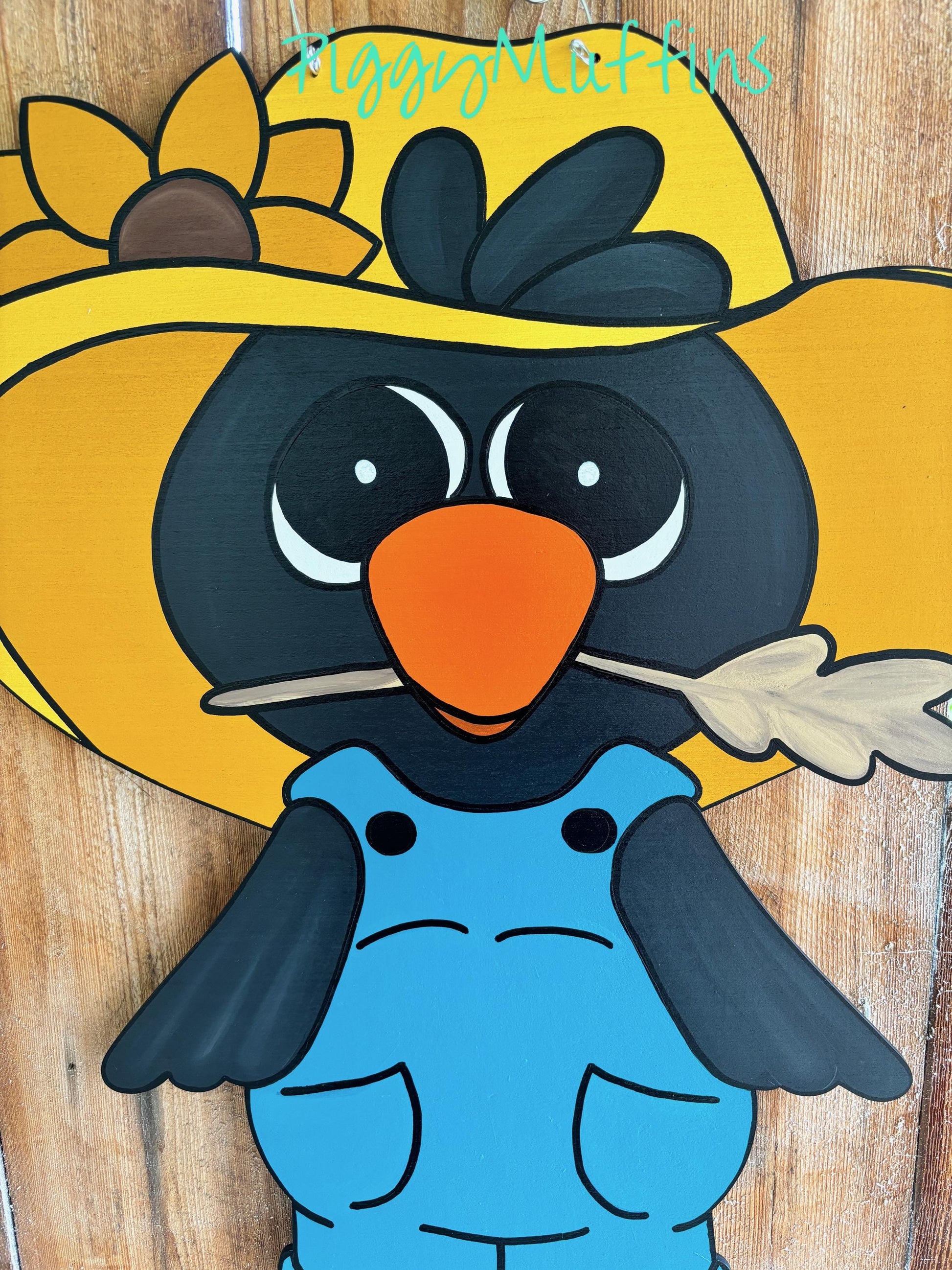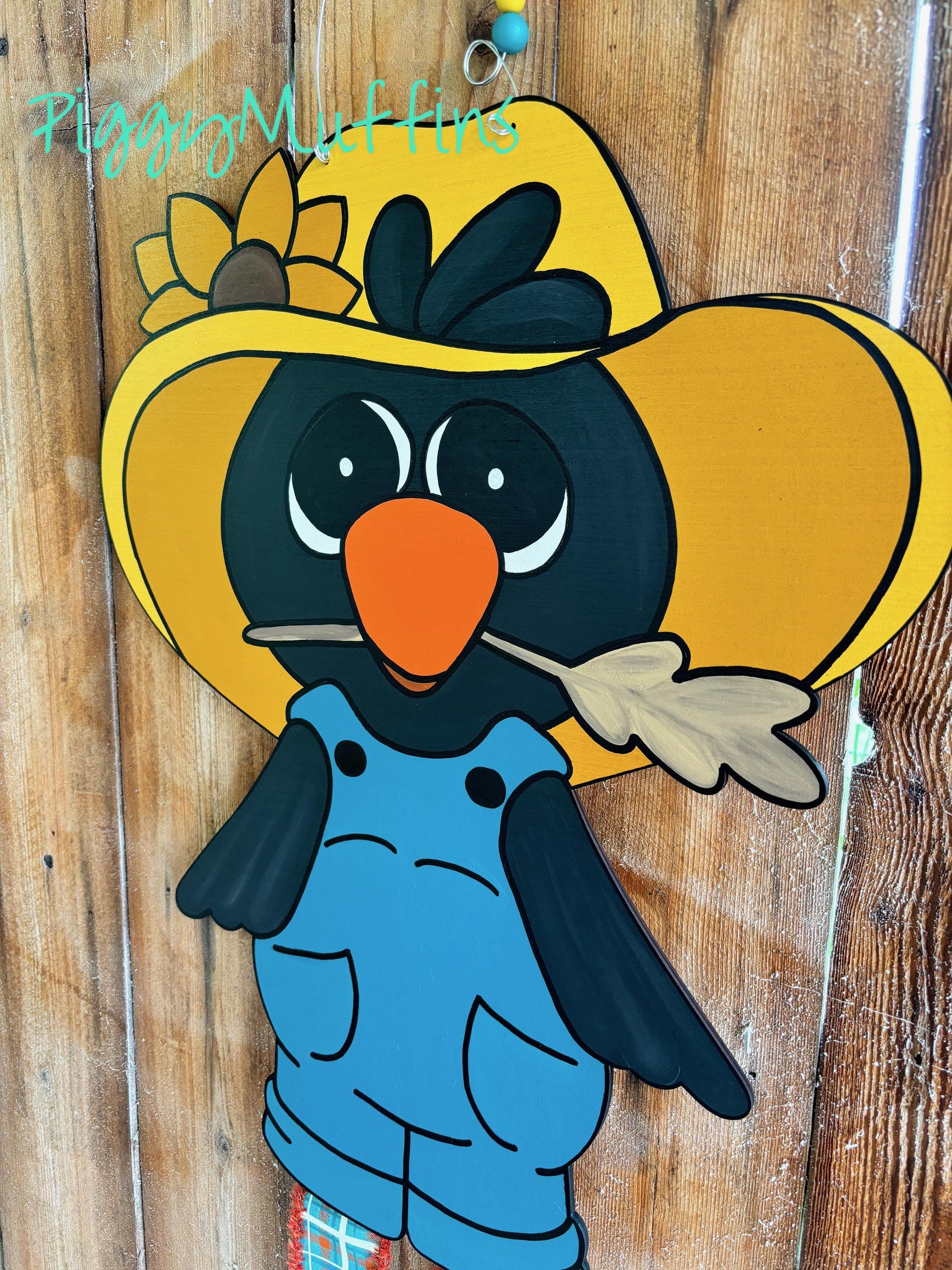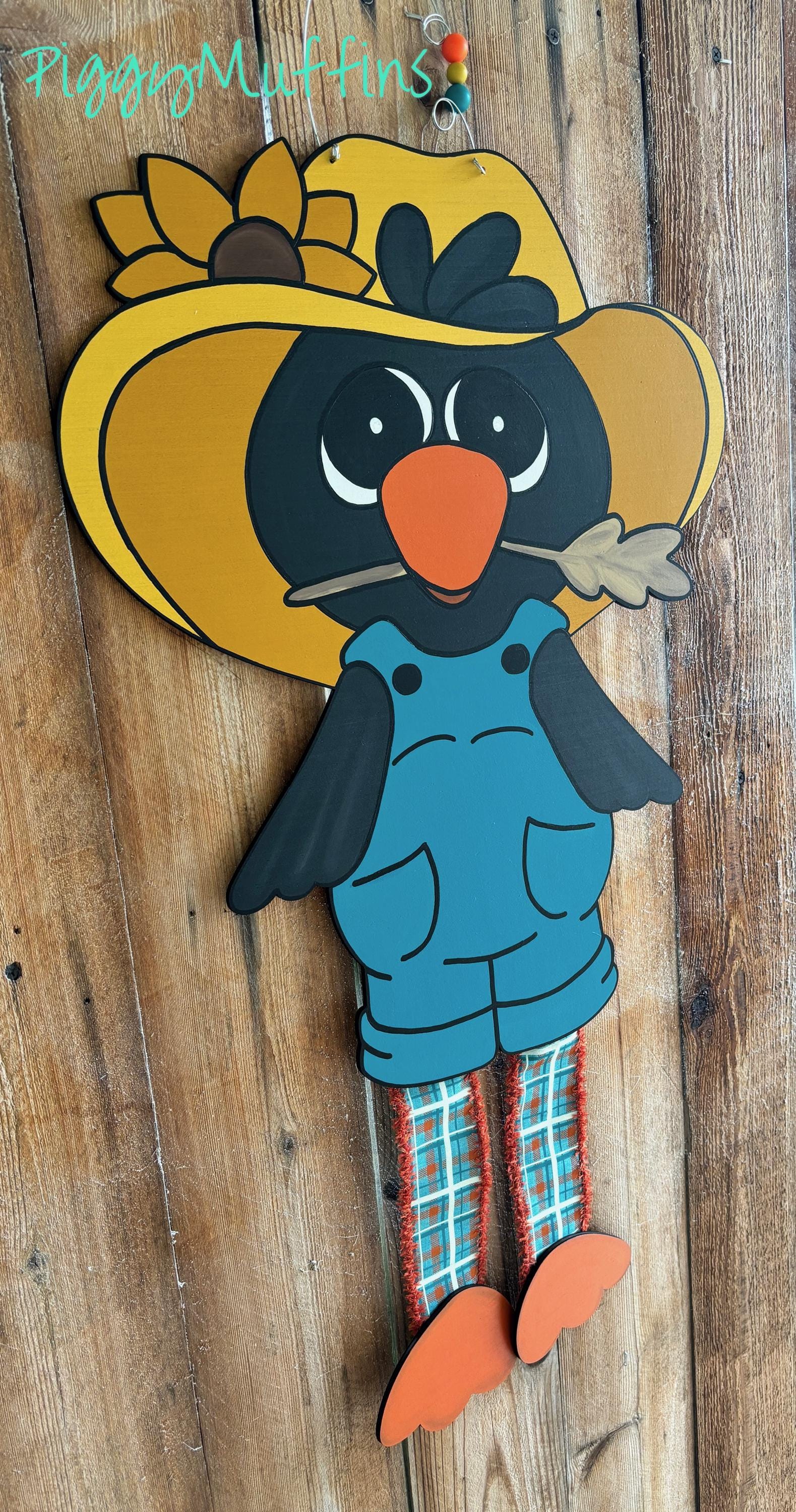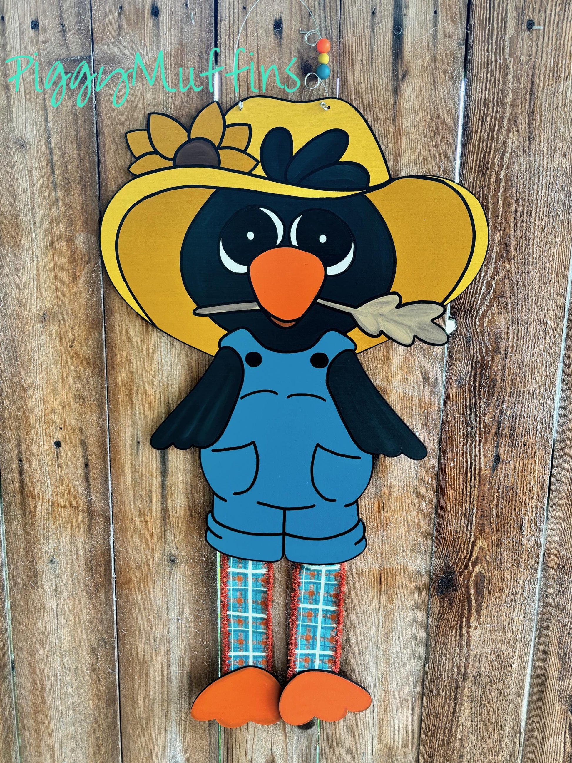 This adorable fall crow door hanger by PiggyMuffins is perfect for the fall season! Welcome your guests with this one of a kind Fall door decor! This Fall Door hanger measures approximately 20 inches in width and 36 inches in length. This sign is cut out of 1/4 inch board, sanded and painted with acrylic paint. It is sealed with a clear protective coating that prevents chipping, peeling, fading, or yellowing. It includes a sturdy wire hanger and coordinating beads, and is ready to hang when delivered. A coordinating bow can be added at checkout for an additional fee.