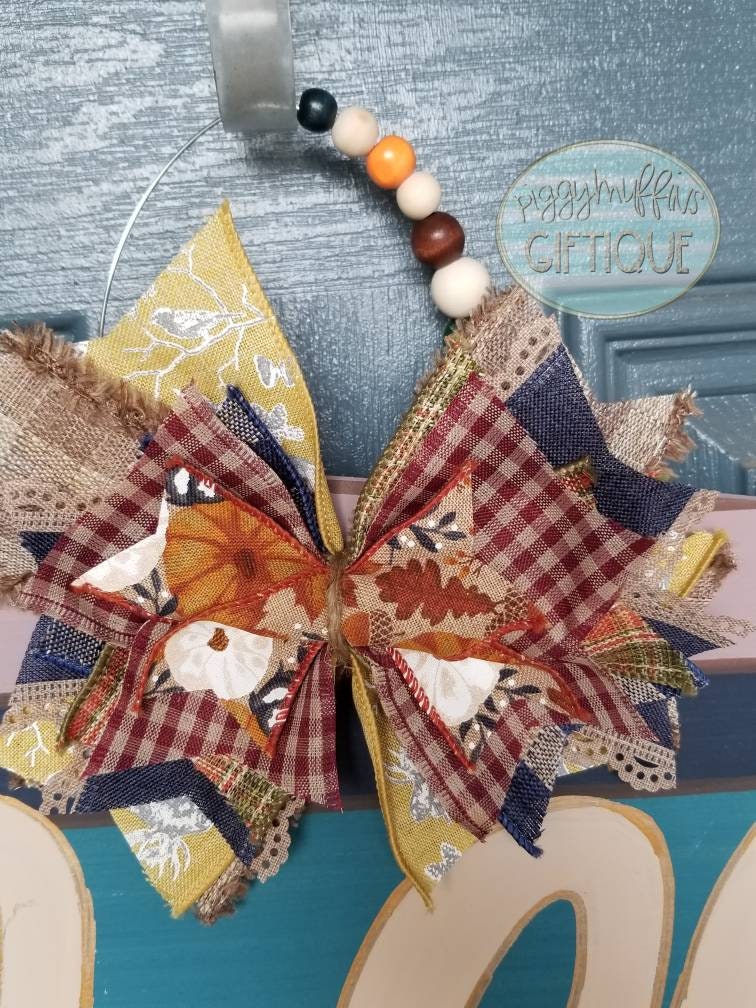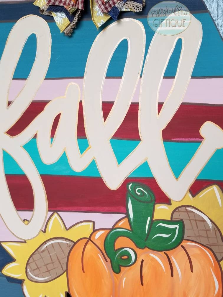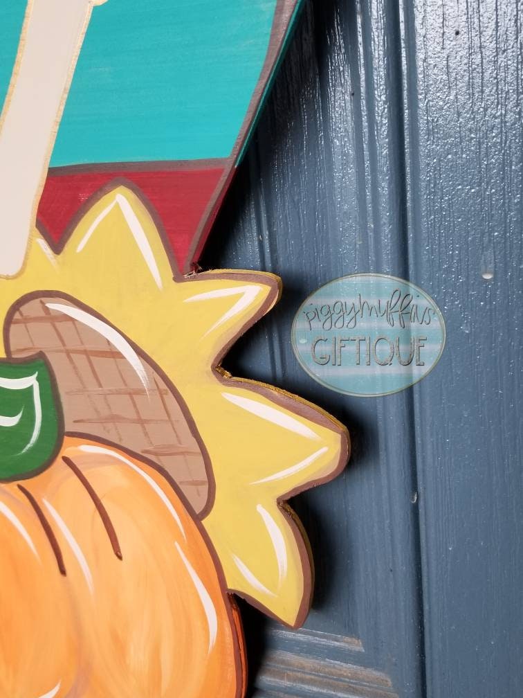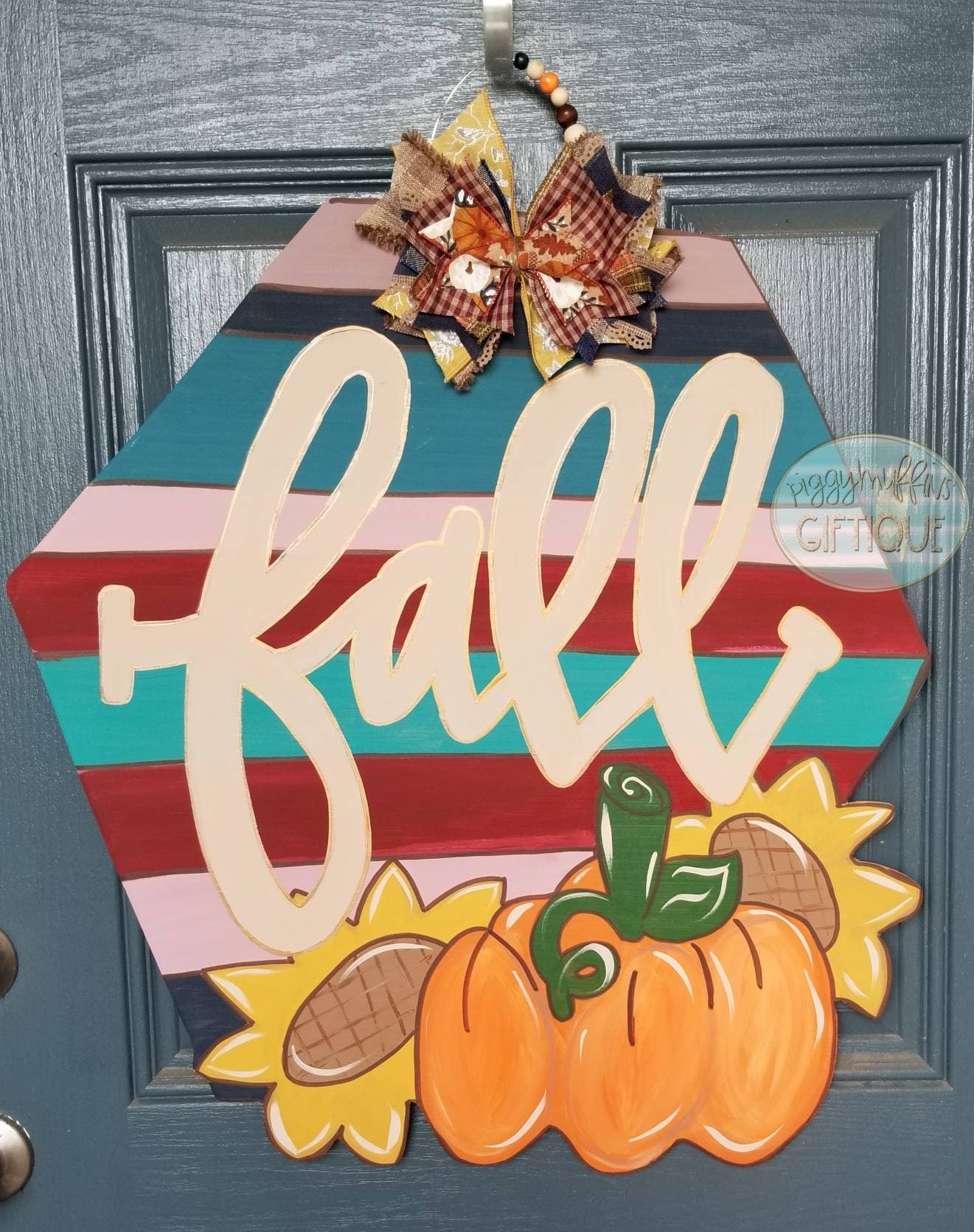 Welcome your guests through the fall season with this gorgeous Fall door hanger from PiggyMuffins! The sign measures approximately 22 inches in length and 22 inches in width. This traditional door hanger sign is cut out of 1/4 inch board, sanded and painted with acrylic paint. It is sealed with a clear protective coating that prevents chipping, peeling, fading, or yellowing. It includes a sturdy wire hanger and coordinating bow and beads, and is ready to hang when delivered.