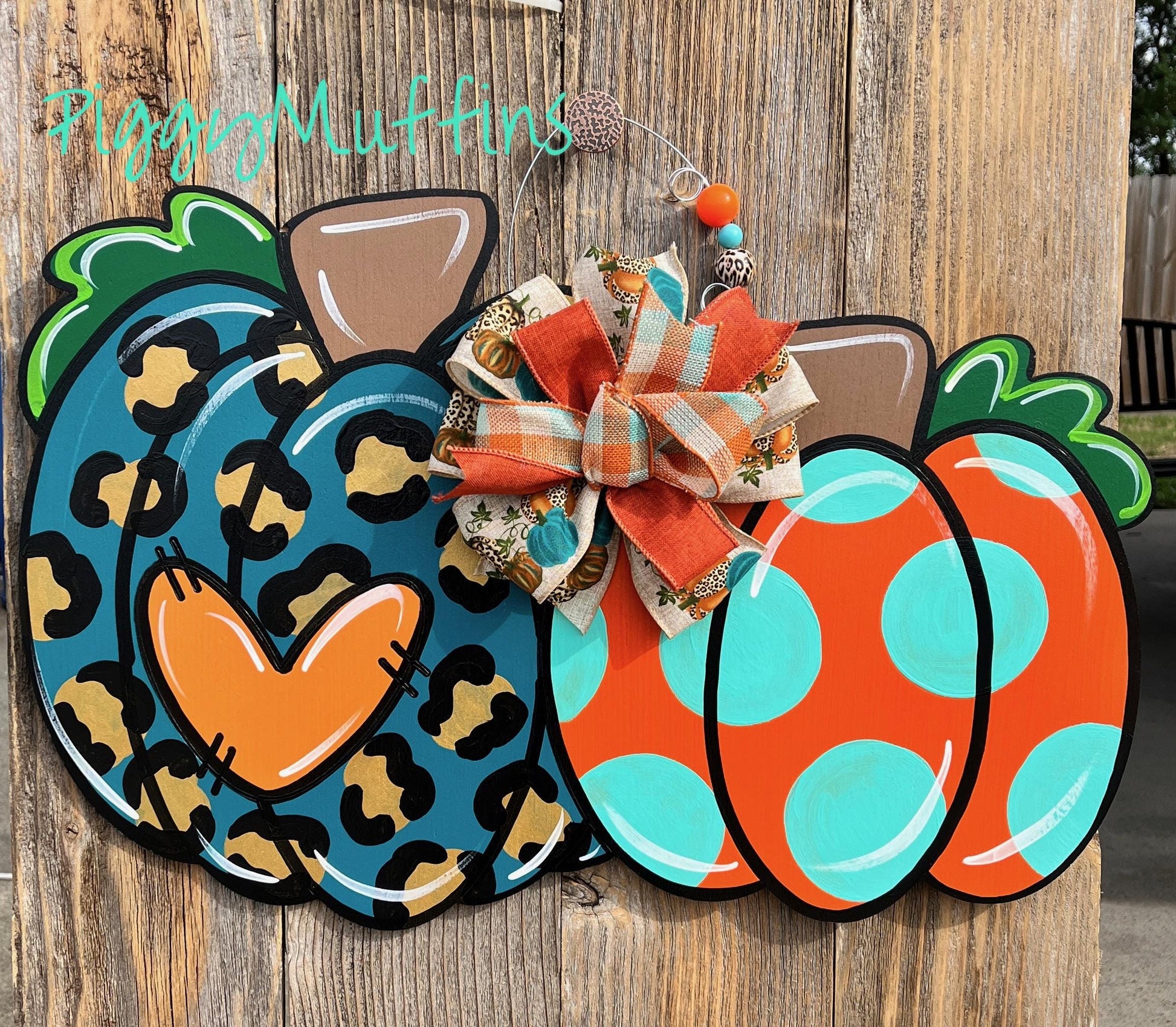 This adorable PiggyMuffins pumpkin door hanger is perfect for the fall season! Welcome your guests with this one of a kind Thanksgiving door decor! It measures approximately 20 inches in width and 20 inches in length. This sign is cut out of 1/4 inch board, sanded and painted with acrylic paint. It is sealed with a clear protective coating that prevents chipping, peeling, fading, or yellowing. It includes a sturdy wire hanger and coordinating beads, and is ready to hang when delivered.