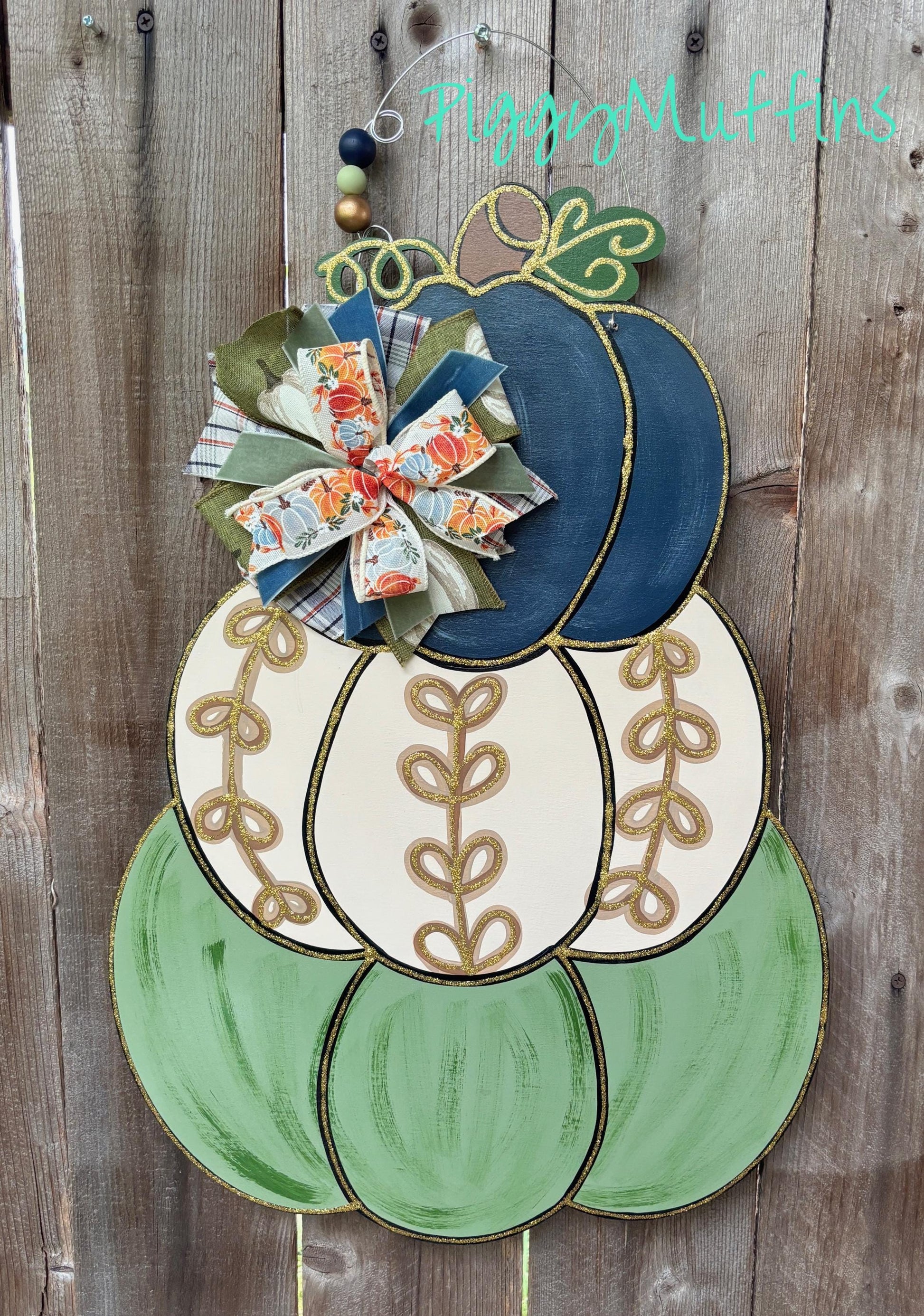 Welcome fall with this gorgeous pumpkin stack door hanger by PiggyMuffins! This Fall door hanger measures approximately 22 inches in length and 22inches in width. This sign is cut out of 1/4 inch board, sanded and painted with acrylic paint and accented with polyester glitter. It is sealed with a clear protective coating that prevents chipping, peeling, fading, or yellowing. It includes a sturdy wire hanger and coordinating bow and is ready to hang when delivered.