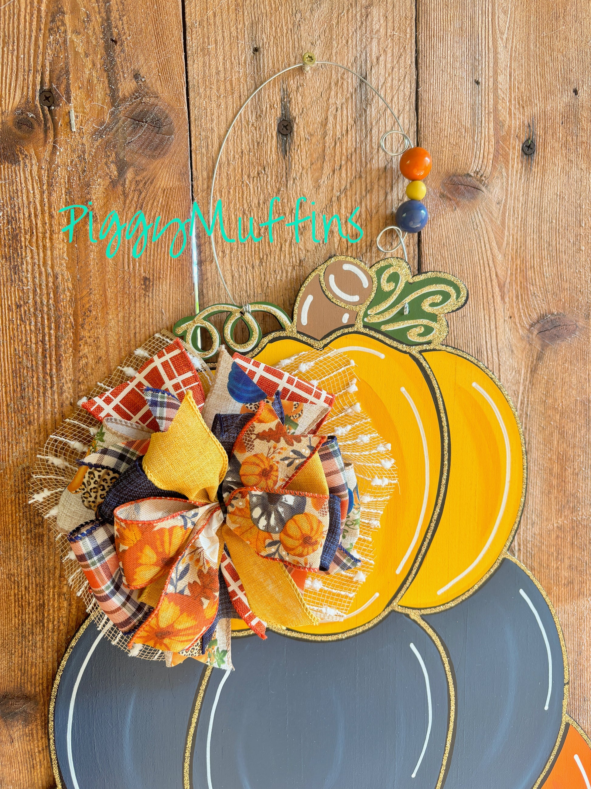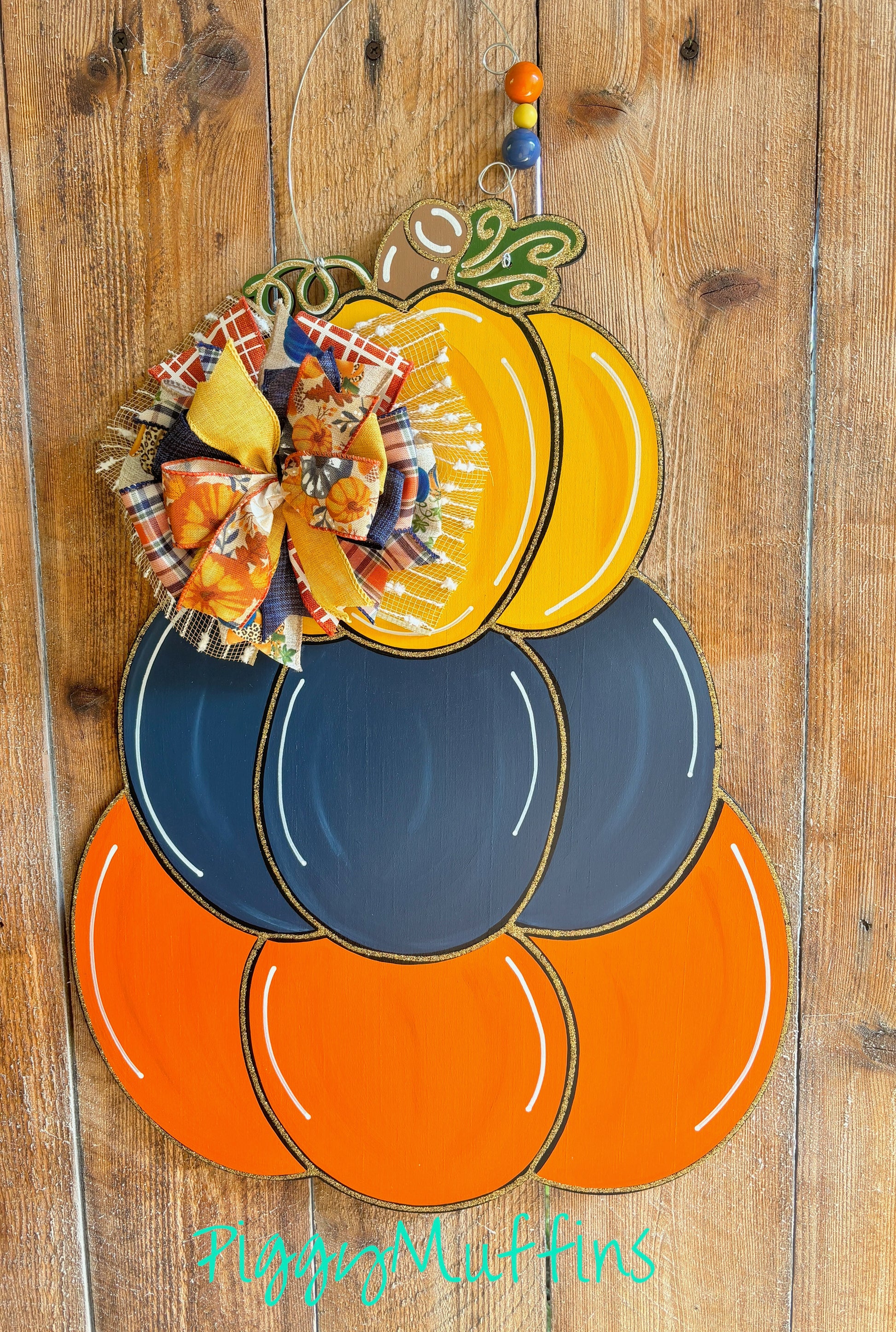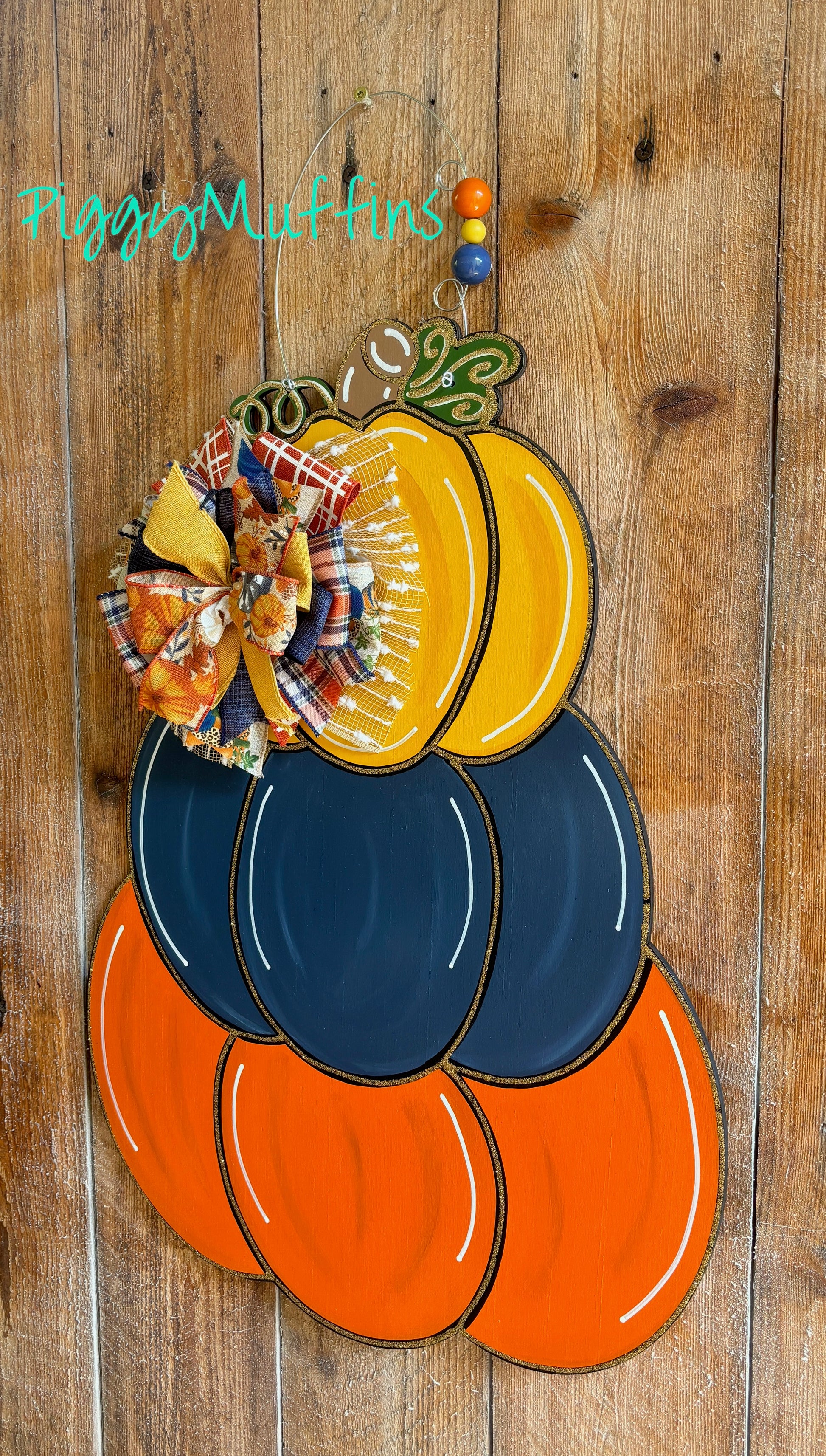 Welcome fall with this adorable pumpkin stack door hanger from PiggyMuffins! This Fall Door Hanger measures approximately 22 inches in length and 22inches in width. This orange, navy and mustard pumpkin stack is cut out of 1/4 inch board, sanded and painted with acrylic paint and accented with polyester glitter. It is sealed with a clear protective coating that prevents chipping, peeling, fading, or yellowing. It includes a sturdy wire hanger and coordinating bow and is ready to hang when delivered.