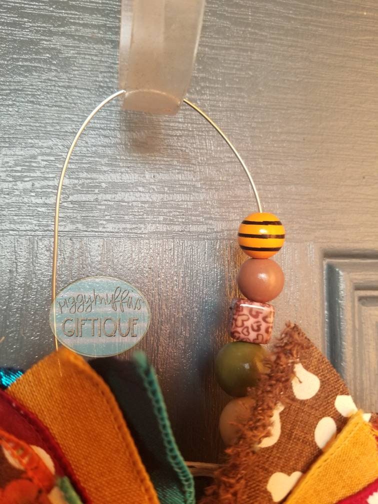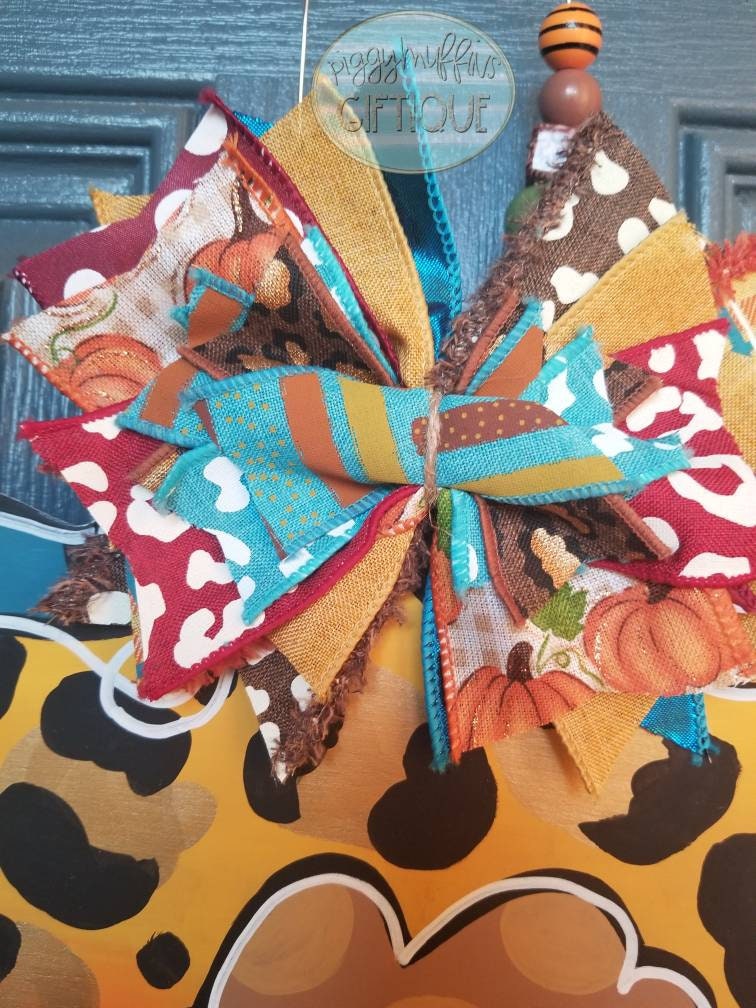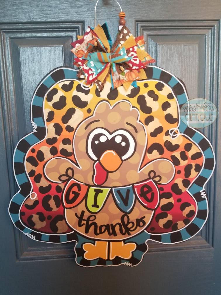 Welcome your family and friends with this adorable little Thanksgiving turkey door sign from PiggyMuffins! This Fall door hanger measures approximately 22 inches in length and 20 inches in width. This sign is hand cut out of 1/4 inch board, sanded and painted with acrylic paint and accented with polyester glitter. It is sealed with a clear protective coating that prevents chipping, peeling, fading, or yellowing. It includes a sturdy wire hanger and coordinating beads and is ready to hang when delivered. A coordinating bow can be added for an additional charge by choosing the "With Bow" option at checkout.