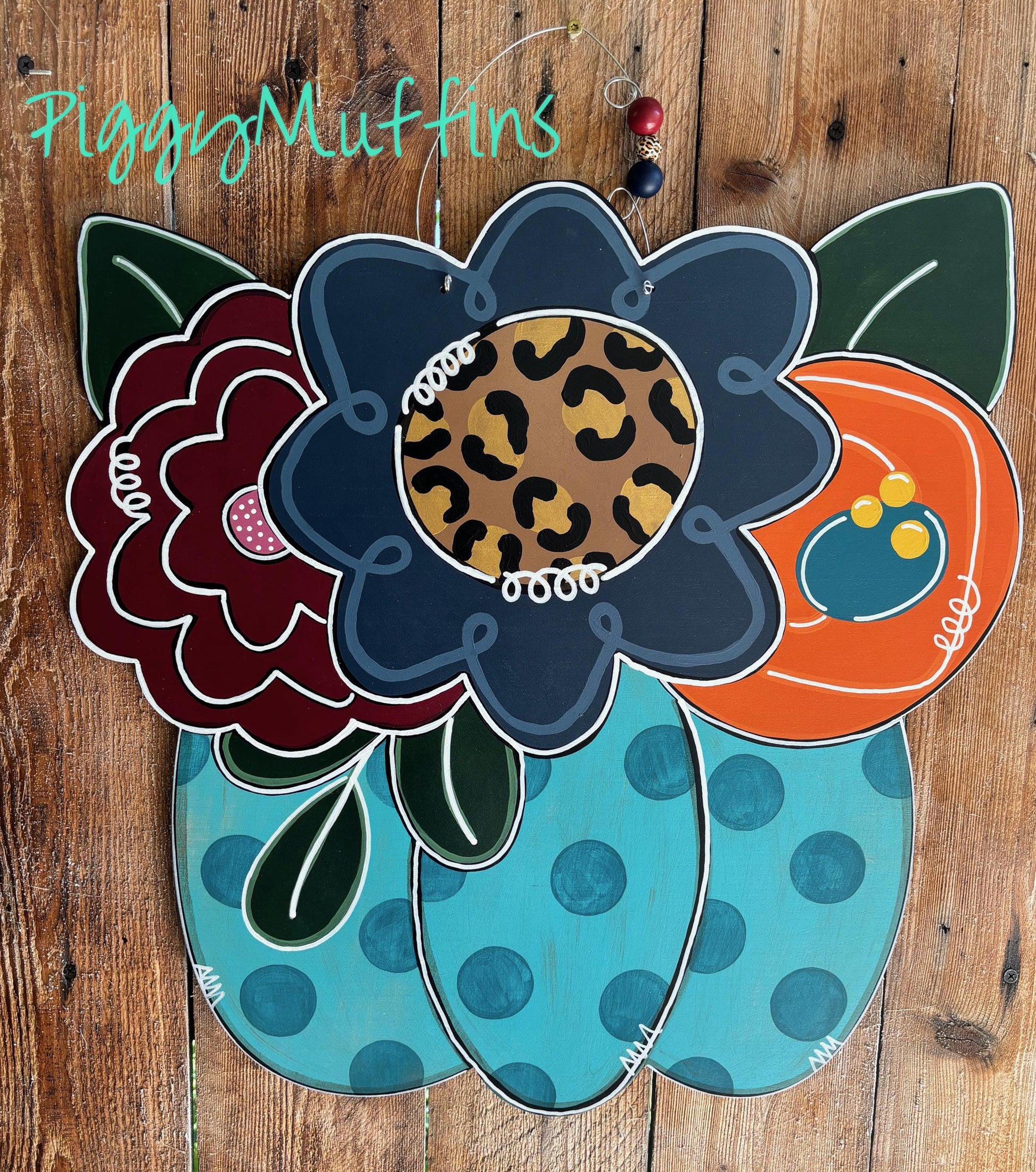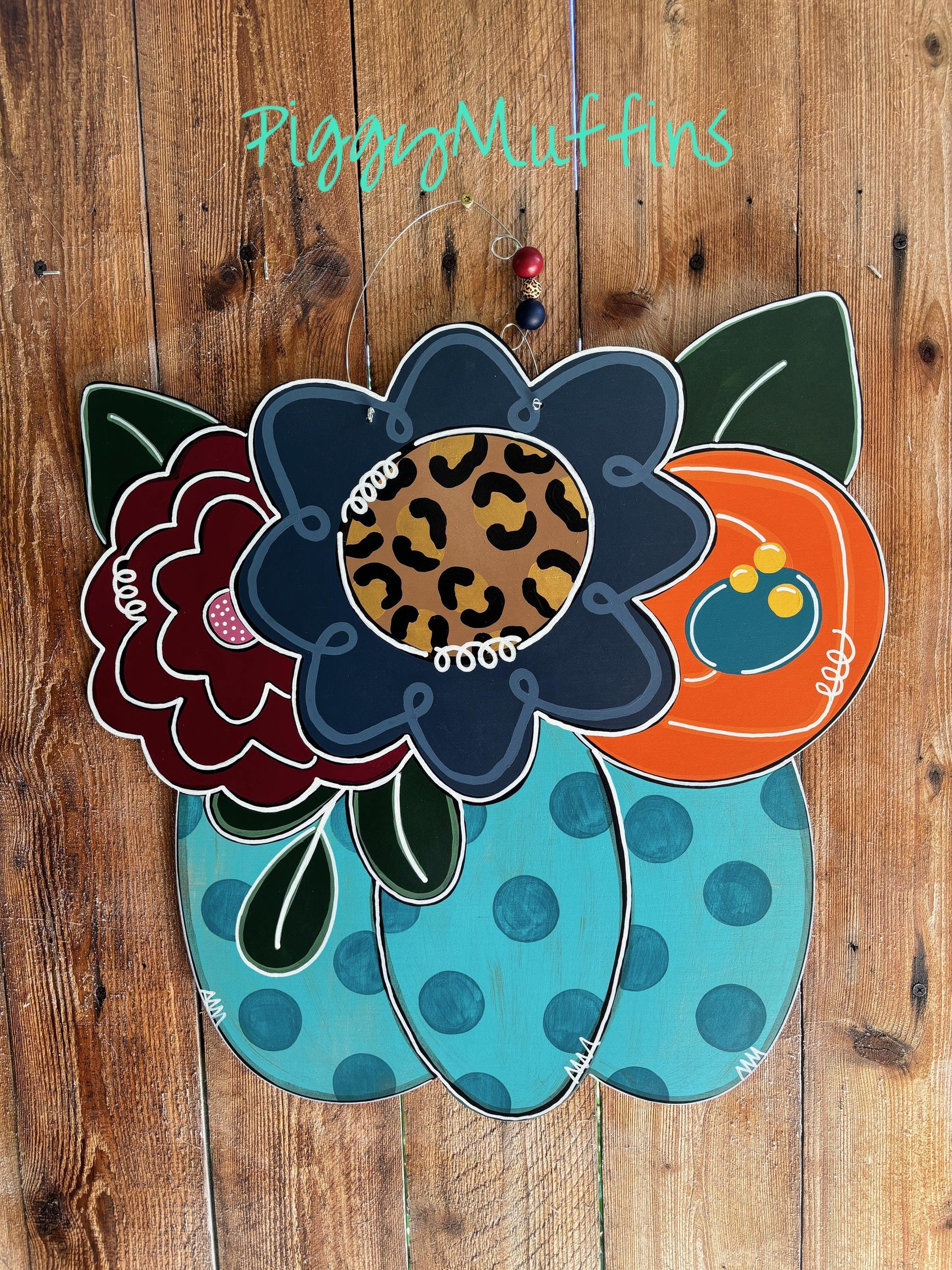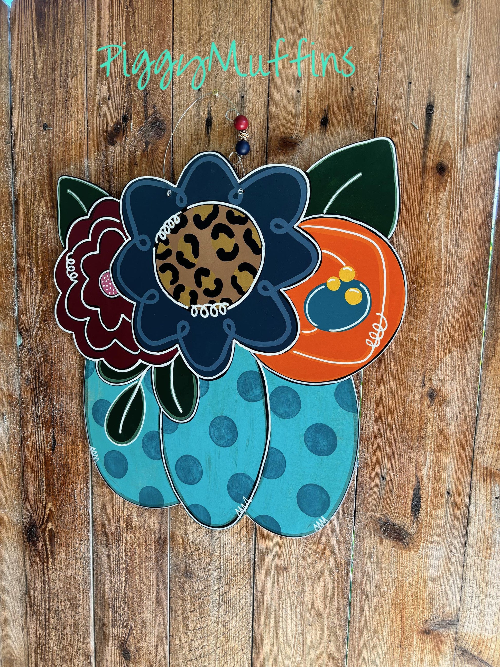 Welcome fall and be the envy of your neighborhood with this gorgeous pumpkin bouquet door hanger from PiggyMuffins! This Fall door hanger measures approximately 22 inches in length and 22 inches in width. This floral pumpkin sign is hand cut out of 1/4 inch board, sanded and painted with acrylic paint. It is sealed with a clear protective coating that prevents chipping, peeling, fading, or yellowing. It includes a sturdy wire hanger and coordinating beads and is ready to hang when delivered. A coordinating bow can be added for an additional charge by choosing the "With Bow" option at checkout.