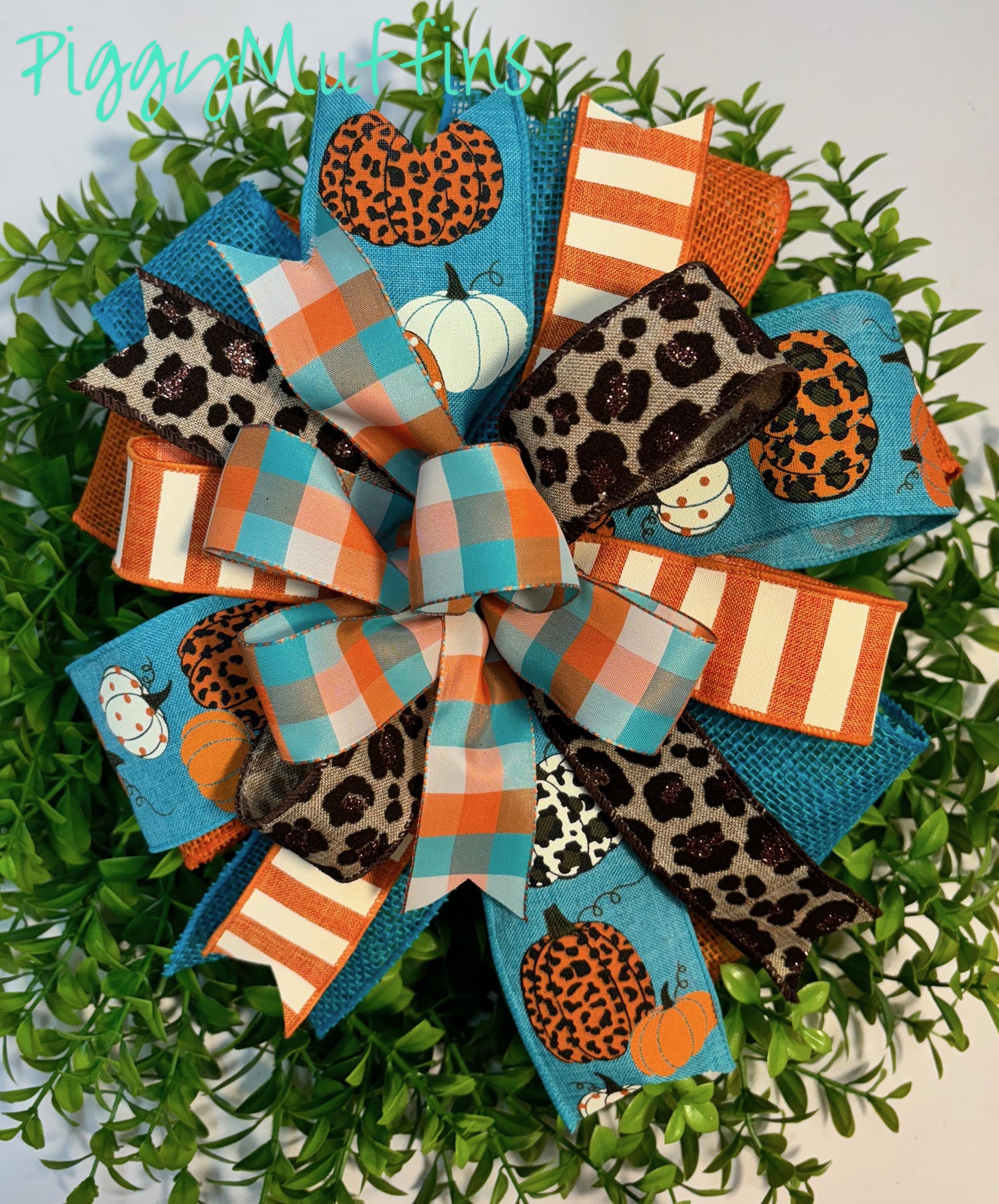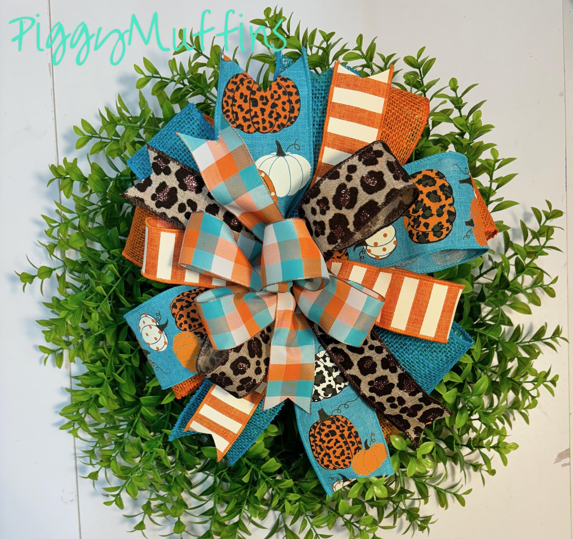 π Add a gorgeous pop of color to your home decor with this Orange, Turquoise and Leopard Print Fall Wreath Bow. It is the perfect addition to any pre-made greenery wreath or as a beautiful bow for a Fall door hanger or Thanksgiving decor!