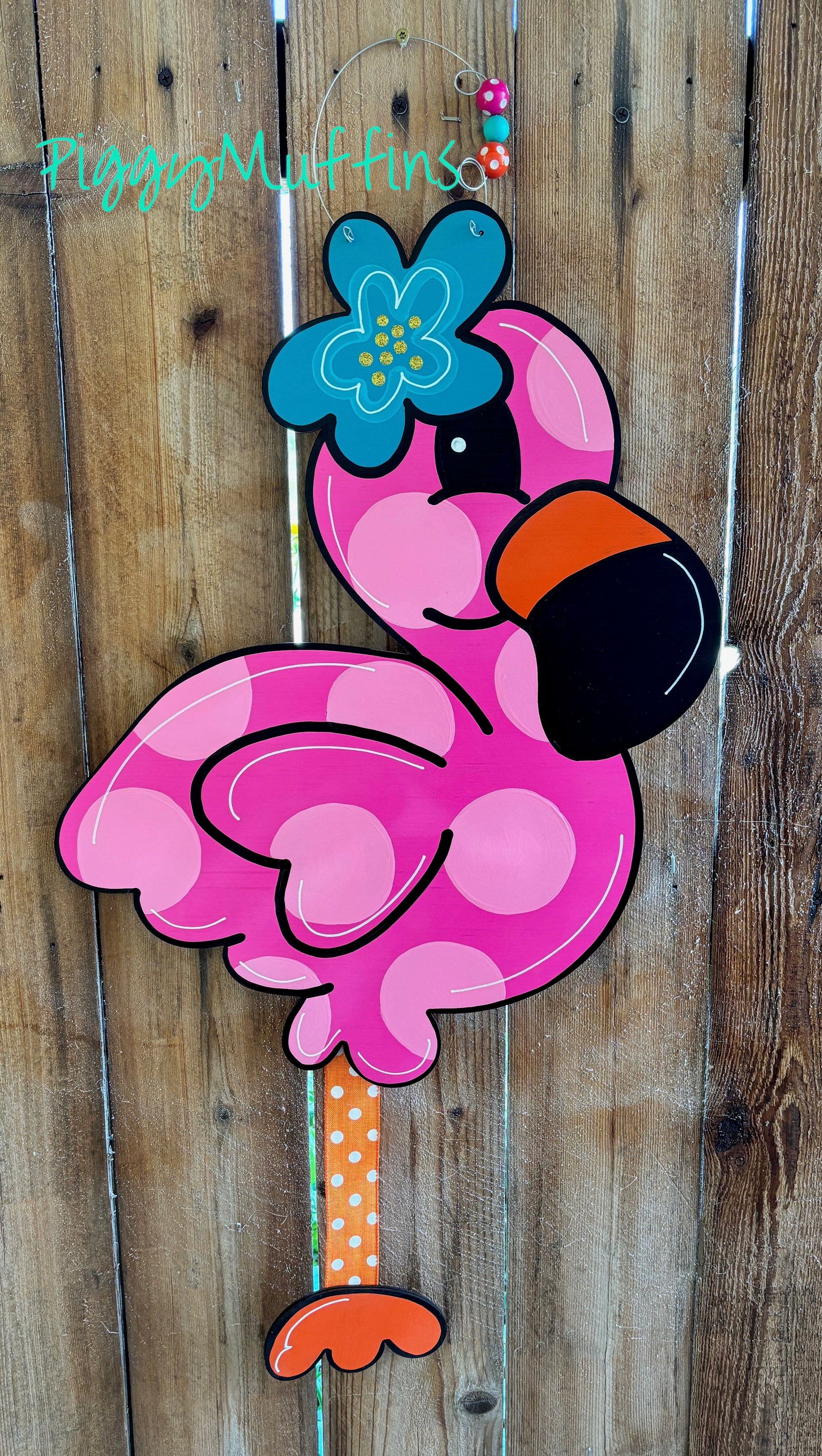 How cute is she?? This girl is perfect all summer long! Measuring approximately 36 inches in length and 20 inches in width, this Flamingo Door Hanger by PiggyMuffins is cut out of 1/4 inch board, sanded and painted with acrylic paint. It is sealed with a clear protective coating that prevents chipping, peeling, fading, or yellowing. It includes a sturdy wire hanger with coordinating beads and is ready to hang when delivered. A coordinating bow can be added for an additional charge by choosing the "With Bow" option at checkout.