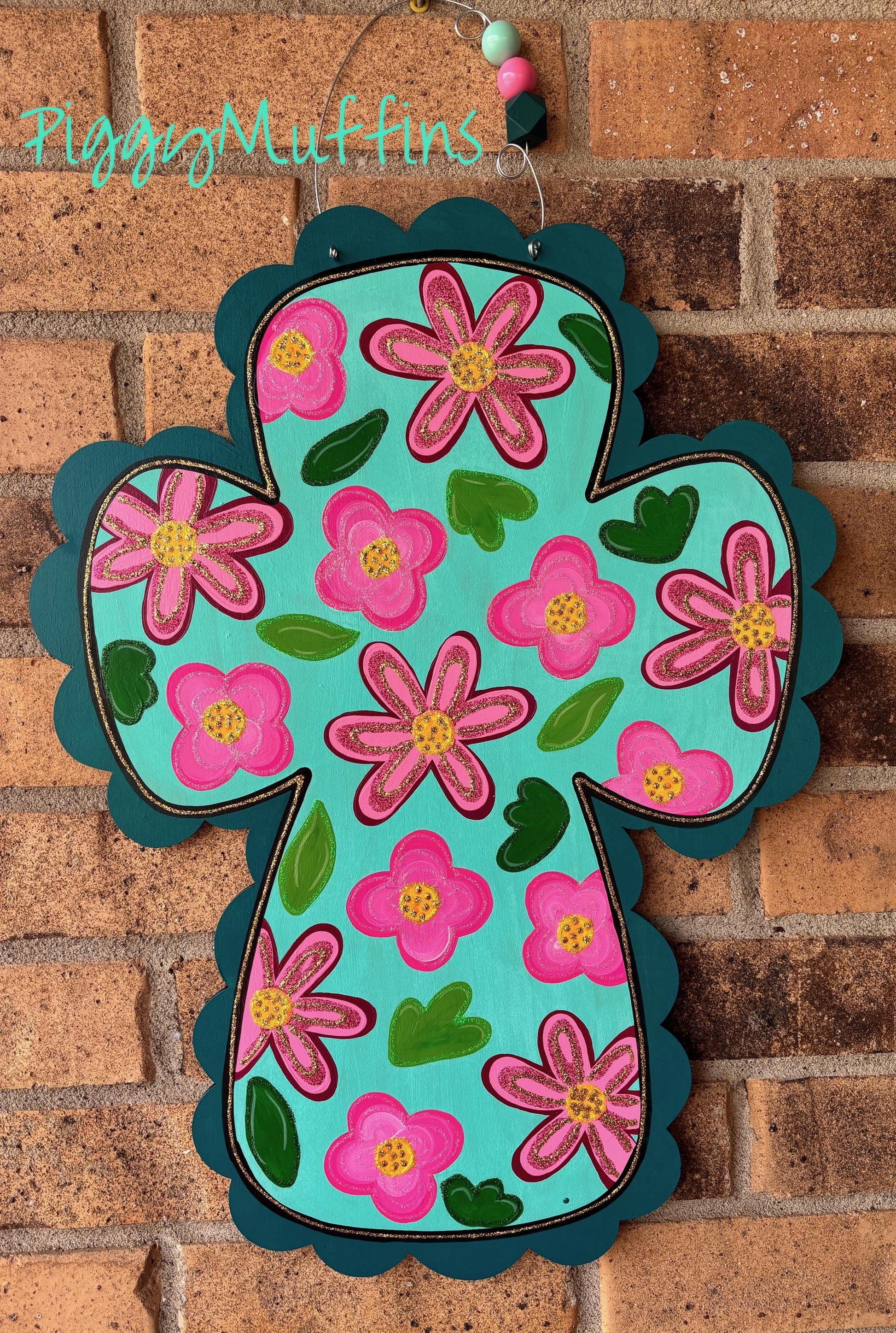 The gorgeous Floral Cross Door Hanger is a beautiful way to add spirit and faith to your home and decor. This Sring cross door hanger measures approximately 20 inches in length and 17 inches in width. This Easter Door Hanger is cut out of 1/4 inch MDF board, sanded and painted with acrylic paint. It is sealed with a clear protective coating that prevents chipping, peeling, fading, or yellowing. It includes a sturdy wire hanger and coordinating beads and is ready to hang when delivered. A coordinating bow can be added for an additional charge by choosing the "With Bow" option at checkout.