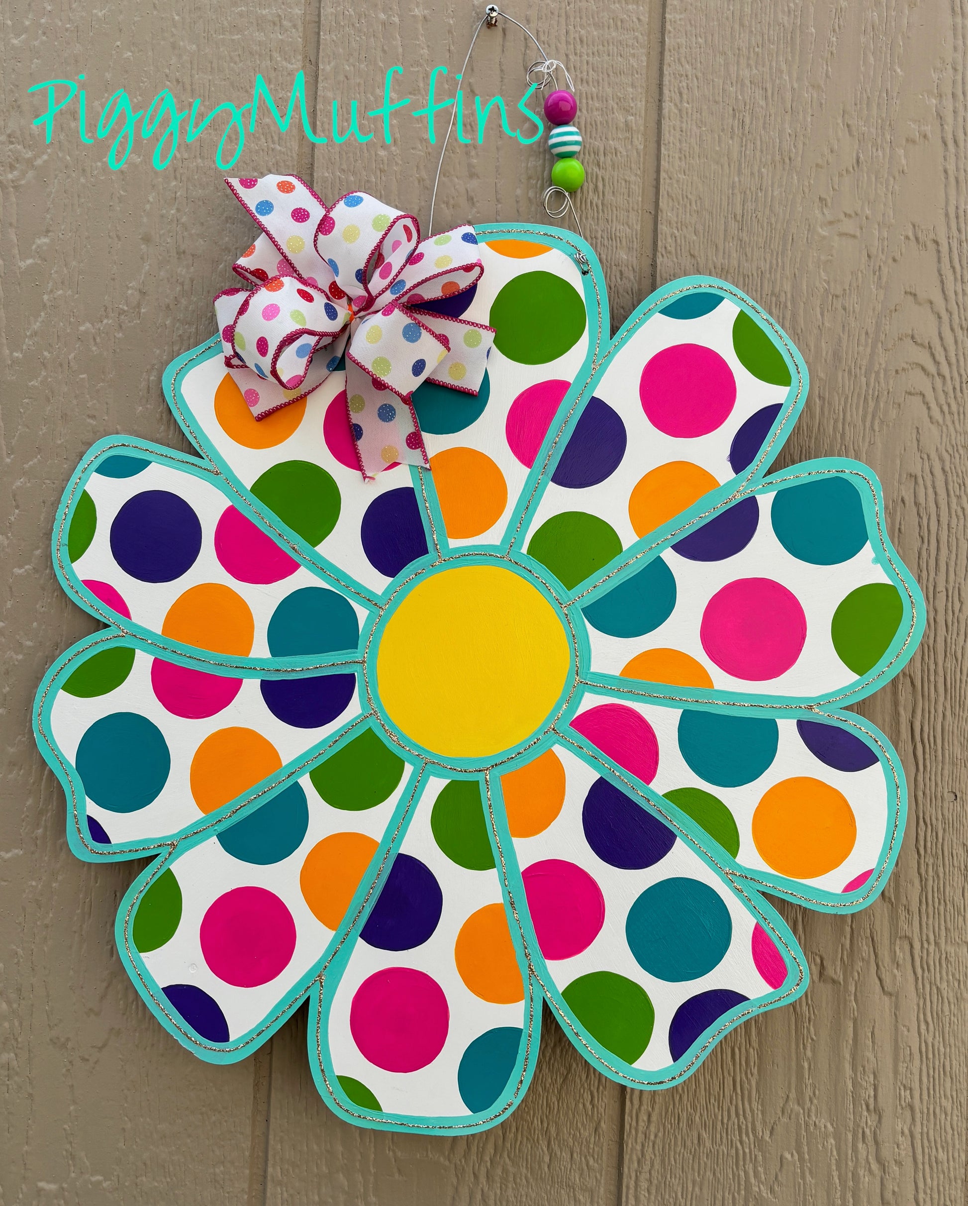 Welcome spring with this gorgeous flower door hanger by PiggyMuffins! This bright Spring floral door hanger measures approximately 22 inches in length and 22 inches in width. This sign is cut out of 1/4 inch board, sanded and painted with acrylic paint and accented with polyester glitter. It is sealed with a clear protective coating that prevents chipping, peeling, fading, or yellowing. It includes a sturdy wire hanger and coordinating and is ready to hang when delivered.