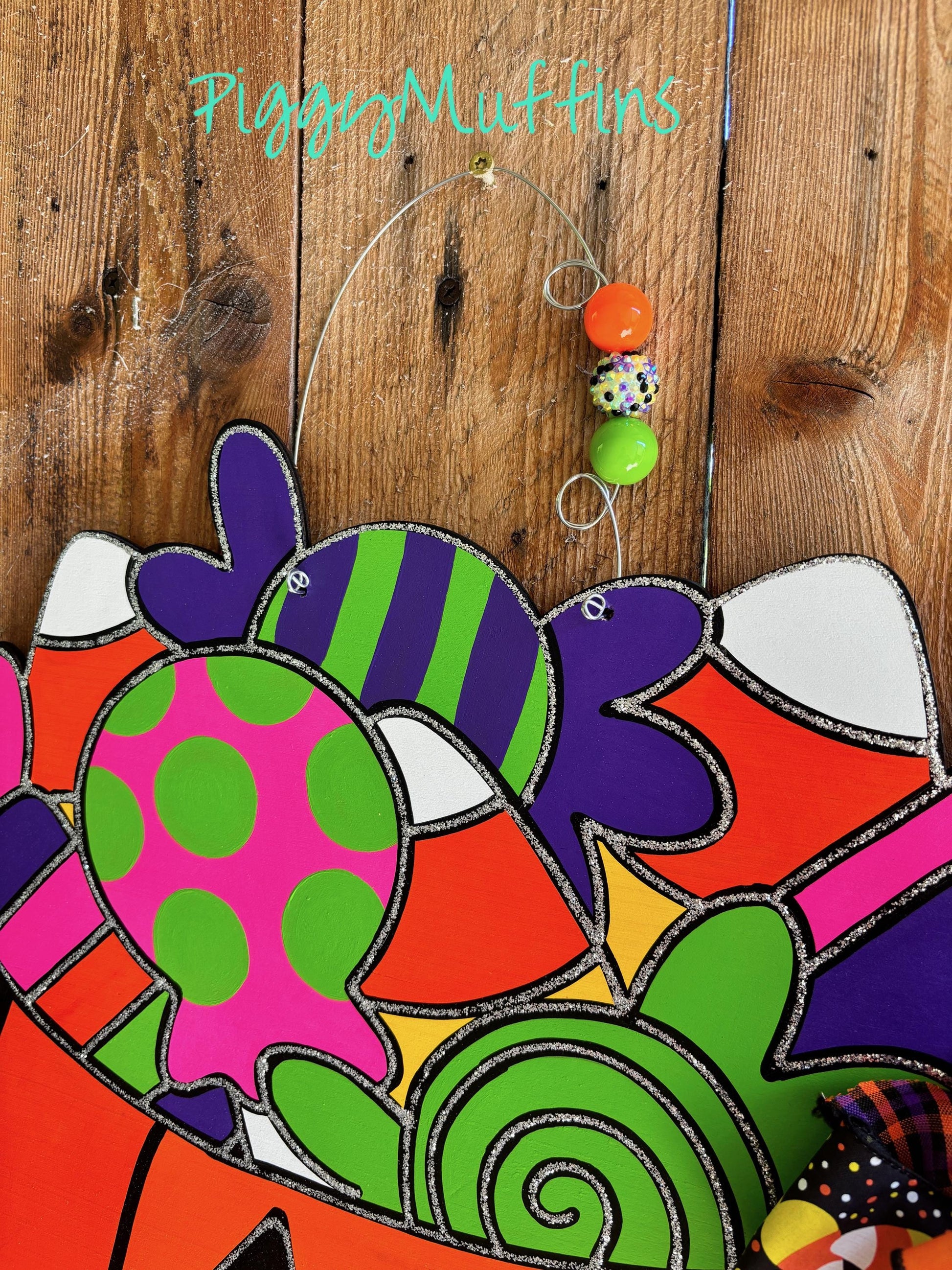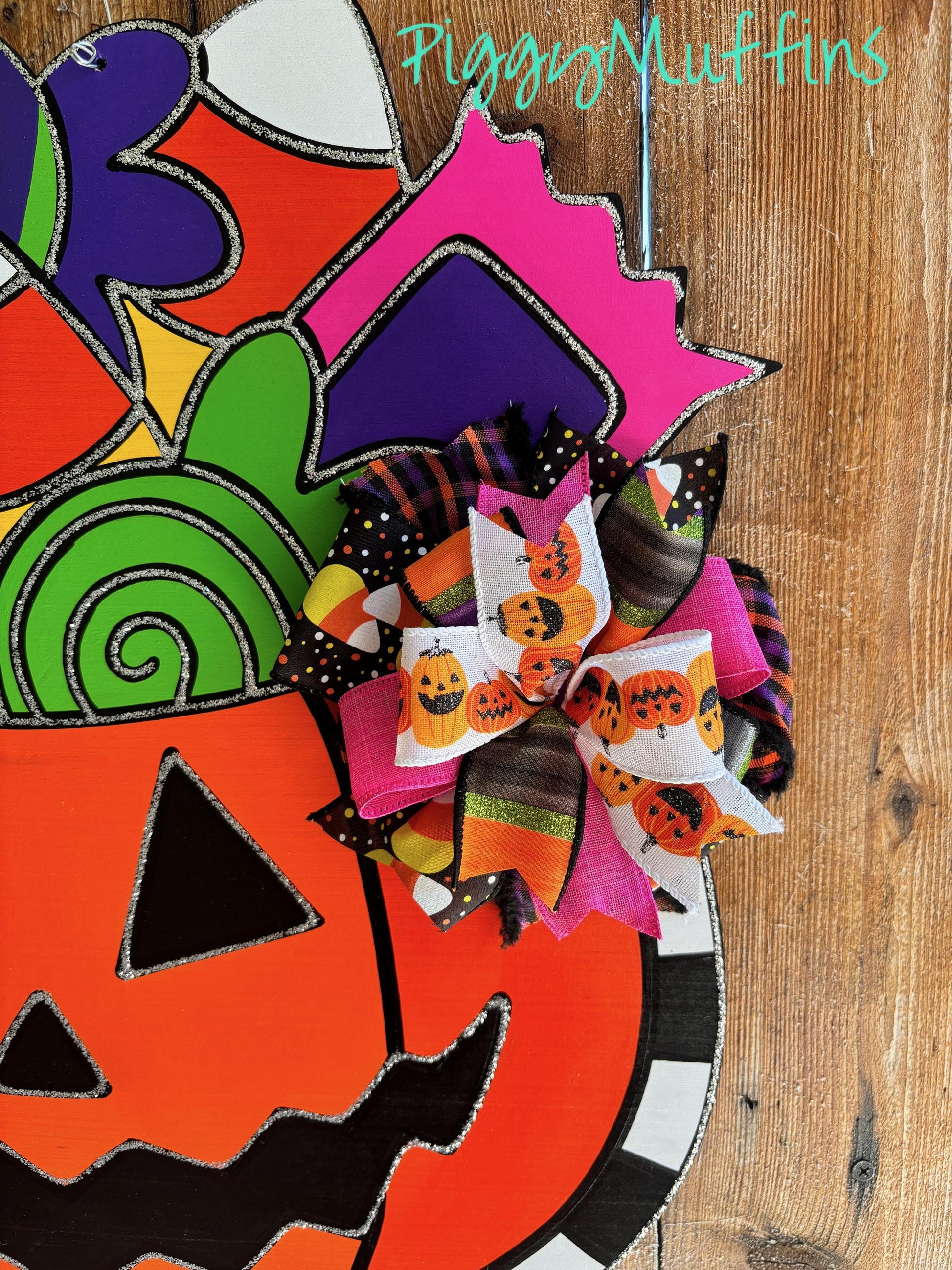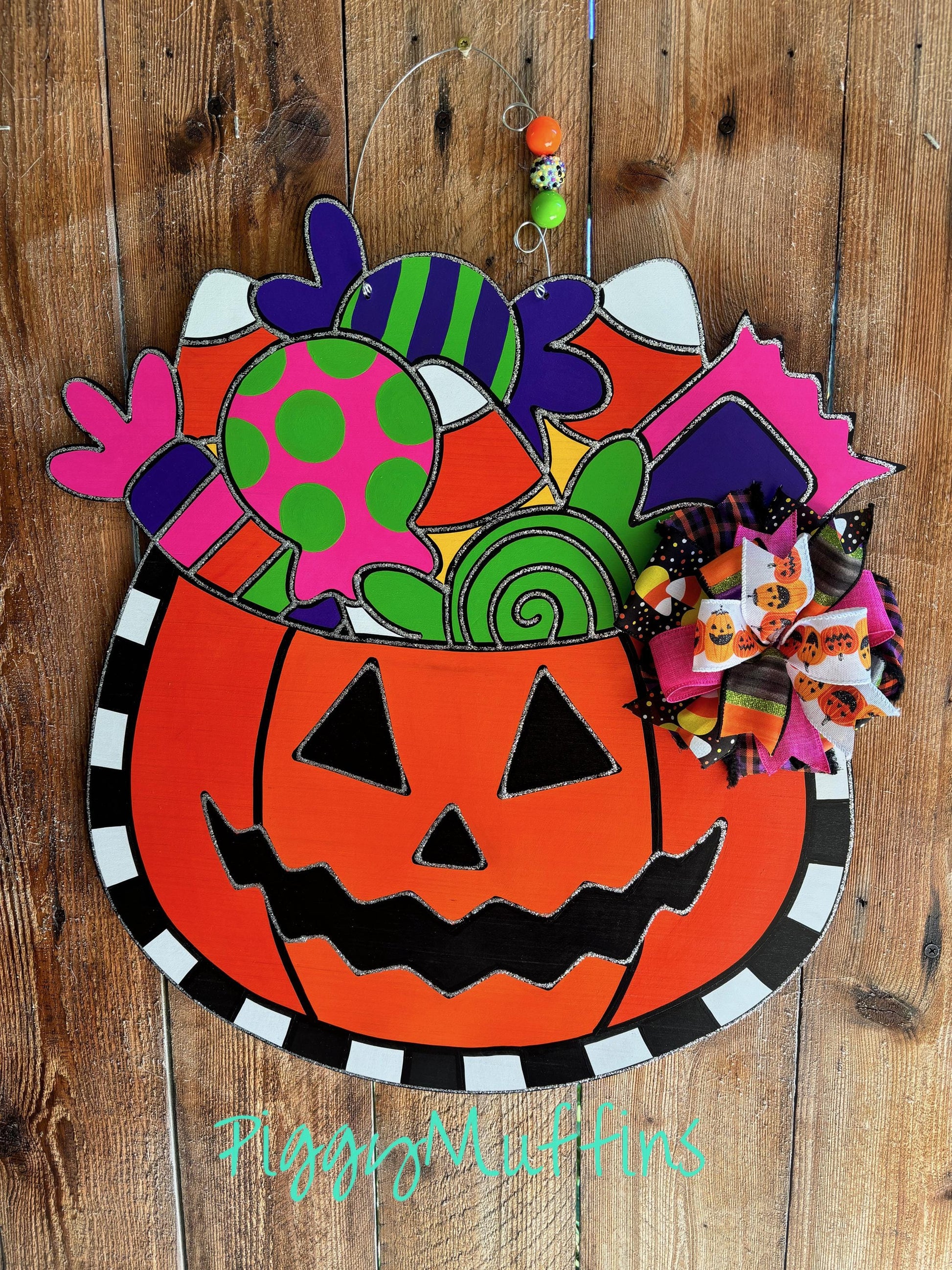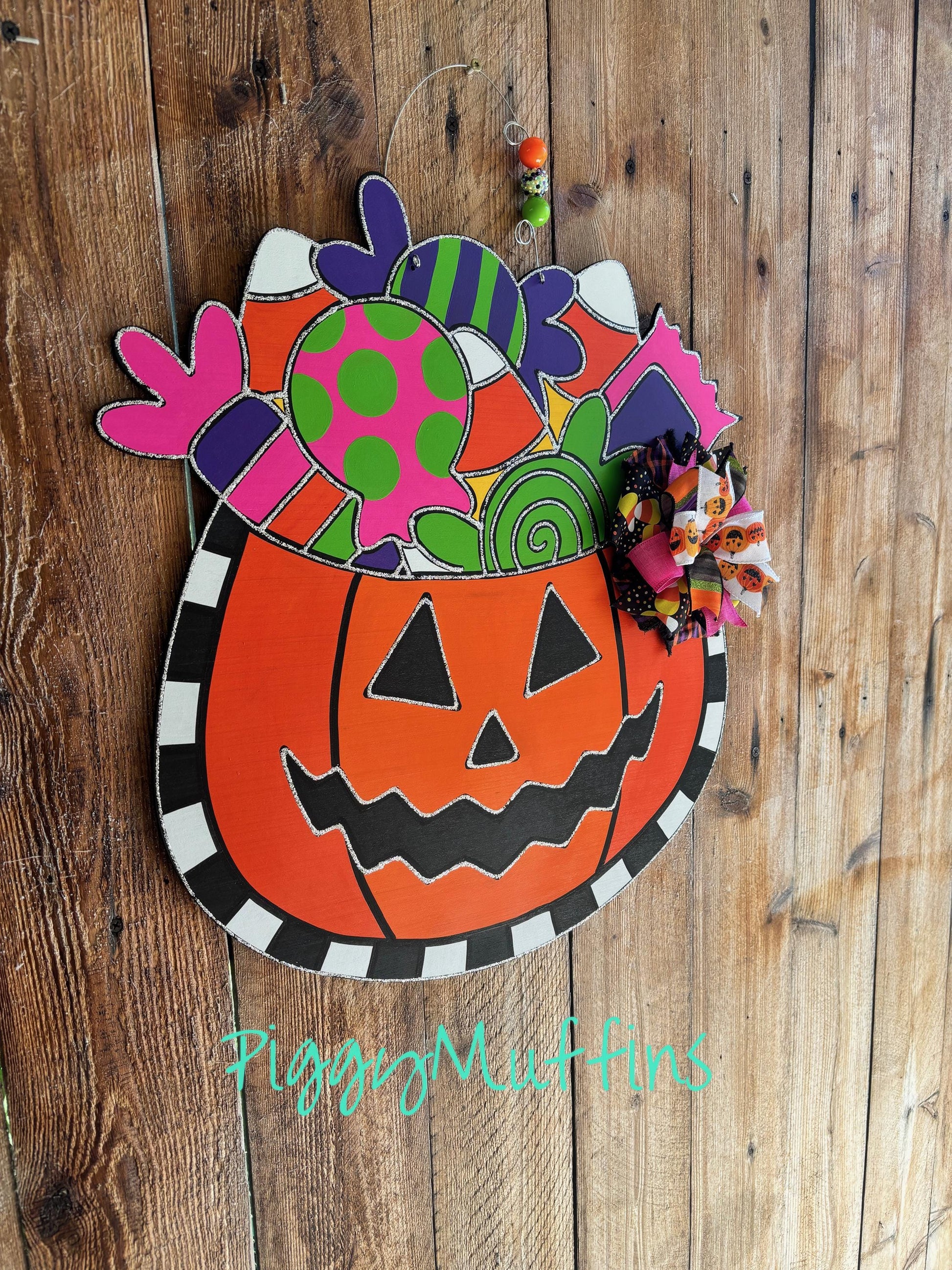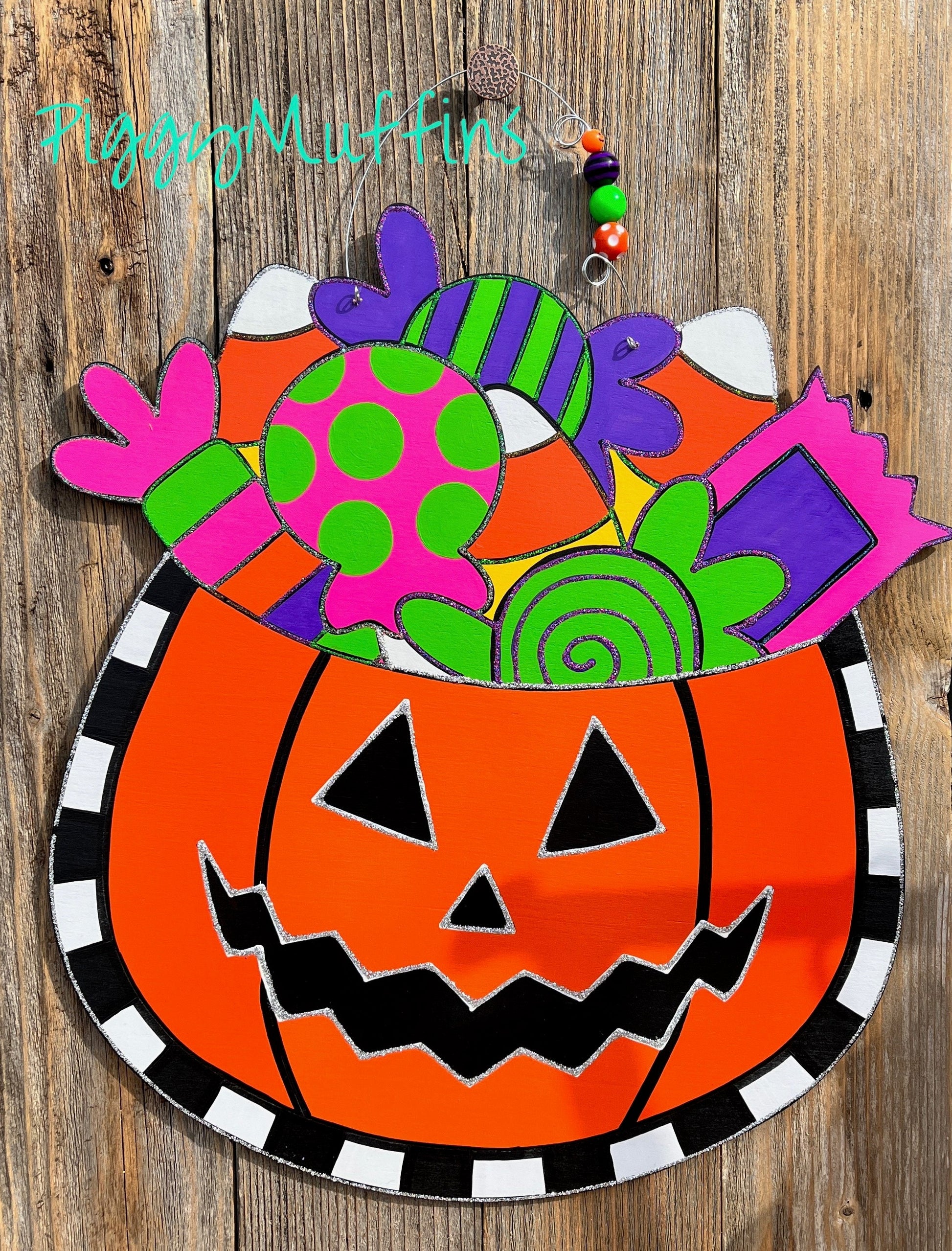 This adorable Jack-o-Lantern door hanger by PiggyMuffins is perfect for the spooky season! Welcome your trick-or-treaters with this one of a kind Halloween door decor! It measures approximately 22 inches in length and 22 inches in width. This sign is cut out of 1/4 inch board, sanded and painted with acrylic paint and accented with polyester glitter. It is sealed with a clear protective coating that prevents chipping, peeling, fading, or yellowing. It includes a sturdy wire hanger and coordinating beads, and is ready to hang when delivered.