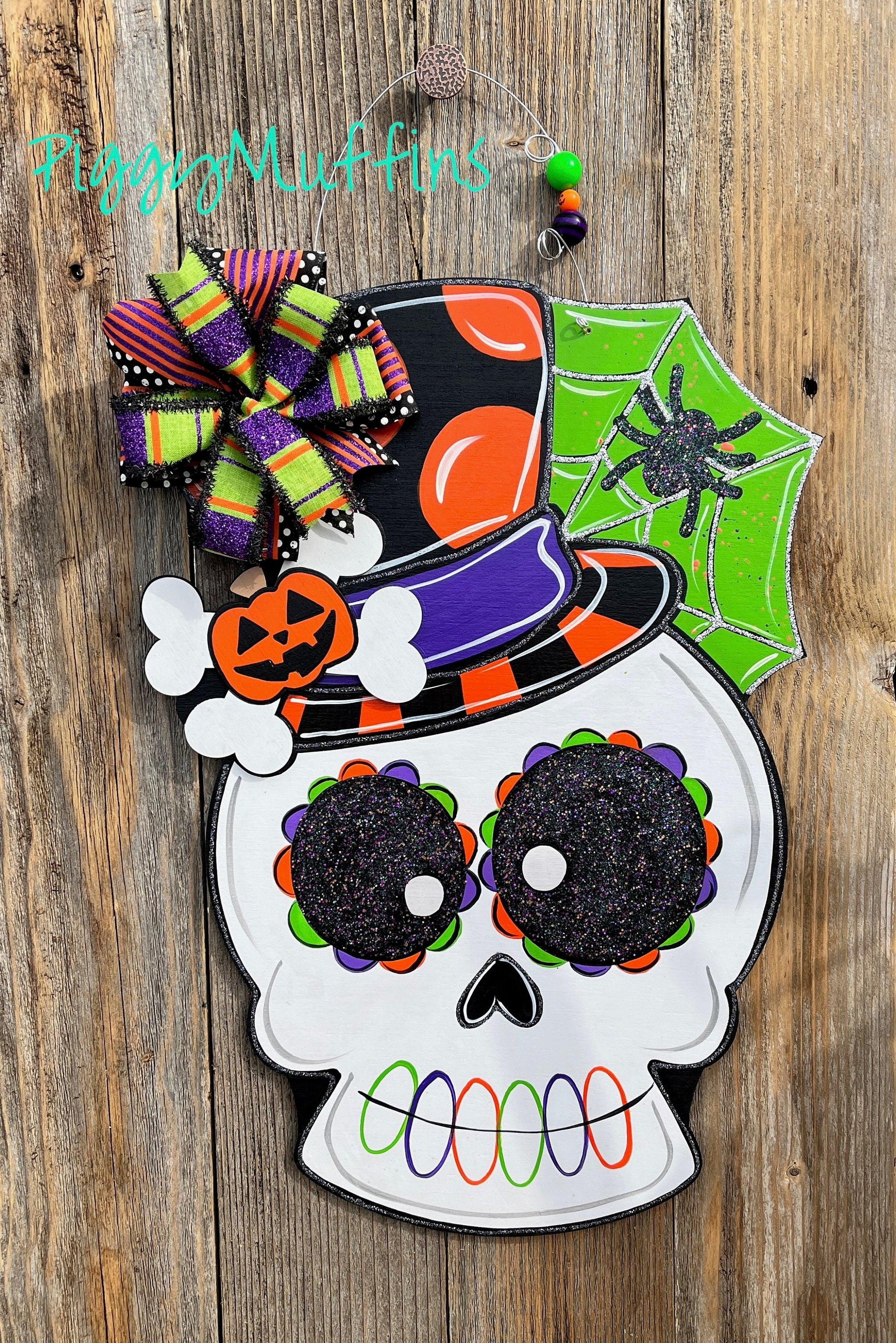 This adorable spooky skull door hanger by PiggyMuffins is perfect for the spooky season! Welcome your trick-or-treaters with this one of a kind Halloween door decor! It measures approximately 22 inches in length and 22 inches in width. This sign is cut out of 1/4 inch board, sanded and painted with acrylic paint and accented with polyester glitter. It is sealed with a clear protective coating that prevents chipping, peeling, fading, or yellowing. It includes a sturdy wire hanger and coordinating beads, and is ready to hang when delivered. A coordinating bow can be added for an additional charge by choosing the "With Bow" option at checkout.