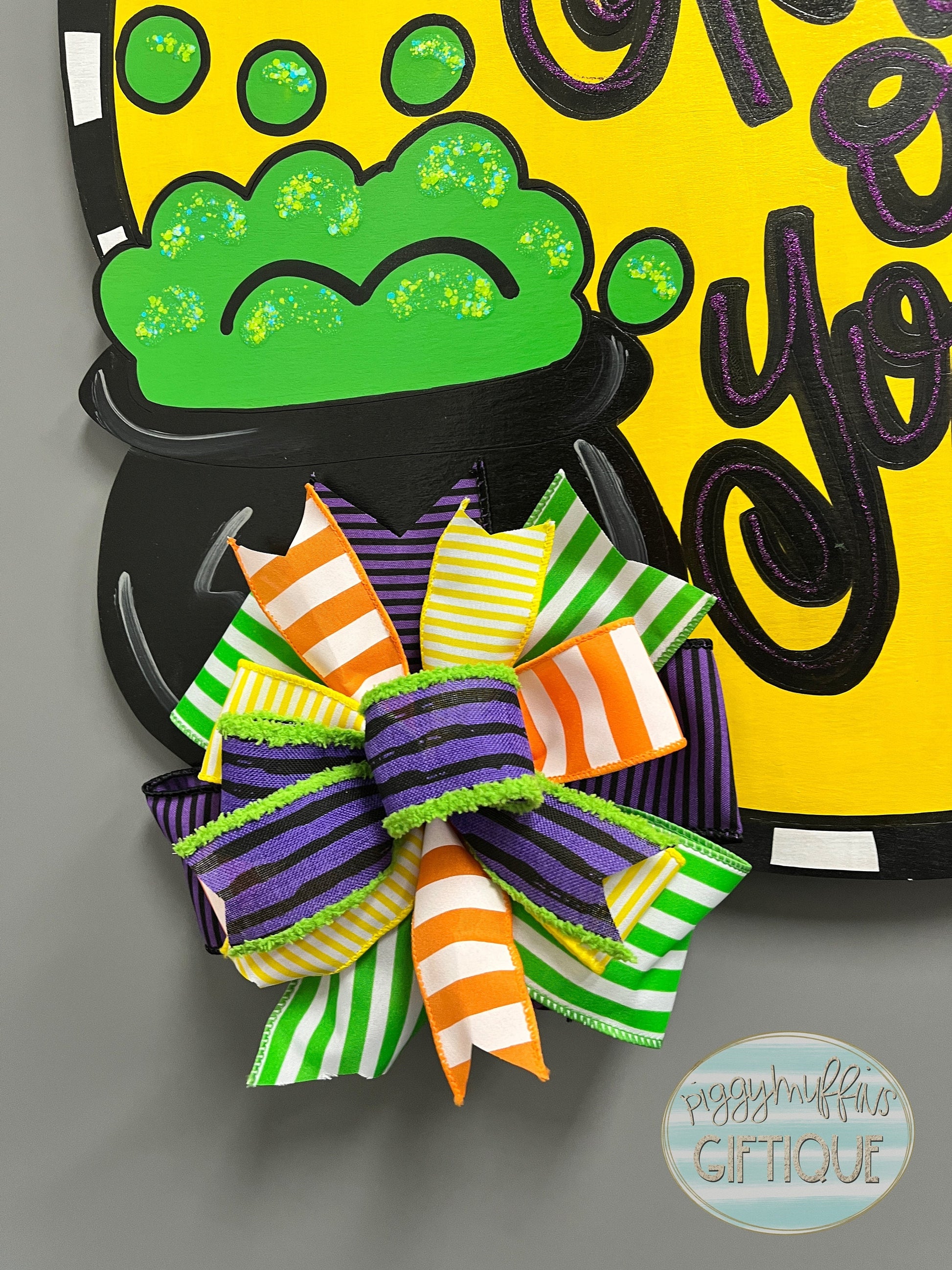 This adorable Halloween witch sisters door hanger by PIggyMuffins is perfect for the spooky season! Welcome your guests with this one of a kind Halloween decor! This sign measures approximately 21 inches in length and 21 inches in width. This sign is hand cut out of 1/4 inch board, sanded and painted with acrylic paint and accented with polyester glitter. It is sealed with a clear protective coating that prevents chipping, peeling, fading, or yellowing. It includes a sturdy wire hanger and coordinating beads, and is ready to hang when delivered. A coordinating bow can be added for an additional charge by choosing the "With Bow" option at checkout.