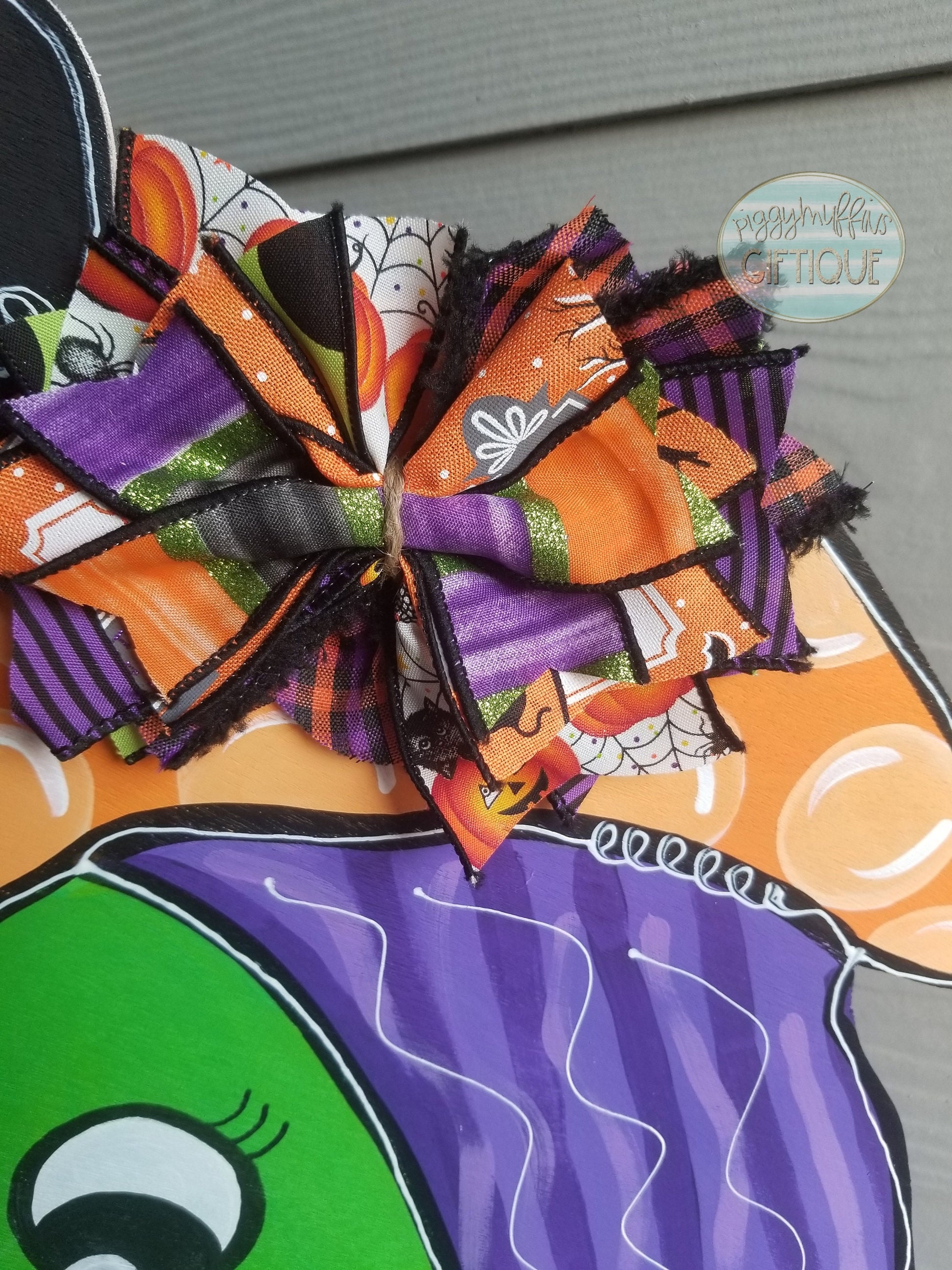 Welcome your guests this spooky season with this Whimsical Witch door hanger by PiggyMuffins. The Halloween sign measures approximately 21 inches in length and 21 inches in width. This sign is hand cut out of 1/4 inch board, sanded and painted with acrylic paint and accented with polyester glitter. It is sealed with a clear protective coating that prevents chipping, peeling, fading, or yellowing. It includes a sturdy wire hanger and coordinating beads, and is ready to hang when delivered. A coordinating bow can be added for an additional charge by choosing the "With Bow" option at checkout.