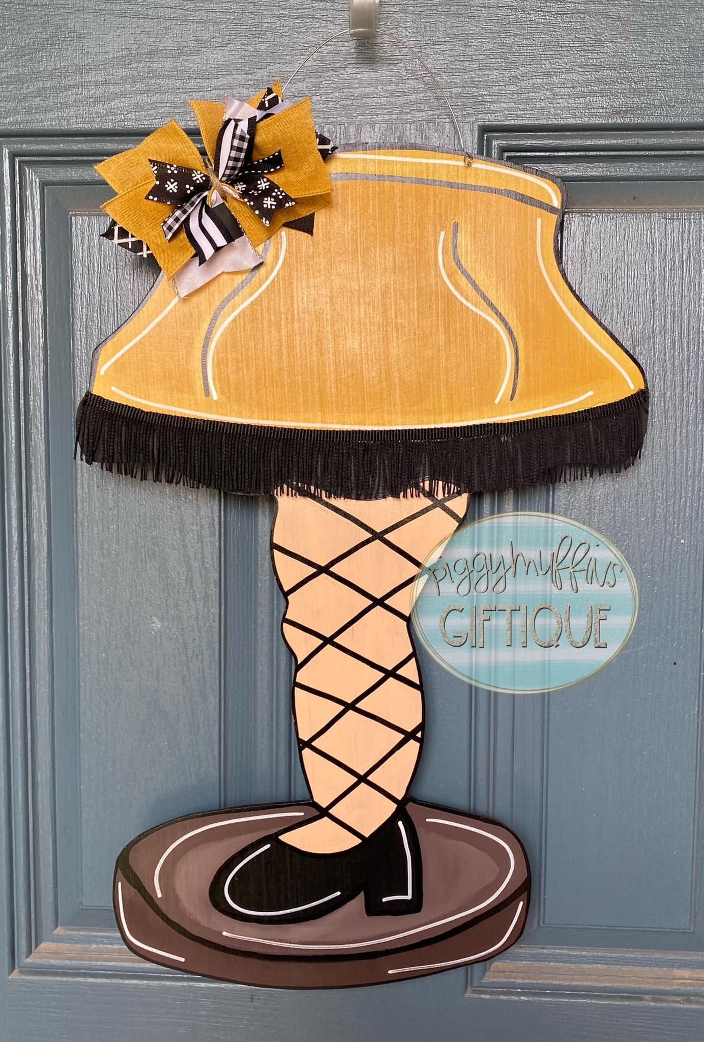 Welcome your guests to all of your Christmas celebrations and be the envy of your neighborhood with this adorable leg lamp door hanger from PiggyMuffins! This Holiday Door Hanger measures approximately 24 inches in length and 18 inches in width. This sign is hand cut out of 1/4 inch board, sanded and painted with acrylic paint and accented with polyester glitter. It is sealed with a clear protective coating that prevents chipping, peeling, fading, or yellowing. It includes a sturdy wire hanger and coordinating beads and is ready to hang when delivered. A coordinating bow can be added for an additional charge by choosing the "With Bow" option at checkout.