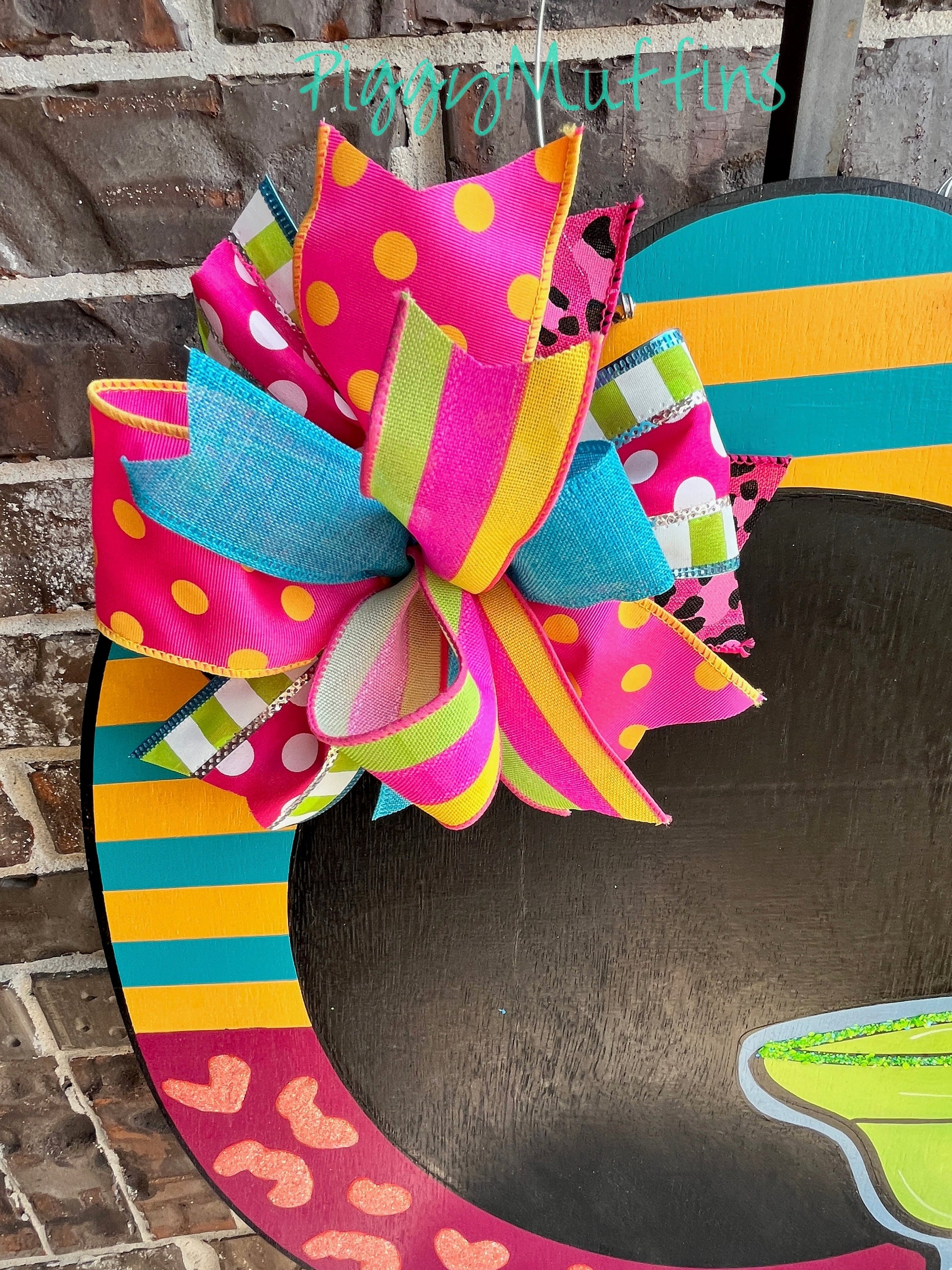 Dress up your front door or patio for summer with this fun, bright margarita door hanger by PiggyMuffins! Personalize it with your favorite phrase, initial, or family name for the perfect touch! This Summer Door Hanger measures approximately 22 inches in length and 22 inches in width. This sign is cut out of 1/4 inch birch, sanded and painted with acrylic paint and accented with a polyester glitter "salt rim". It is sealed with a clear protective coating that prevents chipping, peeling, fading, or yellowing. It includes a sturdy wire hanger with coordinating beads and is ready to hang when delivered. A coordinating bow can be added for an additional charge by choosing the "With Bow" option at checkout.