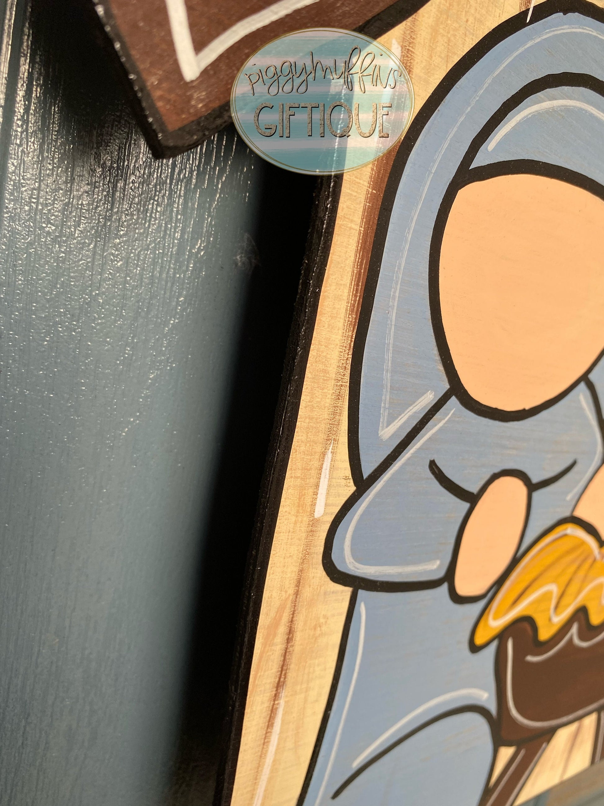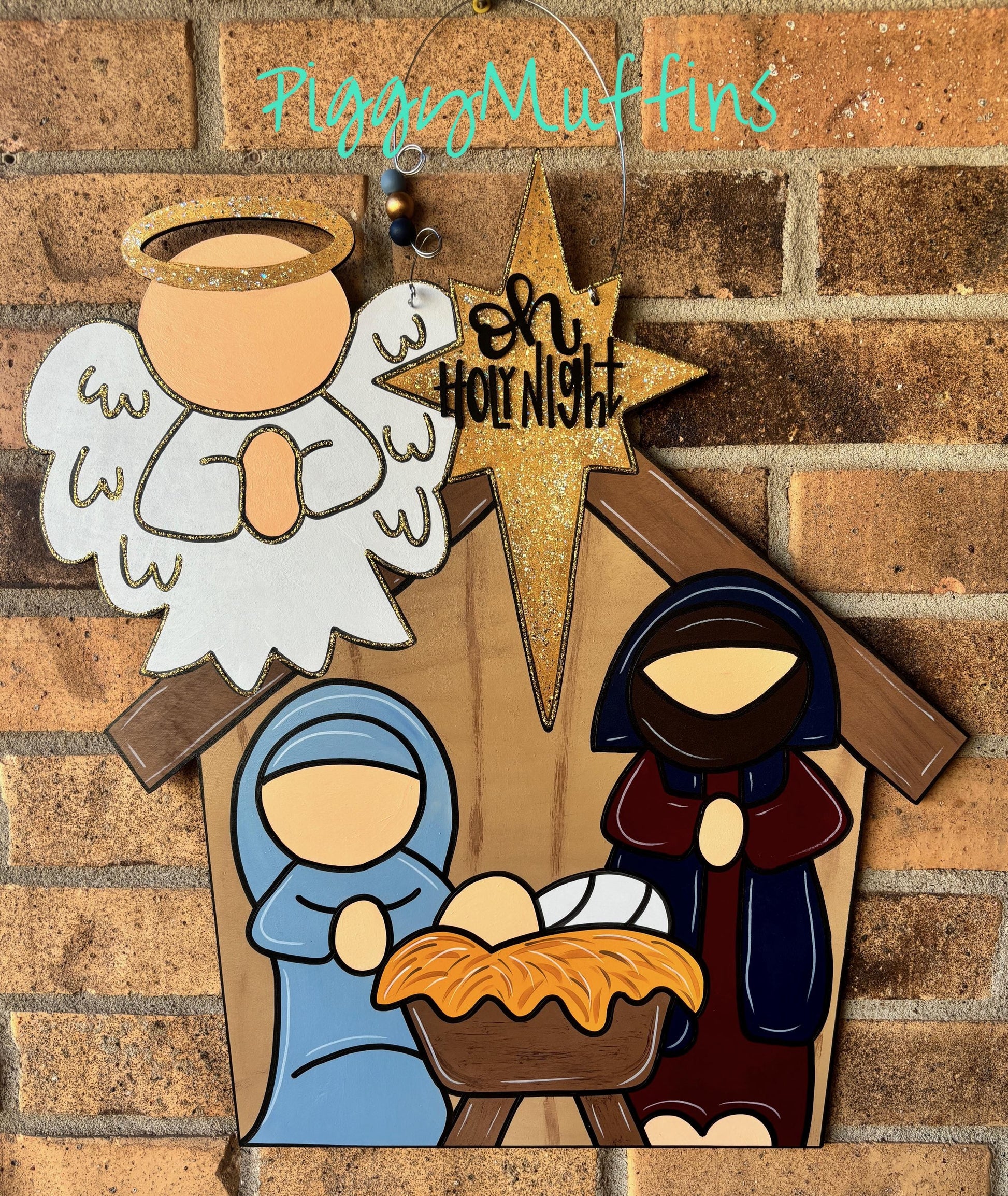 Welcome your guests to all of your Christmas celebrations and be the envy of your neighborhood with this beautiful nativity door hanger! Celebrate the night the angels declared Christ is Born. The sign measures approximately 22 inches in length and 22 inches in width. This sign is hand cut out of 1/4 inch board, sanded and painted with acrylic paint and accented with polyester glitter. It is sealed with a clear protective coating that prevents chipping, peeling, fading, or yellowing. It includes a sturdy wire hanger and coordinating bow and is ready to hang when delivered.