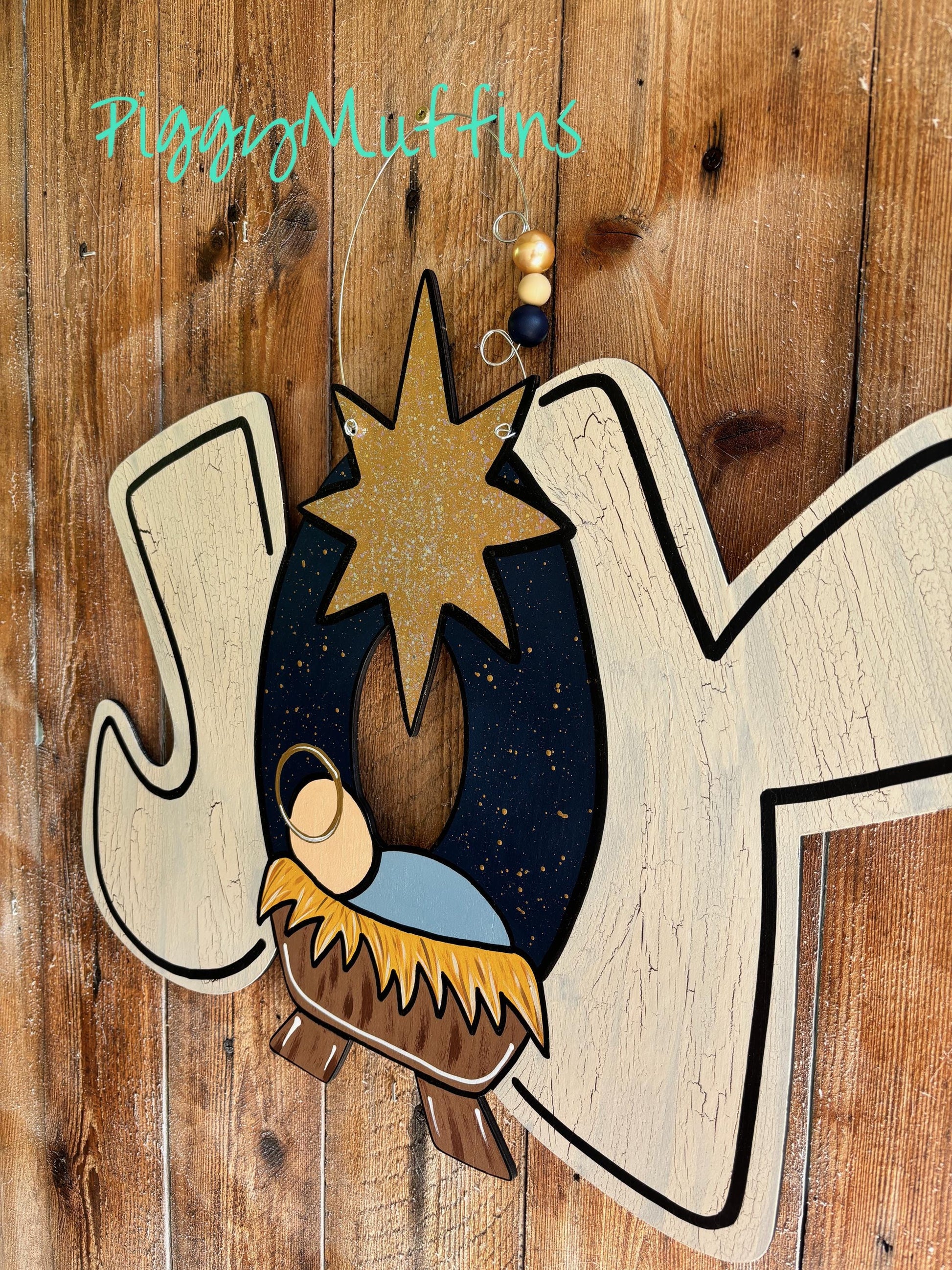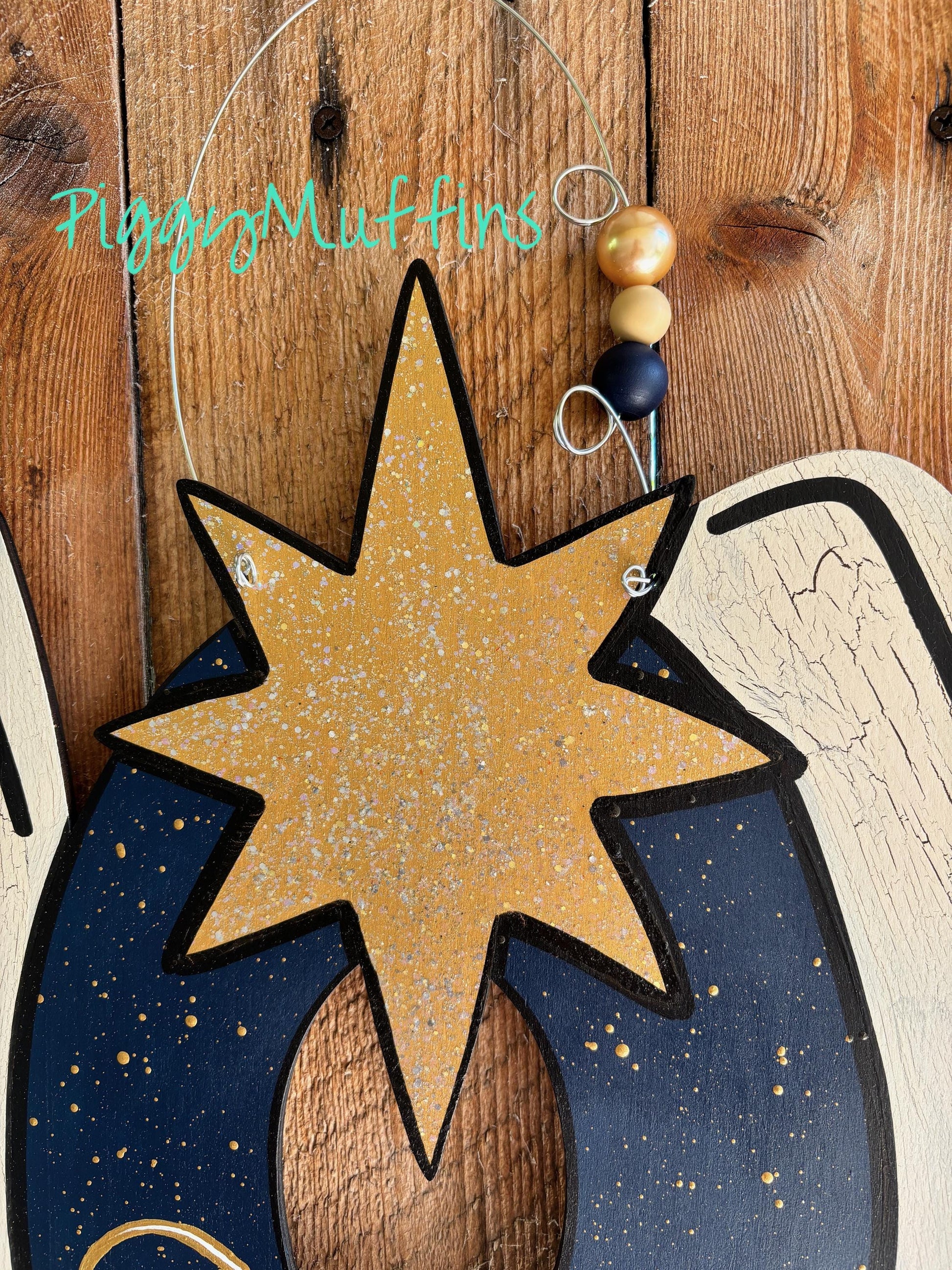 Welcome your guests to all of your Christmas celebrations and be the envy of your neighborhood with this beautiful nativity door hanger by PiggyMuffins! This Christmas Door Hanger celebrating Baby Jesus measures approximately 20 inches in length and 22 inches in width. This sign is hand cut out of 1/4 inch board, sanded and painted with acrylic paint and accented with polyester glitter. It is sealed with a clear protective coating that prevents chipping, peeling, fading, or yellowing. It includes a sturdy wire hanger with coordinating beads and is ready to hang when delivered.