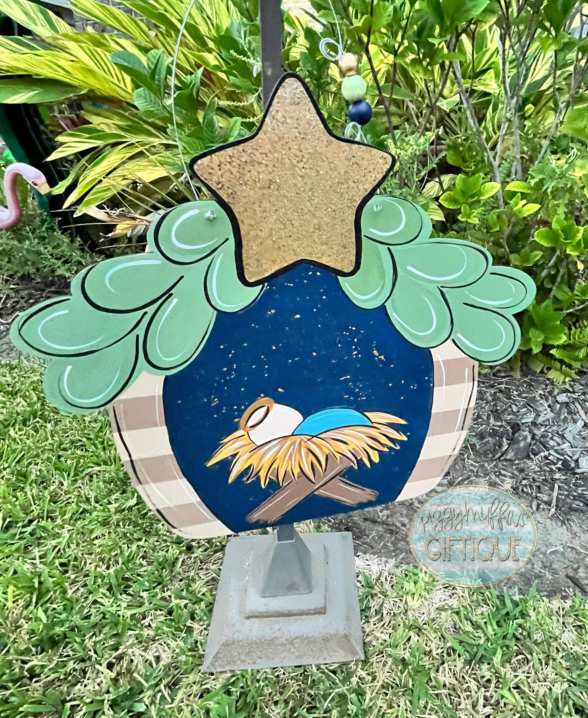 Welcome your guests to all of your Christmas celebrations and be the envy of your neighborhood with this beautiful nativity door hanger from PIggyMuffins! Choose your option with or without wording for the perfect holiday decoration. This Christmas Door Hanger measures approximately 21 inches in length and 21 inches in width. This sign is hand cut out of 1/4 inch board, sanded and painted with acrylic paint and accented with polyester glitter. It is sealed with a clear protective coating that prevents chipping, peeling, fading, or yellowing. It includes a sturdy wire hanger with coordinating beads and is ready to hang when delivered.