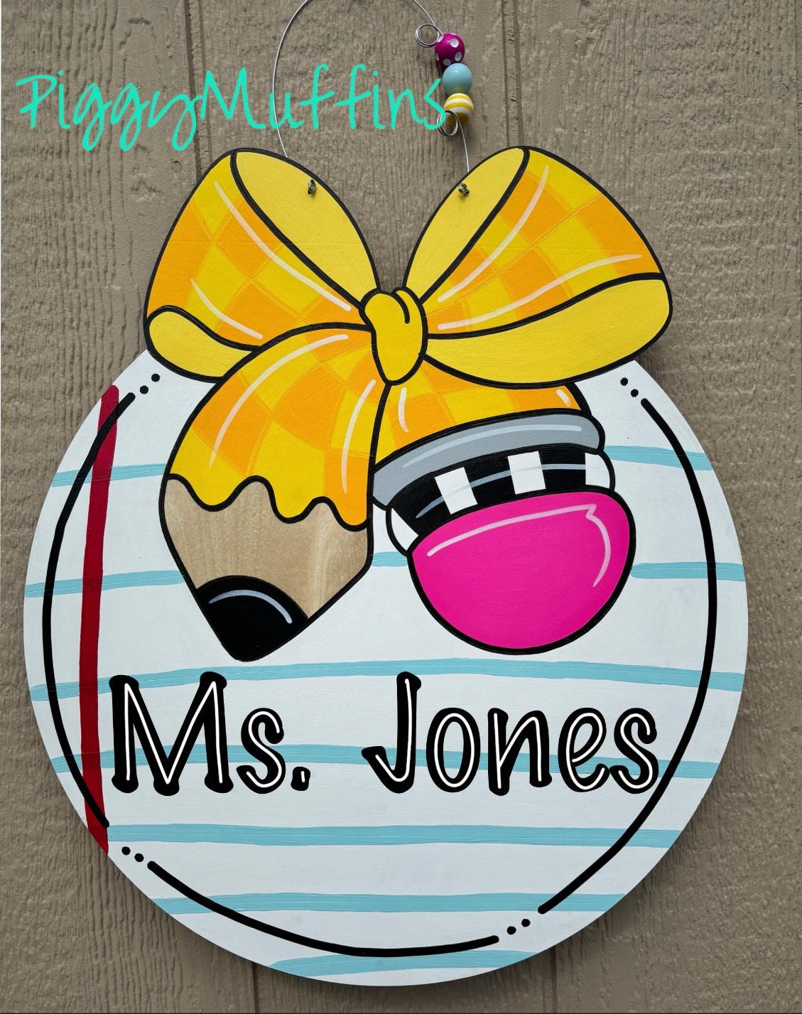 The adorable pencil bow door hanger by PiggyMuffins is the perfect way to welcome your students and guests to your classroom this school year! This teacher door hanger is laser cut out of 1/4 inch board and painted with acrylic paint. It is sealed with a clear protective coating that prevents chipping, peeling, fading, or yellowing. It includes a sturdy wire hanger and coordinating beads and is ready to hang when delivered. A coordinating bow can be added to this pencil door hanger for an additional charge by choosing the "With Bow" option at checkout.
