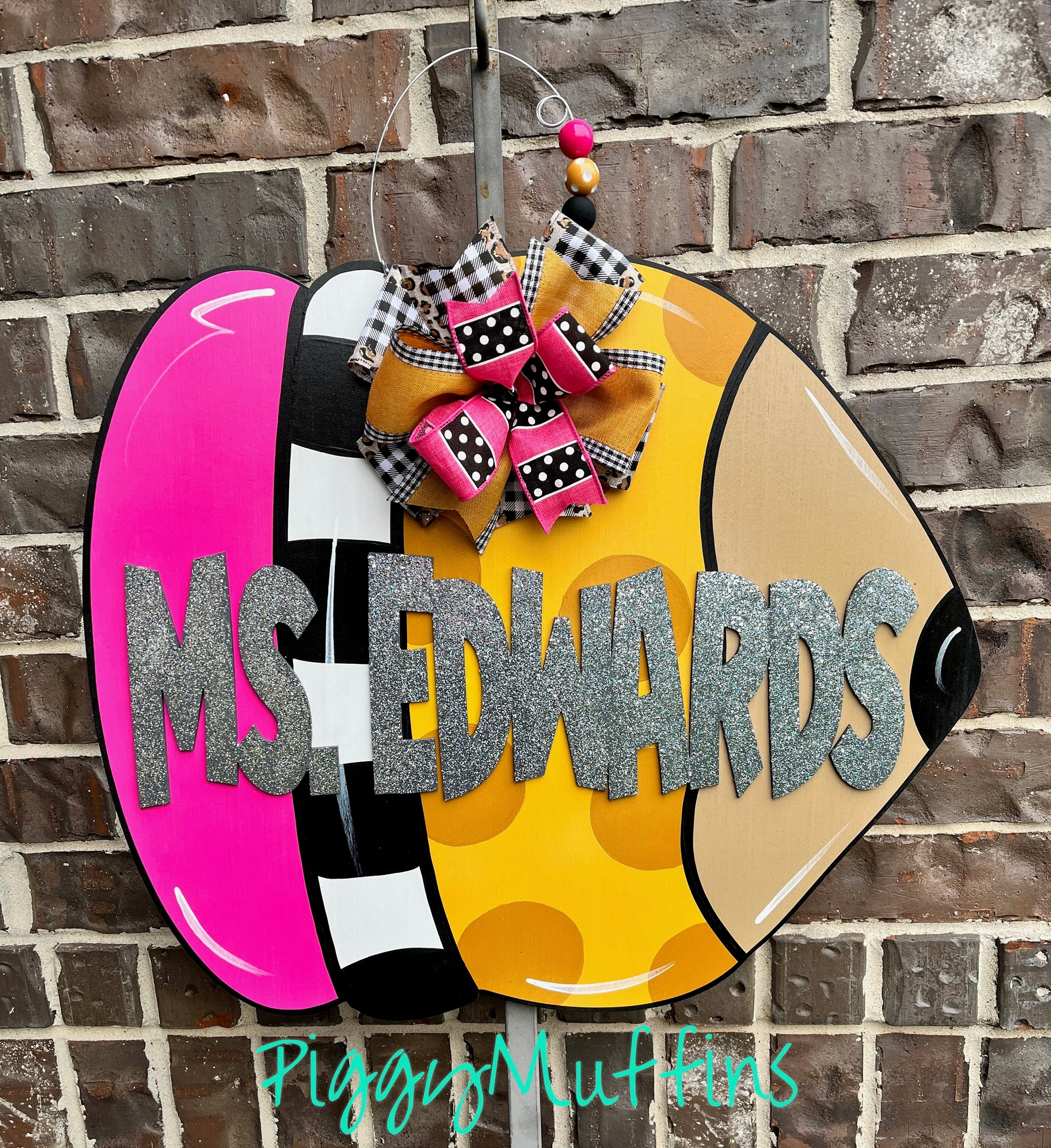 The adorable Pencil Door Hanger by PiggyMuffins is the perfect way to welcome your students and guests to your classroom this fall! This Teacher Door Hanger is laser cut out of 1/4 inch board and painted with acrylic paint and accented with polyester glitter. It is sealed with a clear protective coating that prevents chipping, peeling, fading, or yellowing. It includes a sturdy wire hanger and coordinating beads and is ready to hang when delivered. A coordinating bow can be added for an additional charge by choosing the "With Bow" option at checkout.
