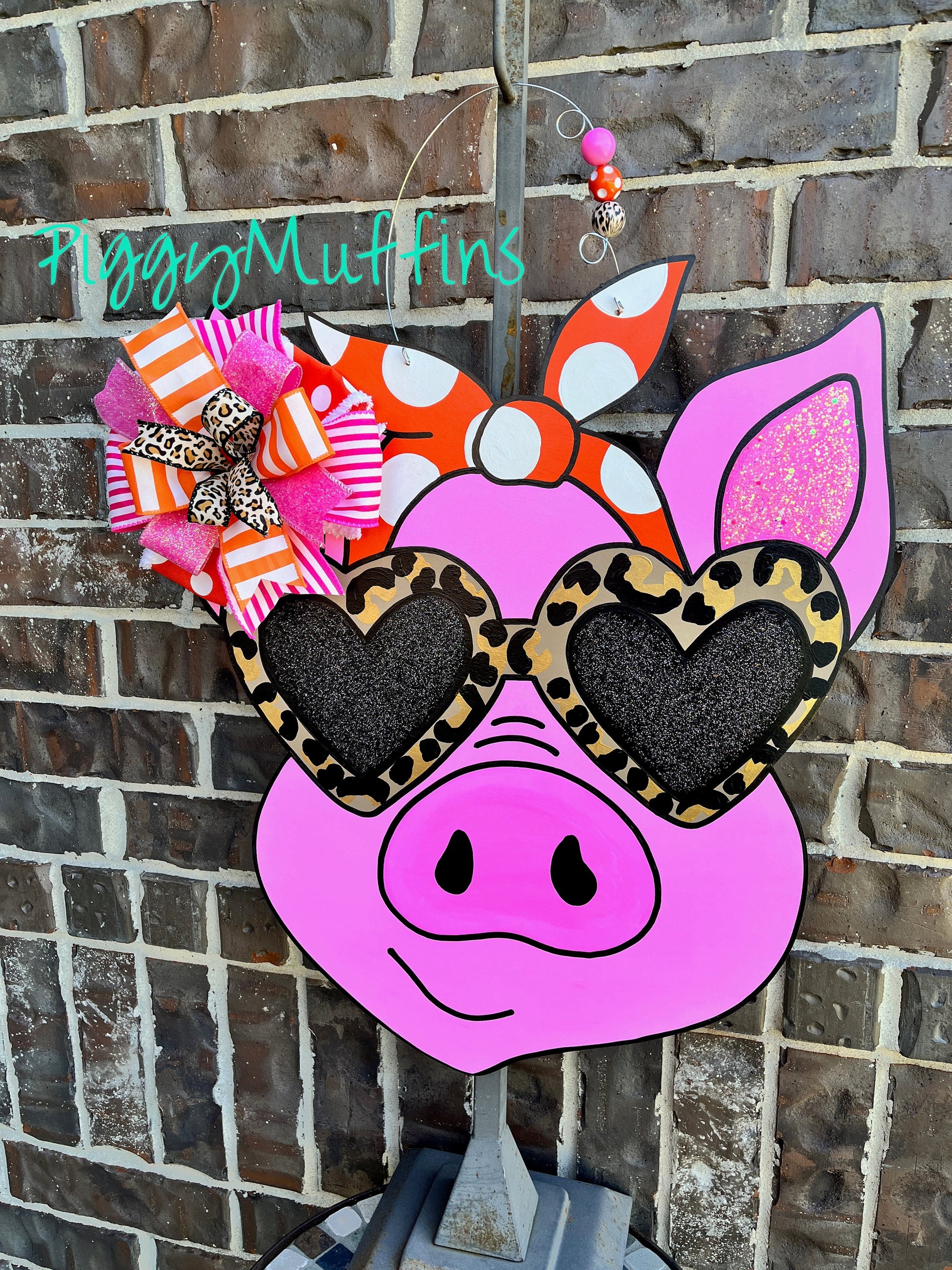 This adorable piggy door hanger makes a wonderful gift! Personalize with the perfect saying for the cutest customized accessory! This sign is cut out of 1/4 inch board, sanded and painted with acrylic paint. It is sealed with a clear protective coating that prevents chipping, peeling, fading, or yellowing. It includes a sturdy wire hanger and coordinating beads and is ready to hang when delivered. A coordinating bow can be added for an additional charge at checkout.
