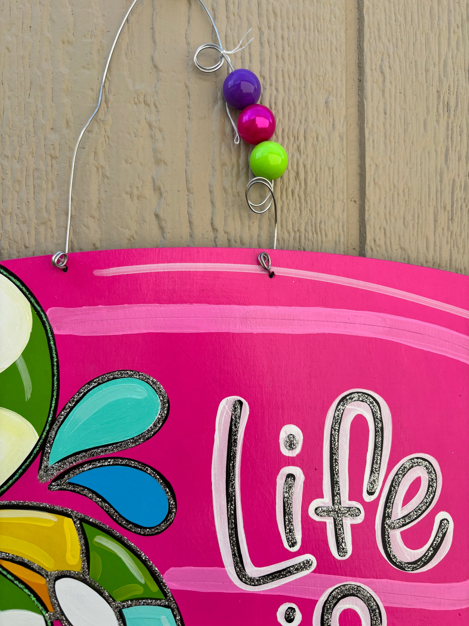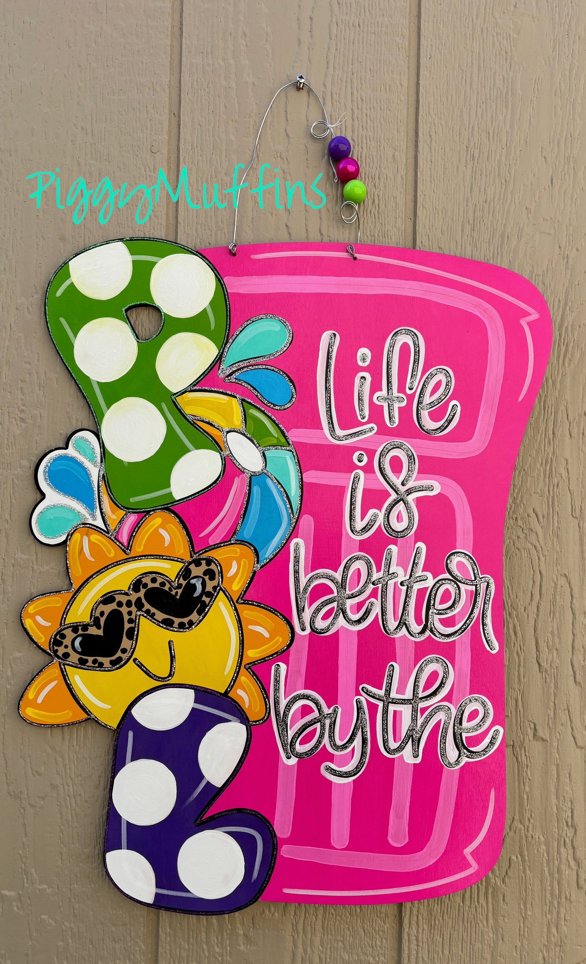 Welcome your guests to some fun in the sun with this gorgeous pool door hanger by PiggyMuffins! How adorable would this be hanging on your front door, patio or beach house this summer? This pool sign is an eye catcher for sure!! This summer door hanger is cut out of 1/4 inch board, sanded and painted with acrylic paint. It is sealed with a clear protective coating that prevents chipping, peeling, fading, or yellowing. It includes a sturdy wire hanger and coordinating beads and is ready to hang when delivered. A coordinating bow can be added for an additional charge by choosing the "With Bow" option at checkout.