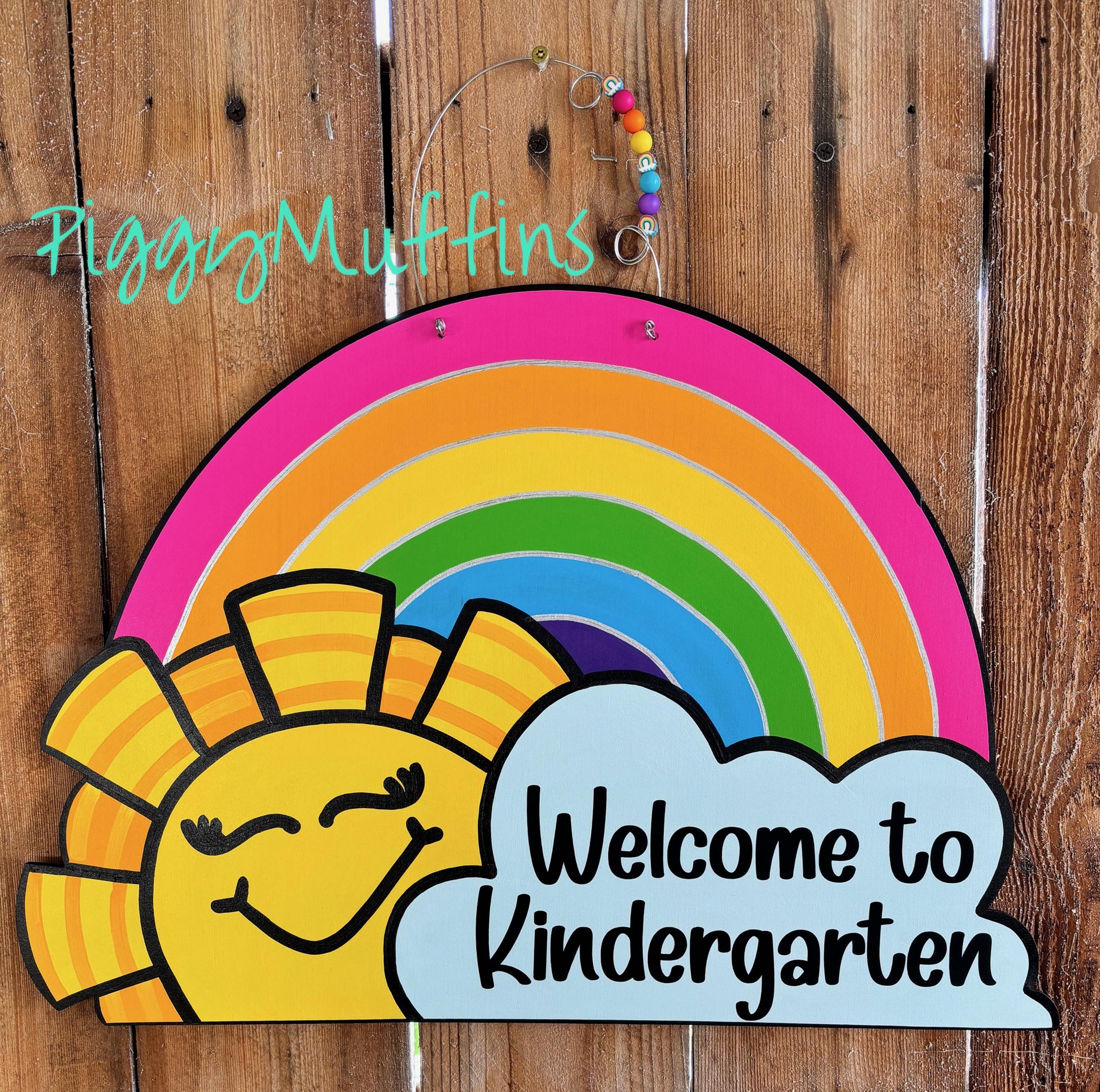 The cute sunshine and rainbow teacher door hanger is the perfect way to welcome your guests! It makes an adorable classroom sign for teachers as well. Painted with bright colors that pop, this sign is laser cut out of 1/4 inch board and painted with acrylic paint and accented with polyester glitter. It is sealed with a clear protective coating that prevents chipping, peeling, fading, or yellowing. It includes a sturdy wire hanger and coordinating beads and is ready to hang when delivered. A coordinating bow can be added for an additional charge by choosing the "With Bow" option at checkout.