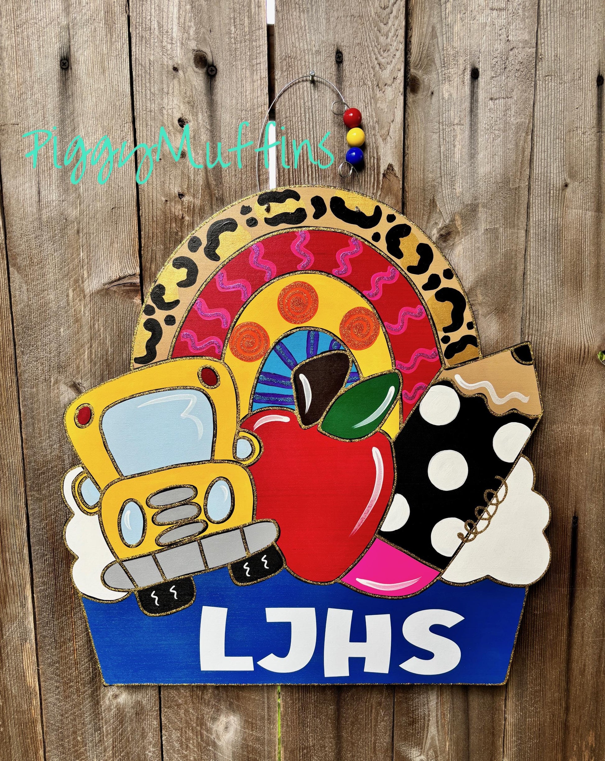 The adorable rainbow teacher door hanger by PiggyMuffins is the perfect way to welcome your students and guests to your classroom this fall! This Classroom door hanger is laser cut out of 1/4 inch board and painted with acrylic paint and accented with polyester glitter. It is sealed with a clear protective coating that prevents chipping, peeling, fading, or yellowing. It includes a sturdy wire hanger and coordinating beads and is ready to hang when delivered. A coordinating bow can be added for an additional charge by choosing the "With Bow" option at checkout.