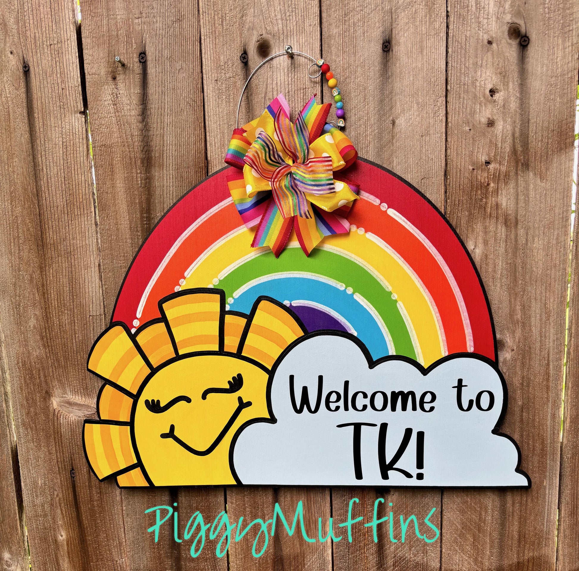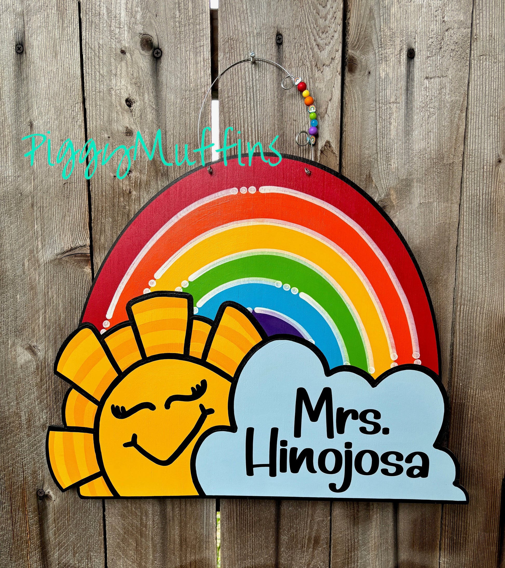 The cute sunshine and rainbow of traditional colors door hanger from PiggyMuffins is the perfect way to welcome your guests! It makes an adorable classroom door hanger for teachers as well. This Teacher Door Sign is laser cut out of 1/4 inch board and painted with acrylic paint and accented with polyester glitter. It is sealed with a clear protective coating that prevents chipping, peeling, fading, or yellowing. It includes a sturdy wire hanger and coordinating beads and is ready to hang when delivered. A coordinating bow can be added for an additional charge by choosing the "With Bow" option at checkout.