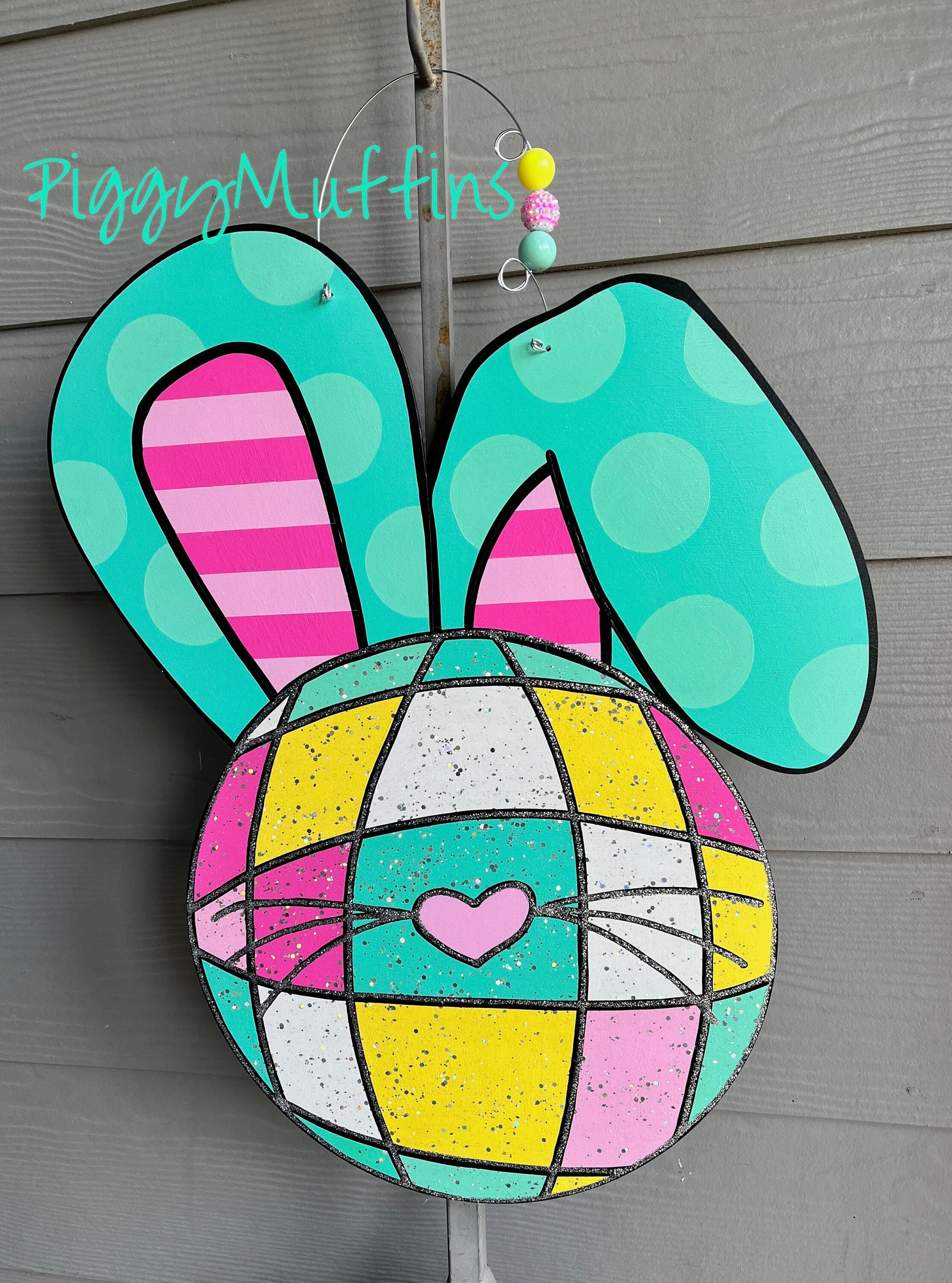 Welcome spring with this adorable bunny door hanger by PiggyMuffins! This Disco Ball Bunny door sign measures approximately 22 inches in length and 22 inches in width. This sign is cut out of 1/4 inch board, sanded and painted with acrylic paint and accented with polyester glitter. It is sealed with a clear protective coating that prevents chipping, peeling, fading, or yellowing. It includes a sturdy wire hanger and coordinating and is ready to hang when delivered.