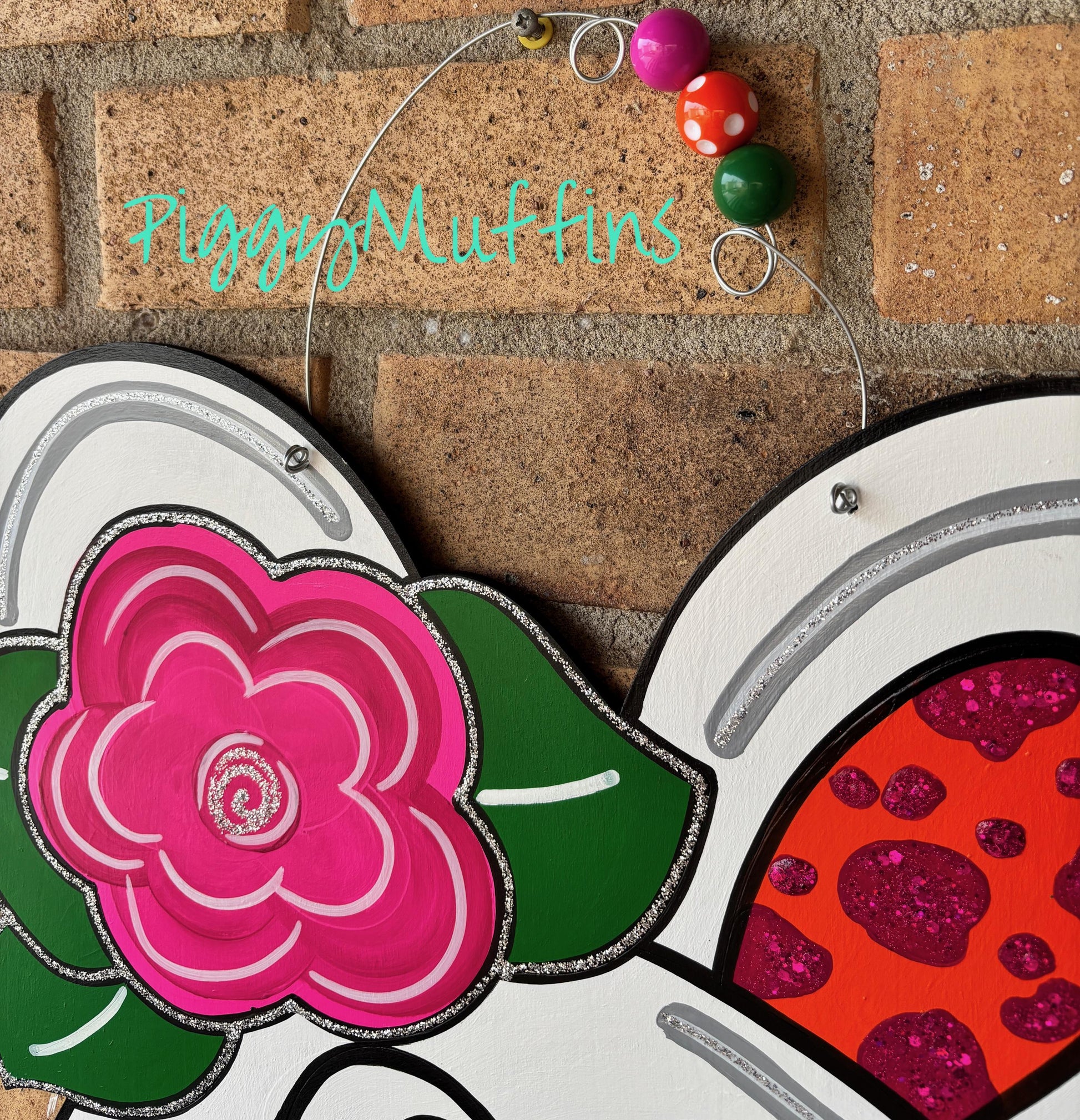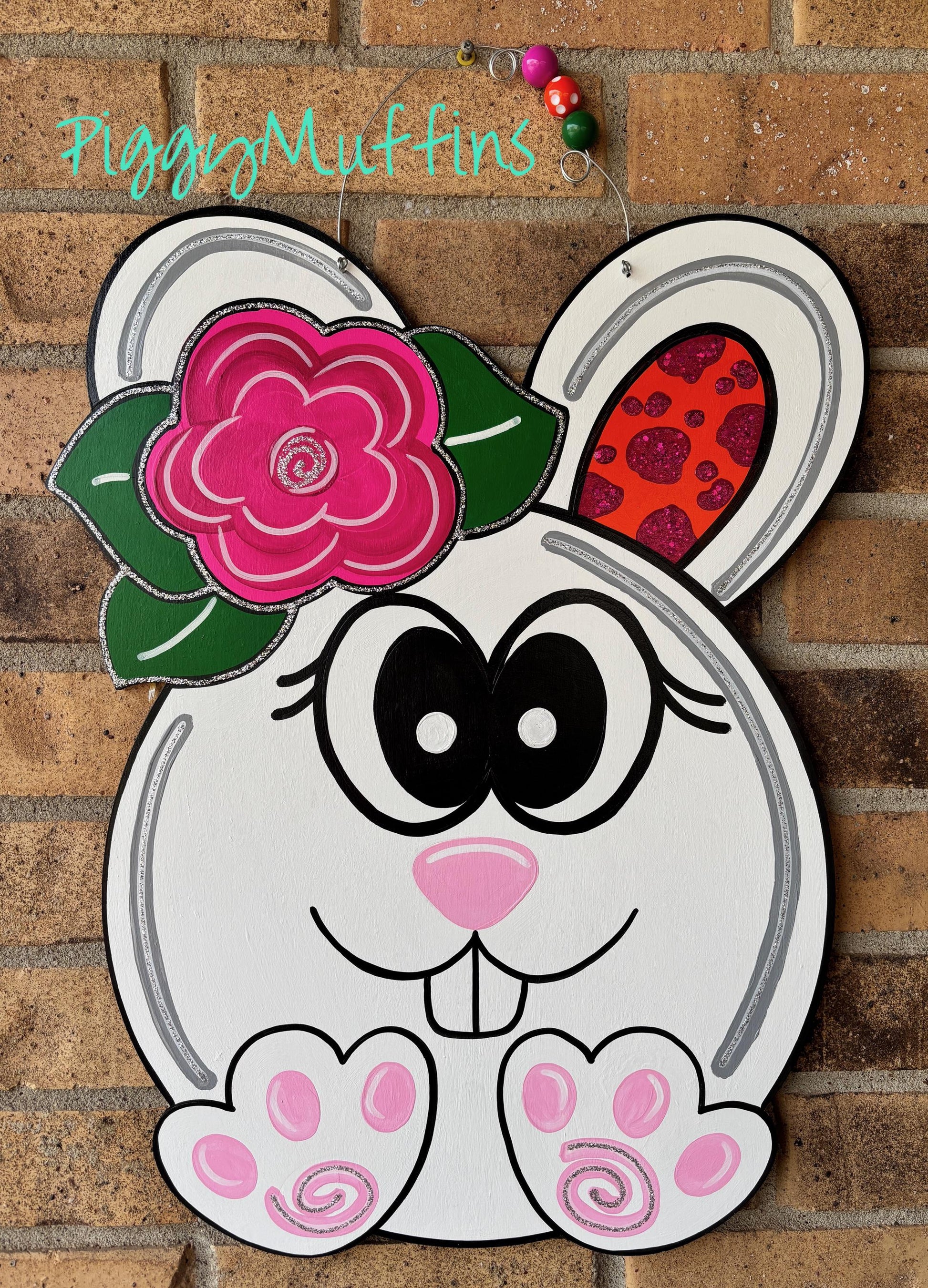 SHIPS TODAY! Welcome spring with this adorable bunny door hanger by PiggyMuffins! This Easter Bunny Door Hanger measures approximately 22 inches in length and 22 inches in width. This sign is cut out of 1/4 inch board, sanded and painted with acrylic paint and accented with polyester glitter. It is sealed with a clear protective coating that prevents chipping, peeling, fading, or yellowing. It includes a sturdy wire hanger and coordinating and is ready to hang when delivered.