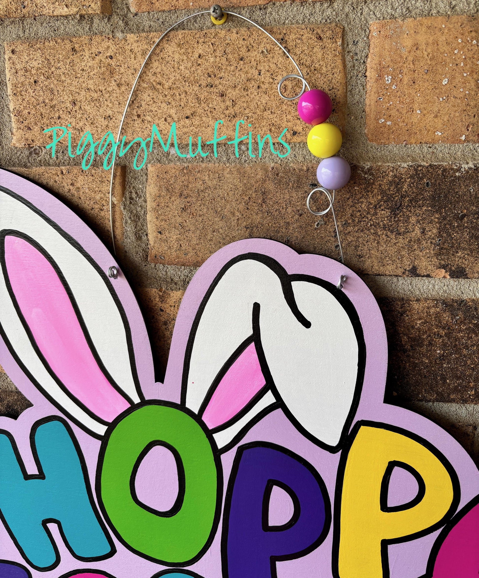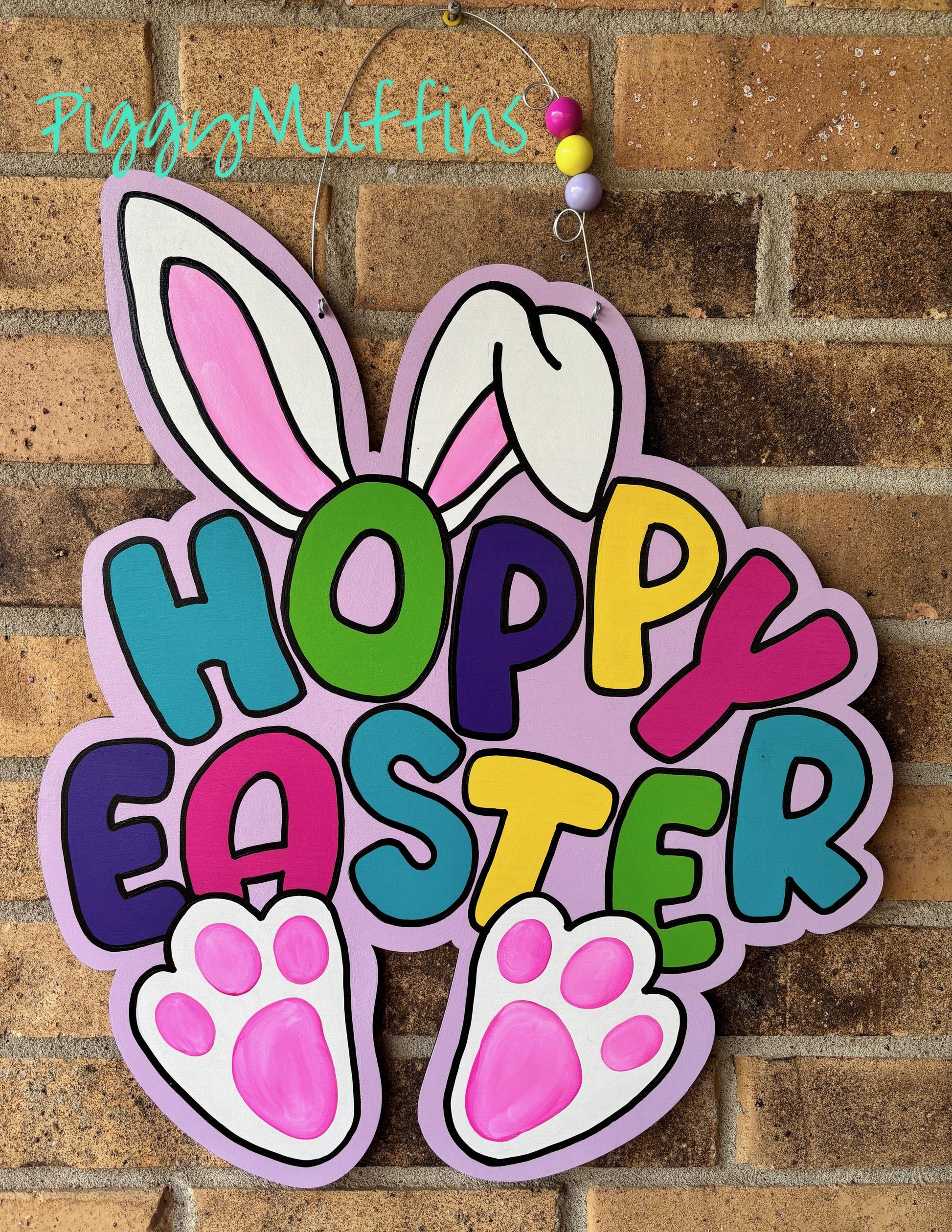 SHIPS TODAY! Welcome spring with this adorable bunny door hanger by PiggyMuffins! This Hoppy Easter Easter Bunny door hanger measures approximately 22 inches in length and 22 inches in width. This sign is cut out of 1/4 inch board, sanded and painted with acrylic paint and accented with polyester glitter. It is sealed with a clear protective coating that prevents chipping, peeling, fading, or yellowing. It includes a sturdy wire hanger and coordinating and is ready to hang when delivered.