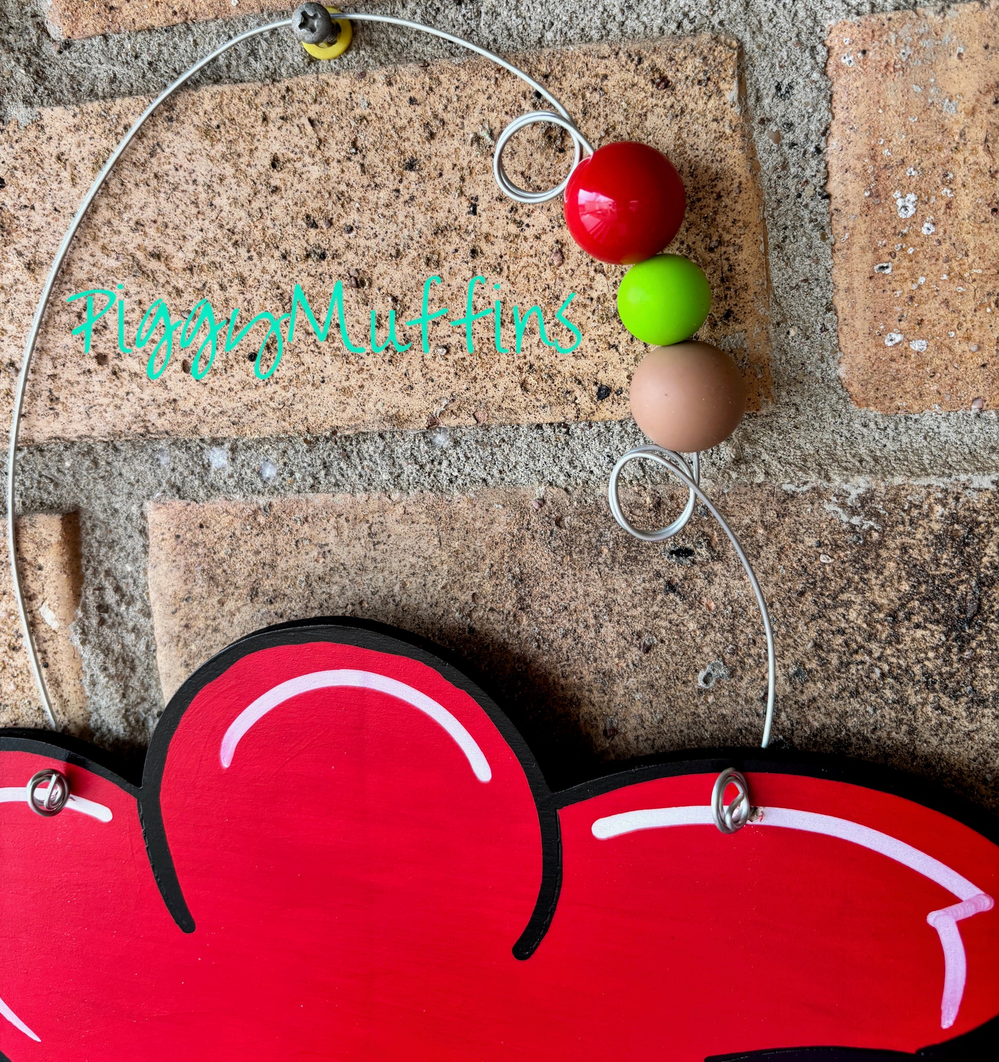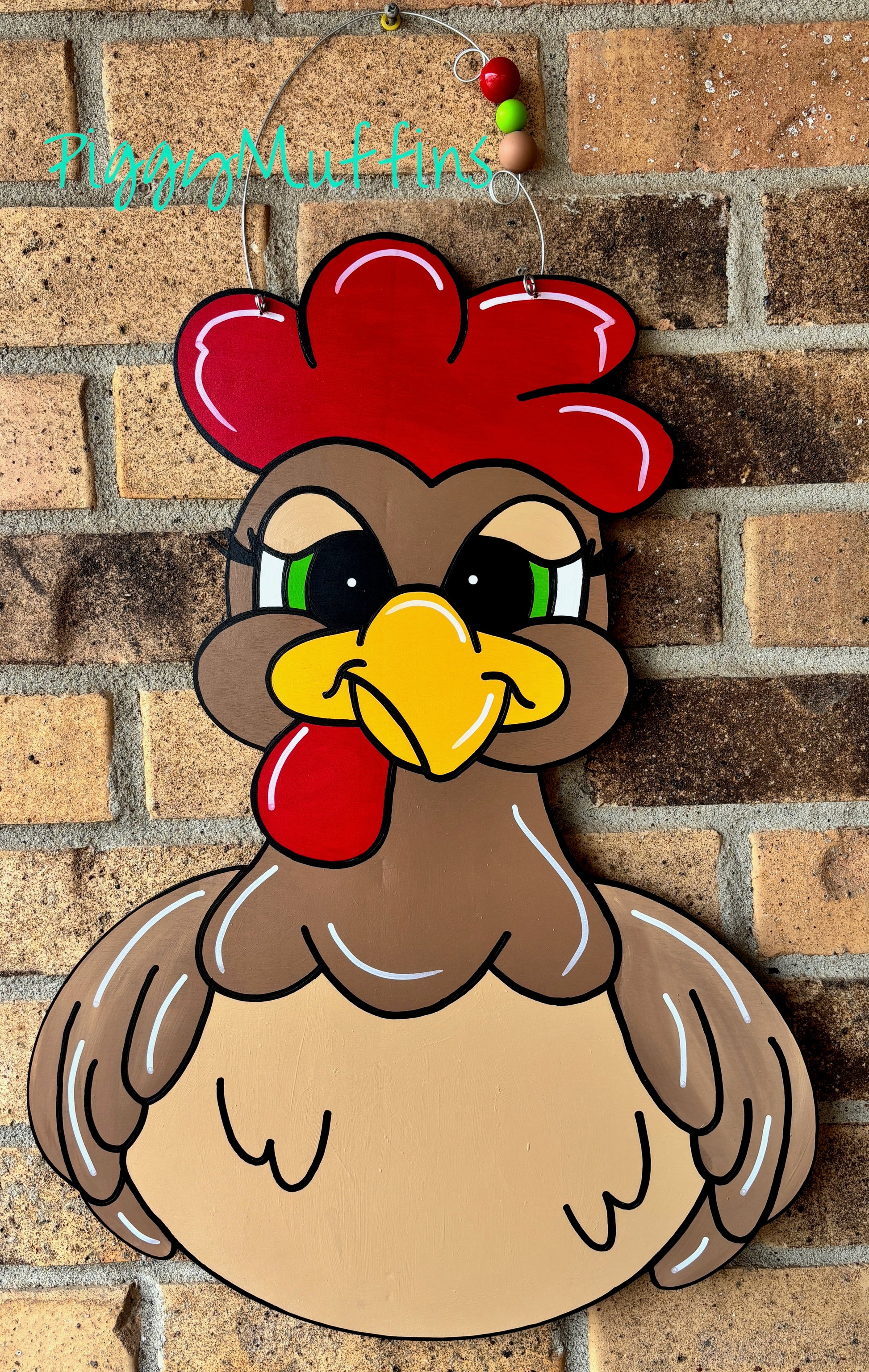 SHIPS TODAY! Welcome your guests with this adorable chick by PiggyMuffins! This Chicken Door Hanger is a great all occasion hanger and measures approximately 22 inches in length and 20 inches in width. This sign is cut out of 1/4 inch board, sanded and painted with acrylic paint and accented with polyester glitter. It is sealed with a clear protective coating that prevents chipping, peeling, fading, or yellowing. It includes a sturdy wire hanger and coordinating and is ready to hang when delivered.