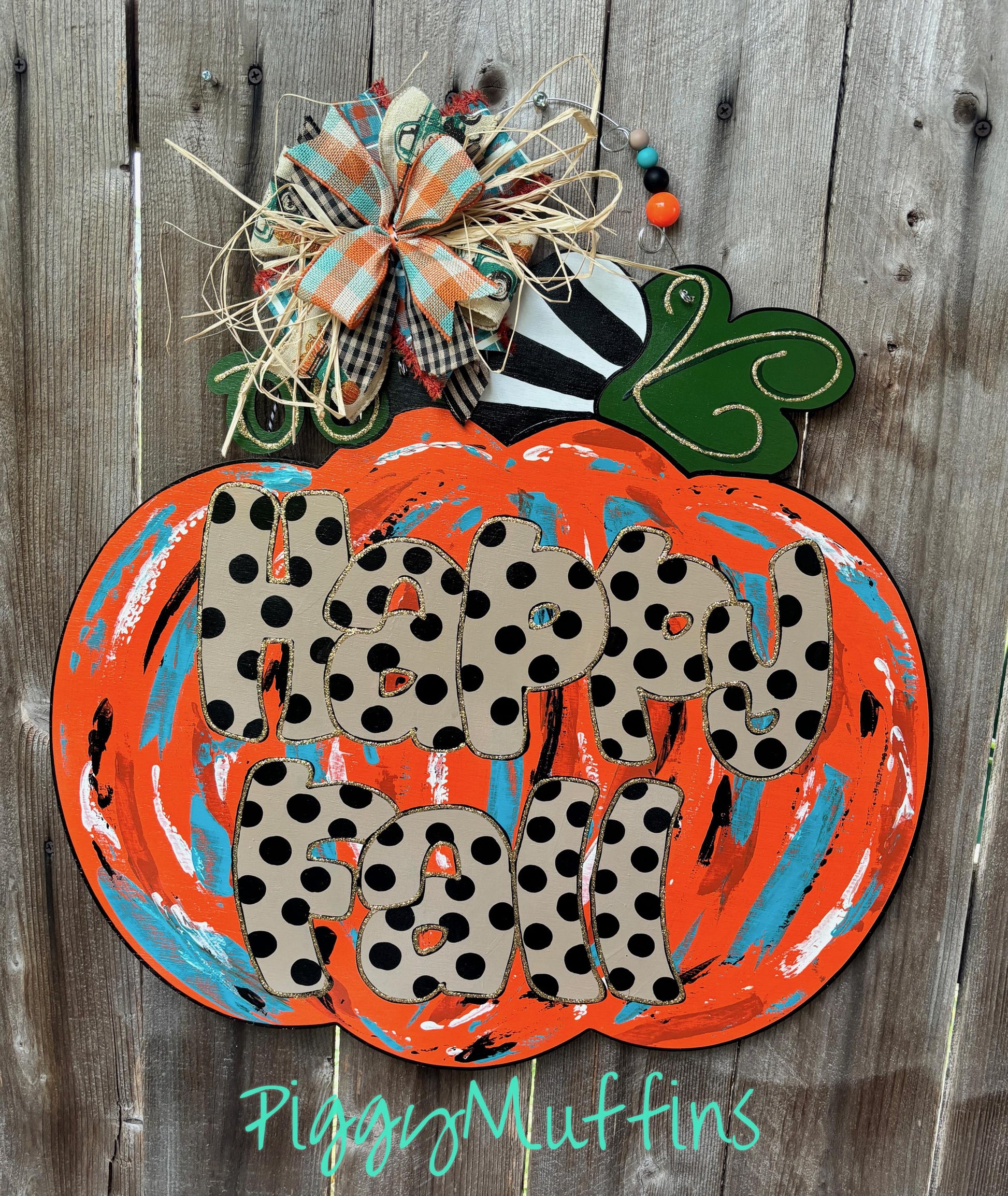 This colorful pumpkin door hanger by PiggyMuffins is perfect for the fall season! Welcome your guests with this one of a kind Fall door decor! This Happy Fall Door Hanger measures approximately 22 inches in width and 22 inches in length. This sign is cut out of 1/4 inch board, sanded and painted with acrylic paint. It is sealed with a clear protective coating that prevents chipping, peeling, fading, or yellowing. It includes a sturdy wire hanger and coordinating beads, and is ready to hang when delivered.
