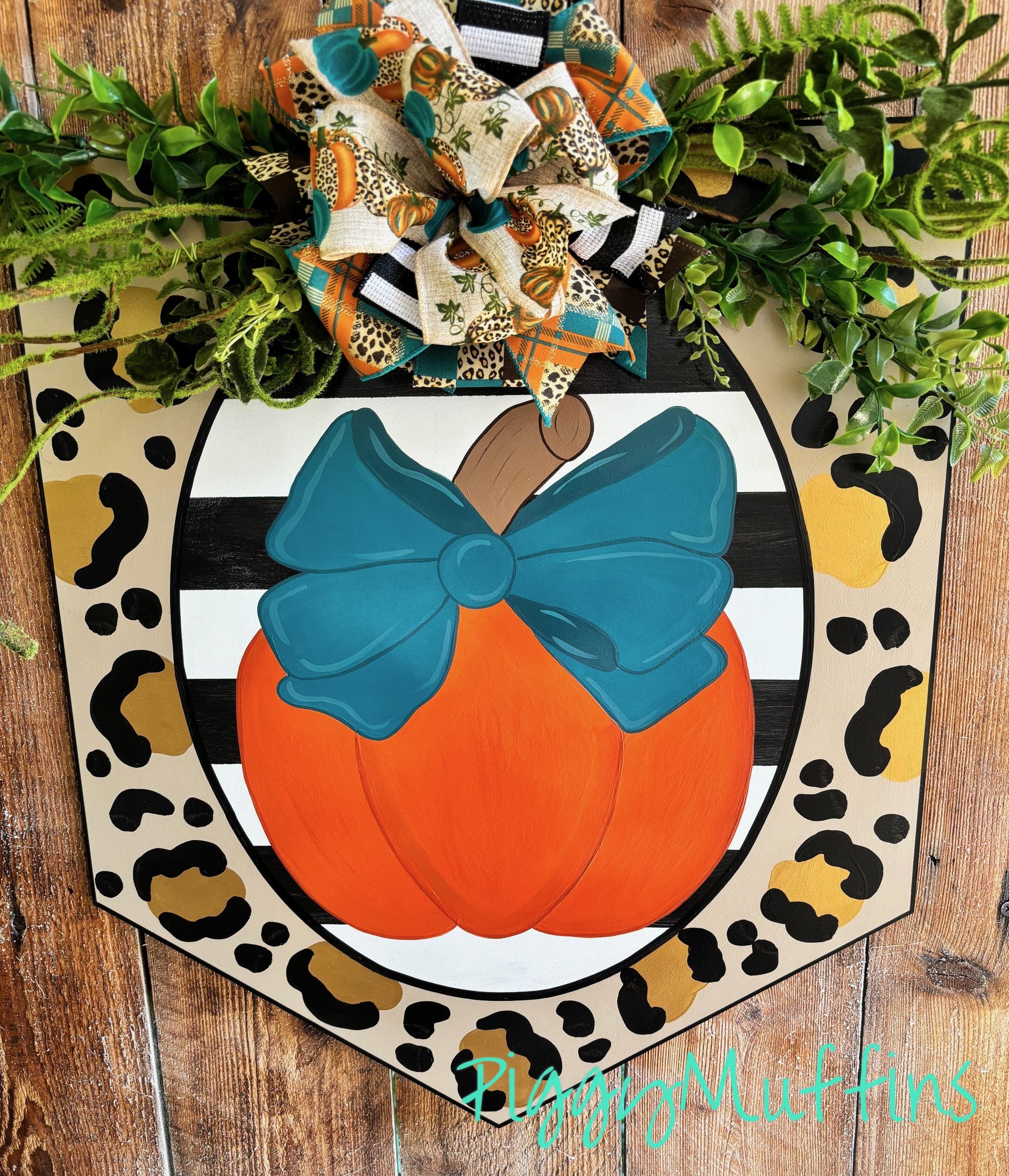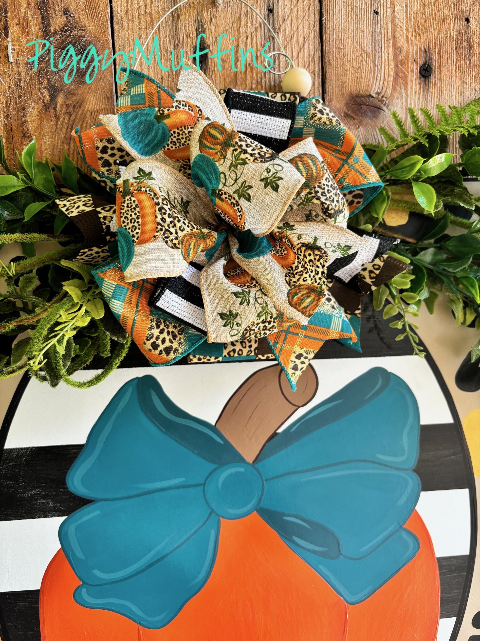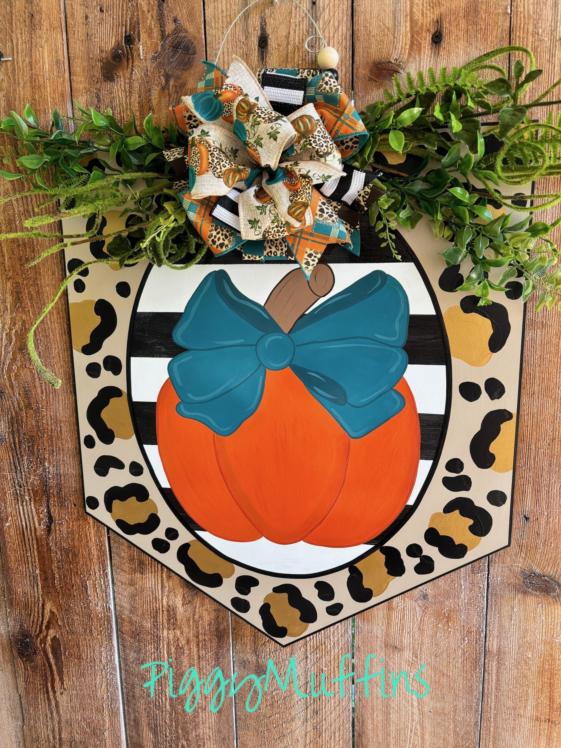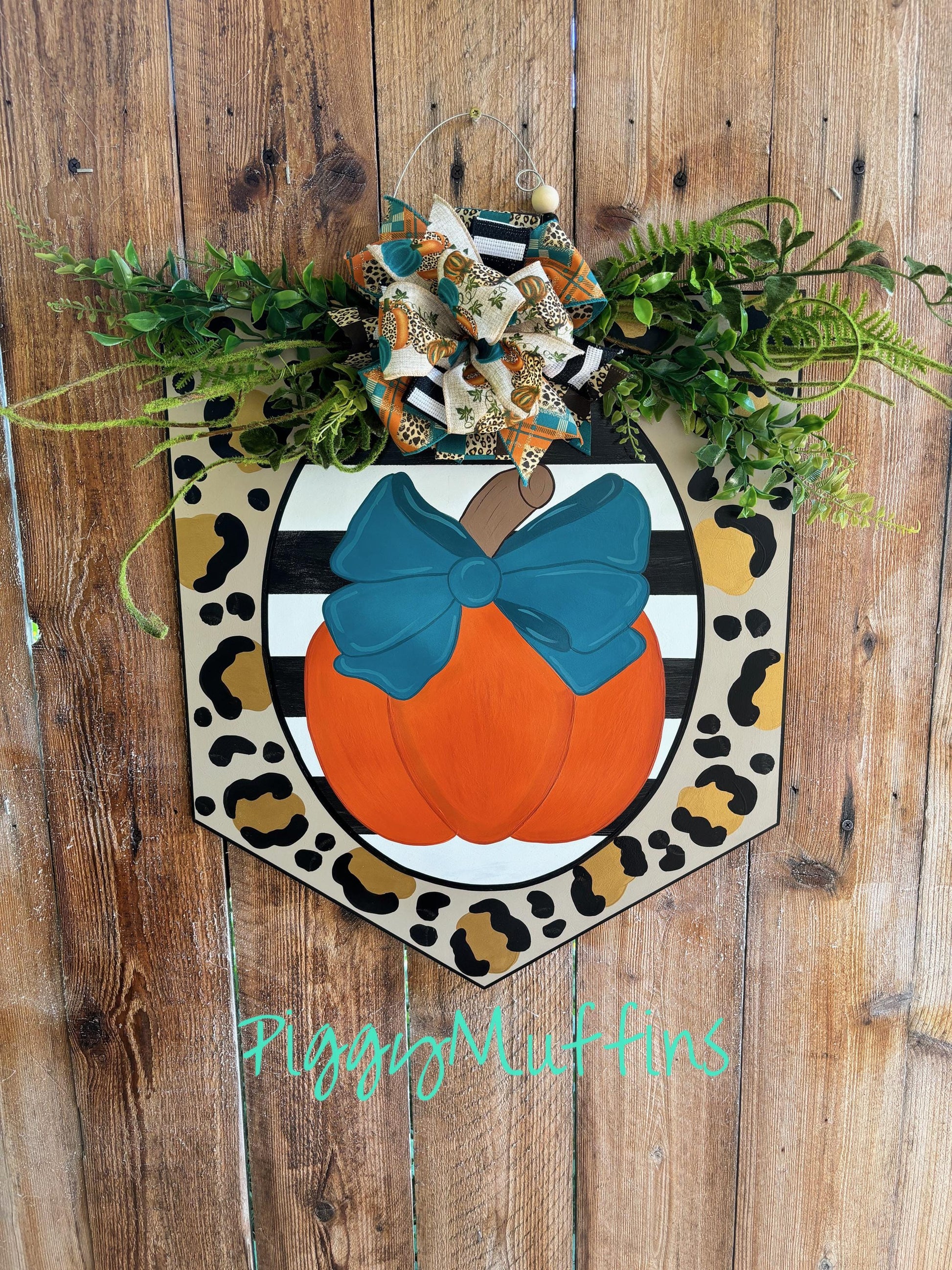 This gorgeous pumpkin door hanger by PiggyMuffins is perfect for the fall season! Welcome your guests with this one of a kind Fall door decor! This Thanksgiving door hanger measures approximately 22 inches in width and 22 inches in length. This sign is cut out of 1/4 inch board, sanded and painted with acrylic paint. It is sealed with a clear protective coating that prevents chipping, peeling, fading, or yellowing. It includes a sturdy wire hanger, greenery and coordinating bow and beads, and is ready to hang when delivered.