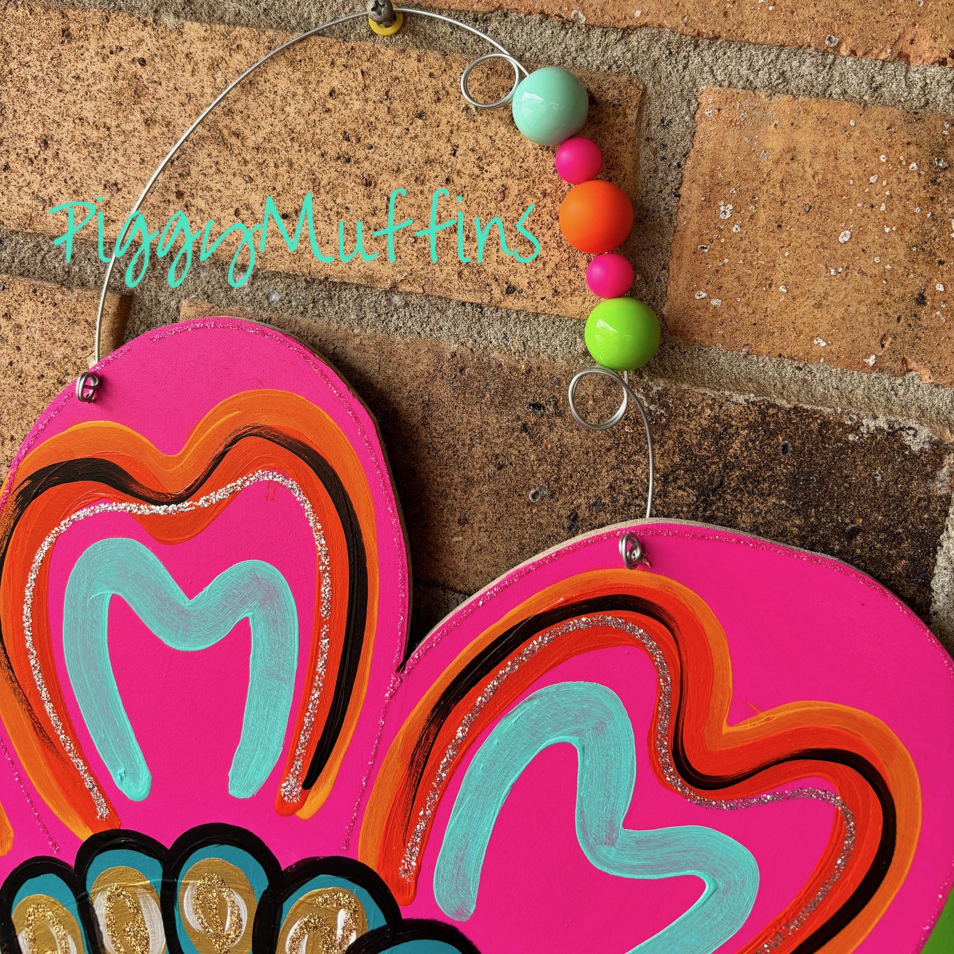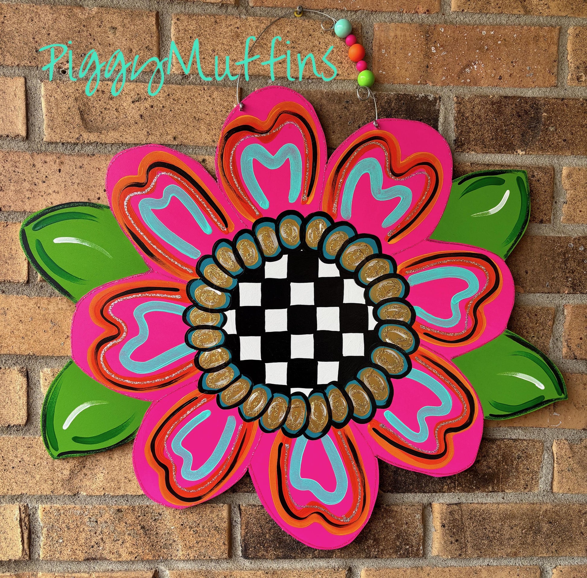 SHIPS TODAY! Welcome spring with this gorgeous flower door hanger by PiggyMuffins! This bright floral door hanger measures approximately 22 inches in length and 22 inches in width. This Spring door hanger is cut out of 1/4 inch board, sanded and painted with acrylic paint and accented with polyester glitter. It is sealed with a clear protective coating that prevents chipping, peeling, fading, or yellowing. It includes a sturdy wire hanger and coordinating and is ready to hang when delivered.